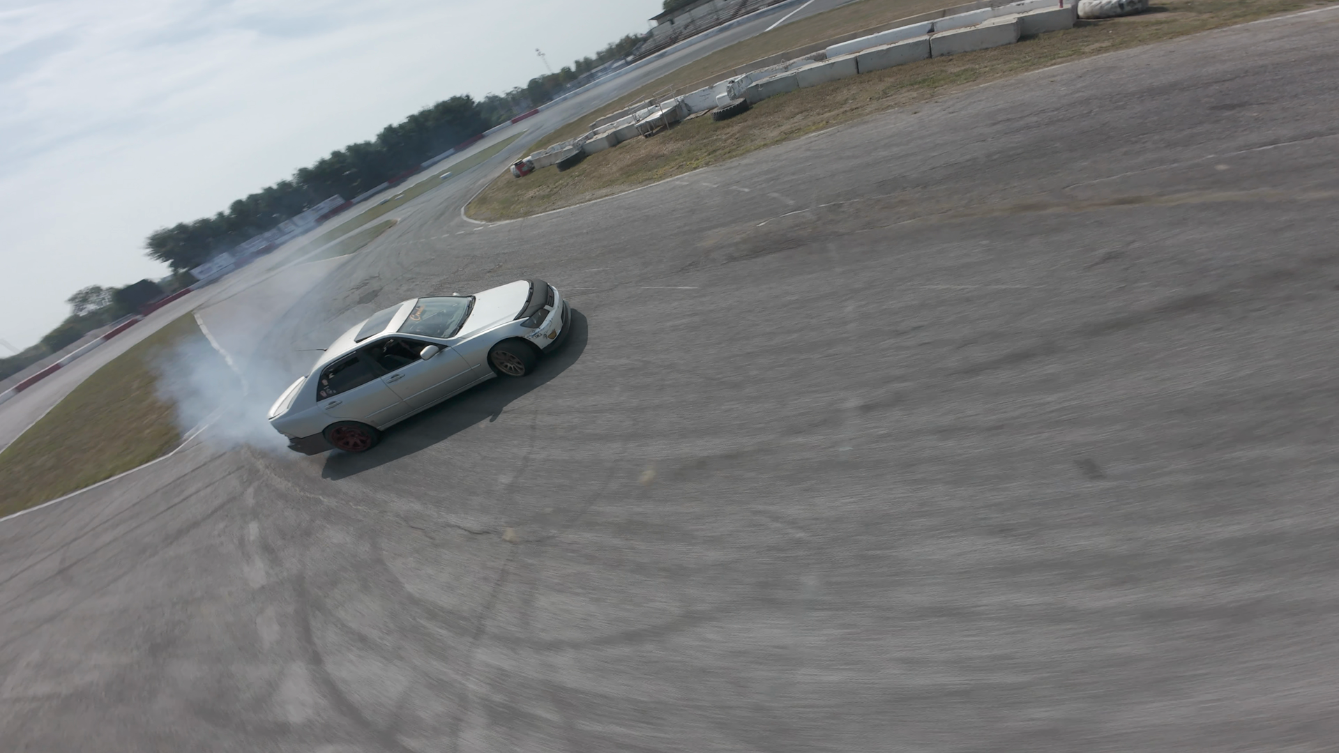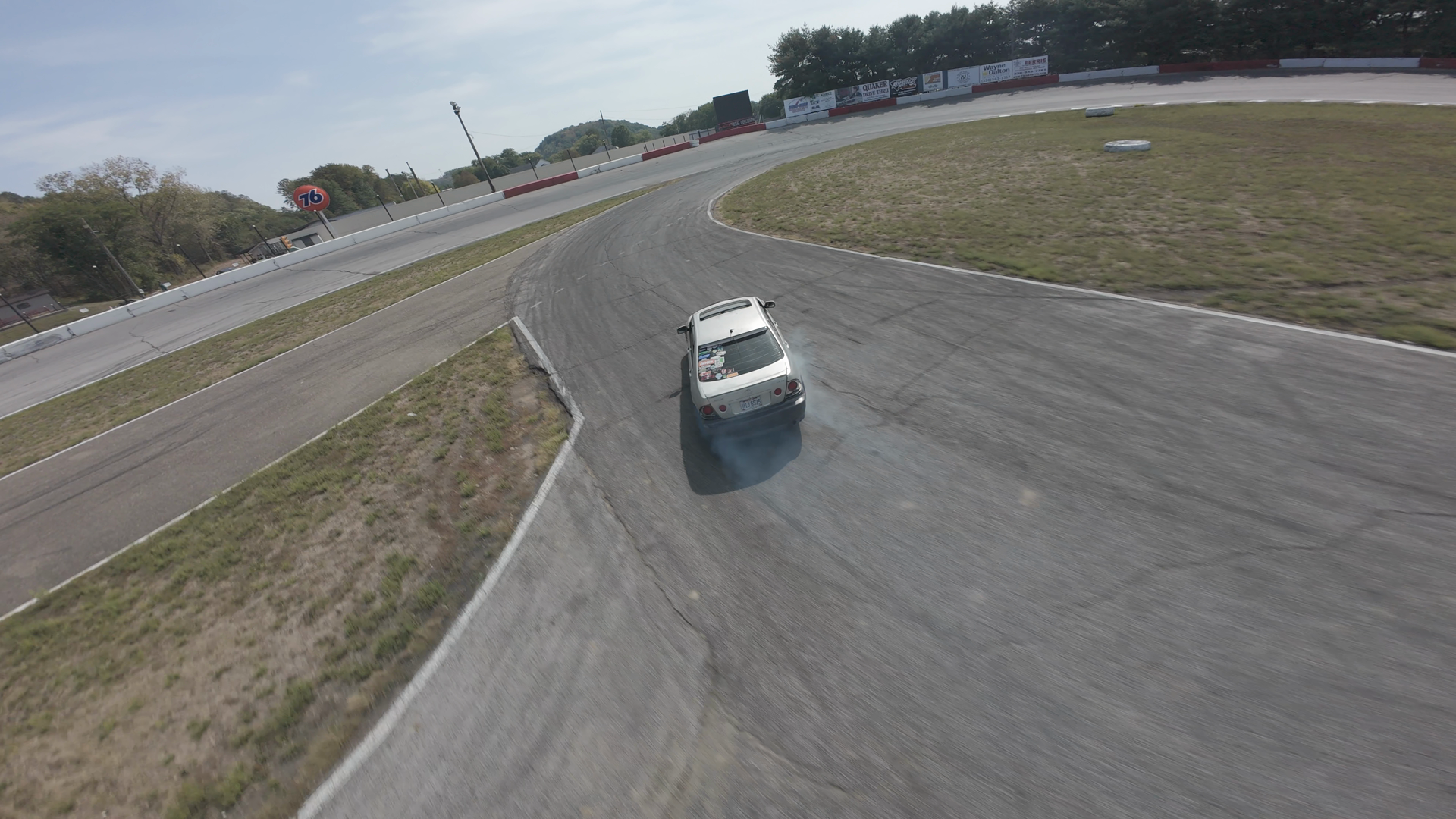 A silver sedan is drifting on a racetrack at Midvale Speedway, leaving a trail of white smoke from its tires. The vehicle is angled to the left, performing a tight turn around a curve. The racetrack features a rough asphalt surface with a grass-covered infield adjacent to the track, marked by a white wall. The scene is set during the day under clear blue skies with sparse clouds. The car appears to be in motion, actively drifting, and there are no visible signs of sponsorship logos or brands on the vehicle or its surroundings.