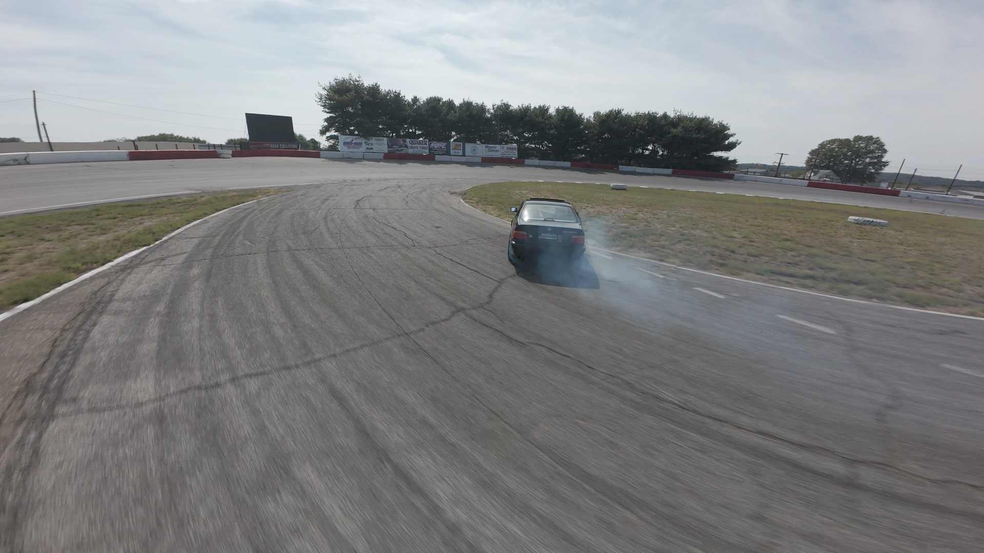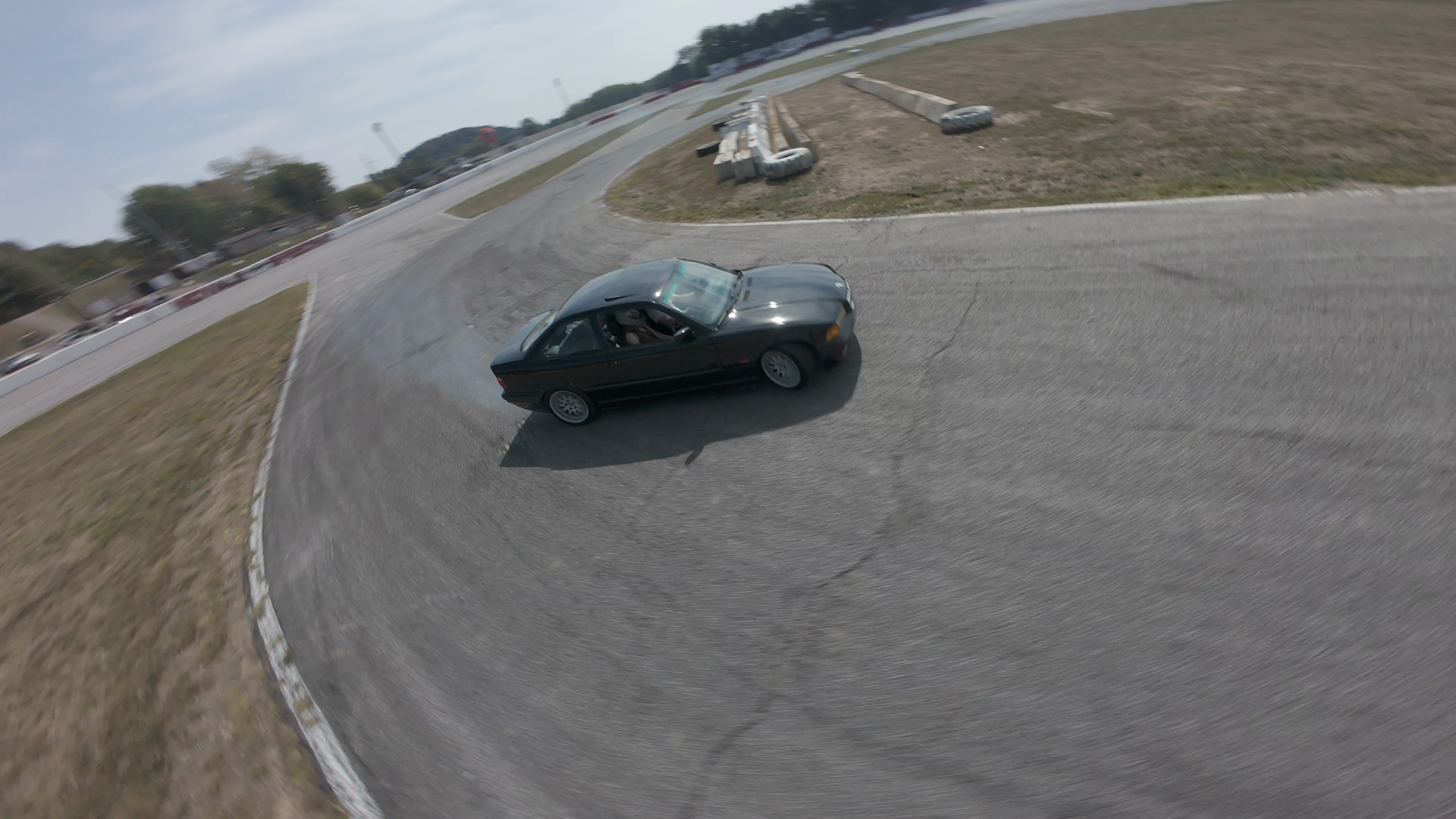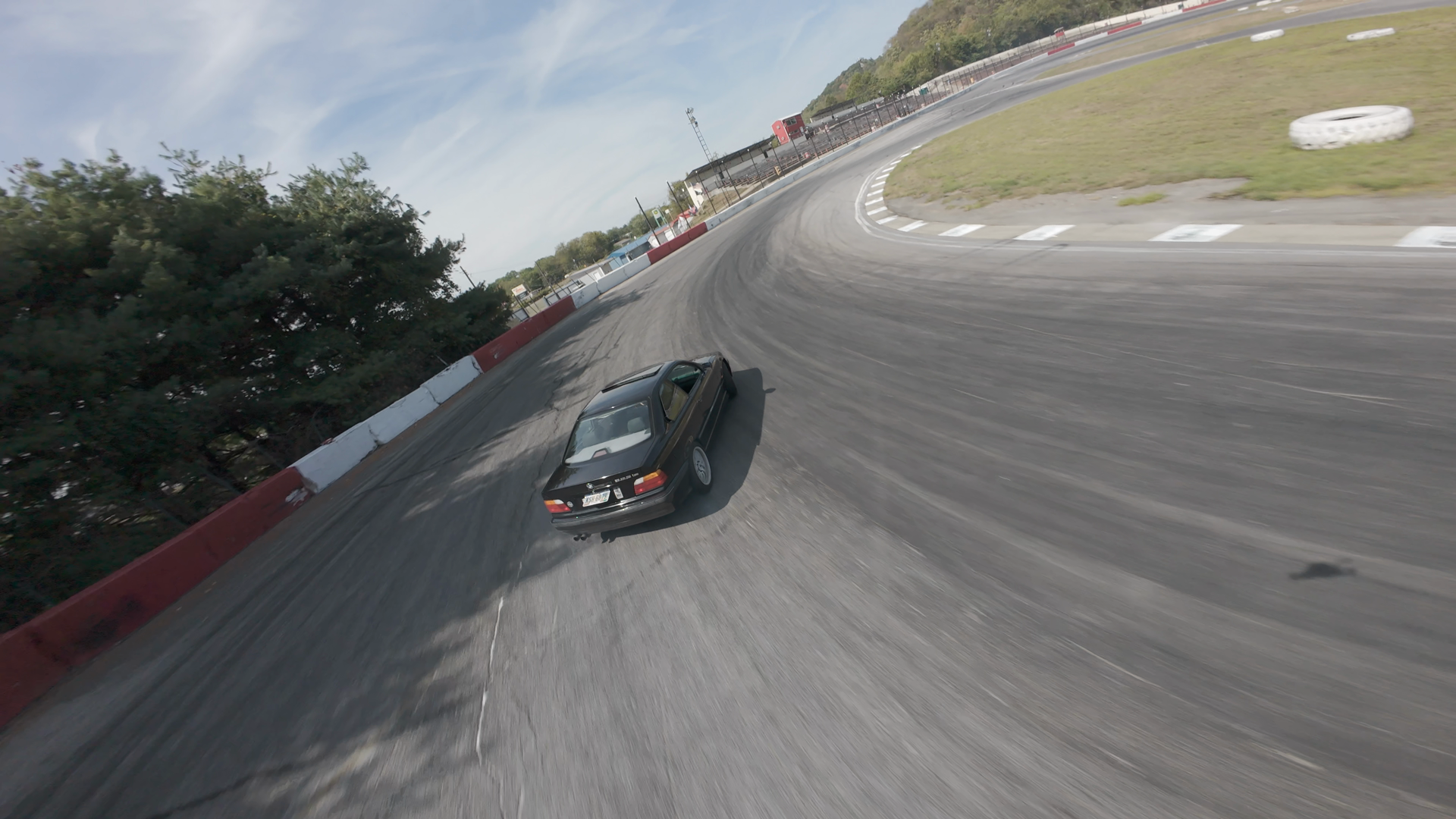 A black BMW M3 is in the midst of a drift at Midvale Speedway, leaning to the right as it navigates a curve on the track. The car's tires are visible, with signs of motion blurring, indicating high speed and control. The driver appears focused, with the car holding a tight line close to the track's white markings. The scenery reveals a sunny day with scattered trees and a clear blue sky. The track is bordered by red and white barriers, and the environment has a racing atmosphere with visible tire tracks and an open, grassy area beyond the track limits.
