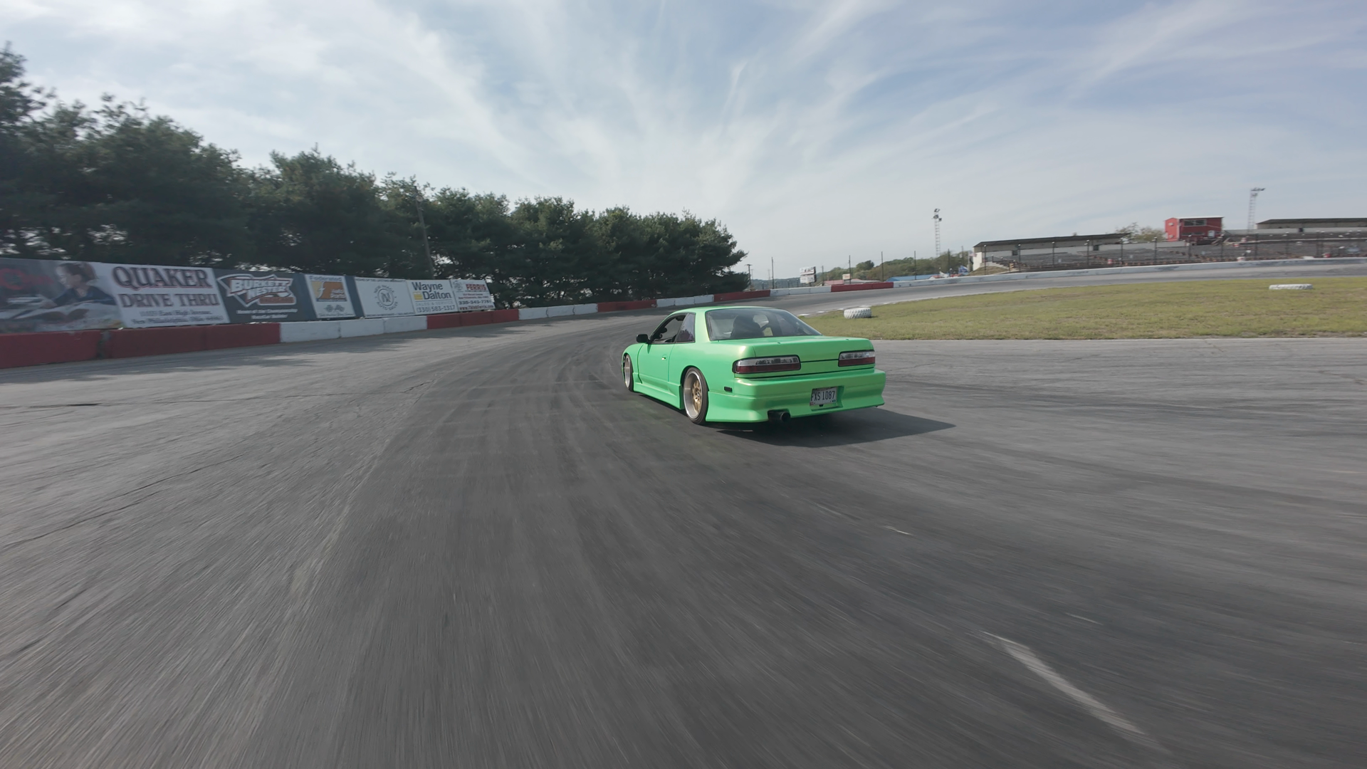 A bright green Nissan S13 drift sports car is being driven on a racetrack at Midvale Speedway. The car is performing a drift maneuver, smoothly sliding along the surface on its rear tires. The driver is inside the car, though their attire is not clearly visible. The background shows a clear sky above the expansive track surrounded by advertising banners for brands like Quaker and Burrett Bros. The scene highlights the excitement of drifting, with the car’s tires smoking slightly from the intense maneuver.
