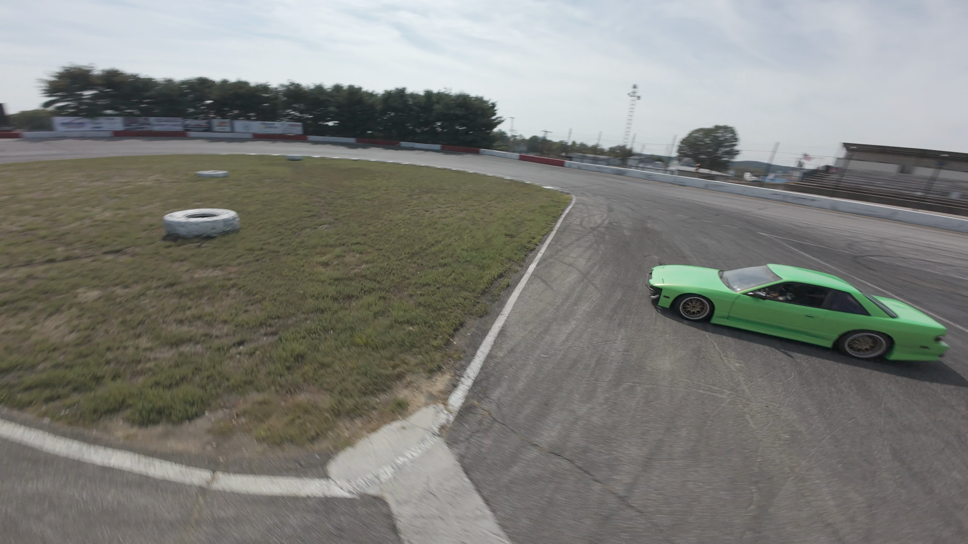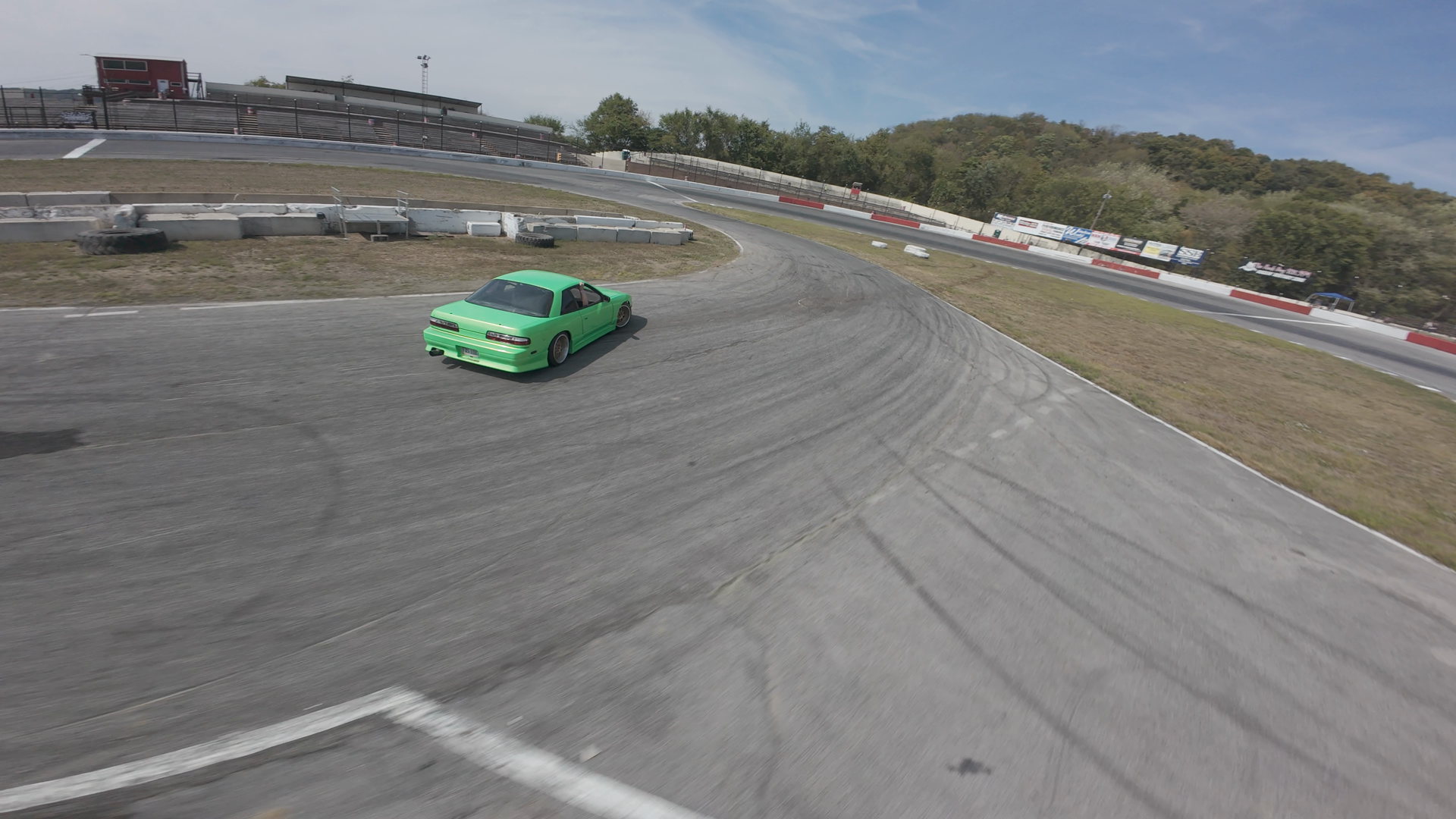 A bright green drift car is seen accelerating down a curve on Midvale Speedway, a short track known for its challenging curves. The car is a classic design, possibly a Datsun or Nissan S13 model, given its shape and design. The track surface shows signs of drifting and racing, with deep tire marks, especially around the curve. In the background, the grandstands and facilities are visible under a clear blue sky, indicating good weather conditions. The scene captures the thrill and dynamics of drifting at the speedway.