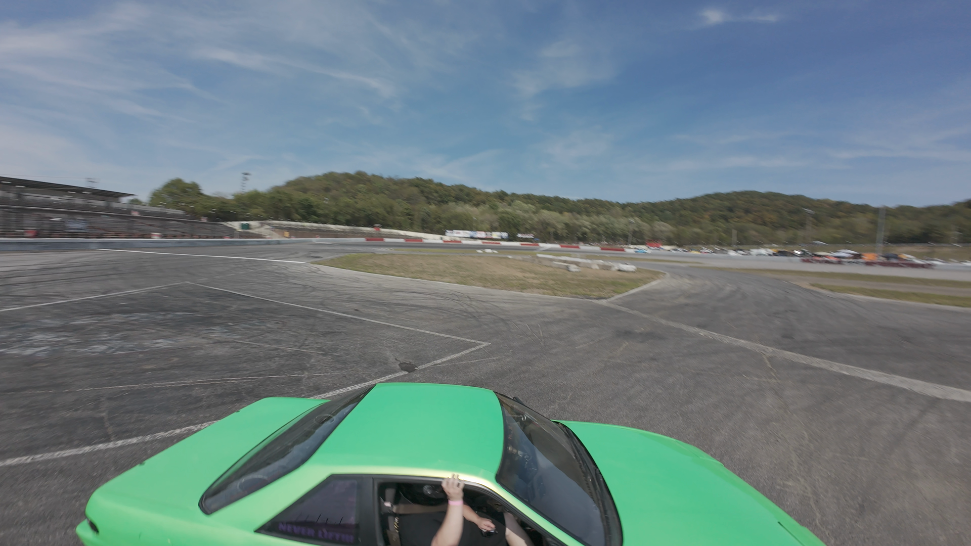 A vibrant green drift car navigates a right-hand turn at Midvale Speedway, showcasing the curves of the racetrack. The car appears to be in pristine condition, with a polished exterior reflecting the sunlight. The driver, visible behind the wheel, maintains a focused posture, with both hands gripping the steering wheel. The track is wide, with visible tire skid marks from the vehicle, indicating frequent use. The surrounding area features a small grass patch and a section of fencing, maintaining the speedway's perimeter. The scene captures the essence of drifting—a precise and controlled form of motorsport—offering a glimpse into the thrill and technique involved.