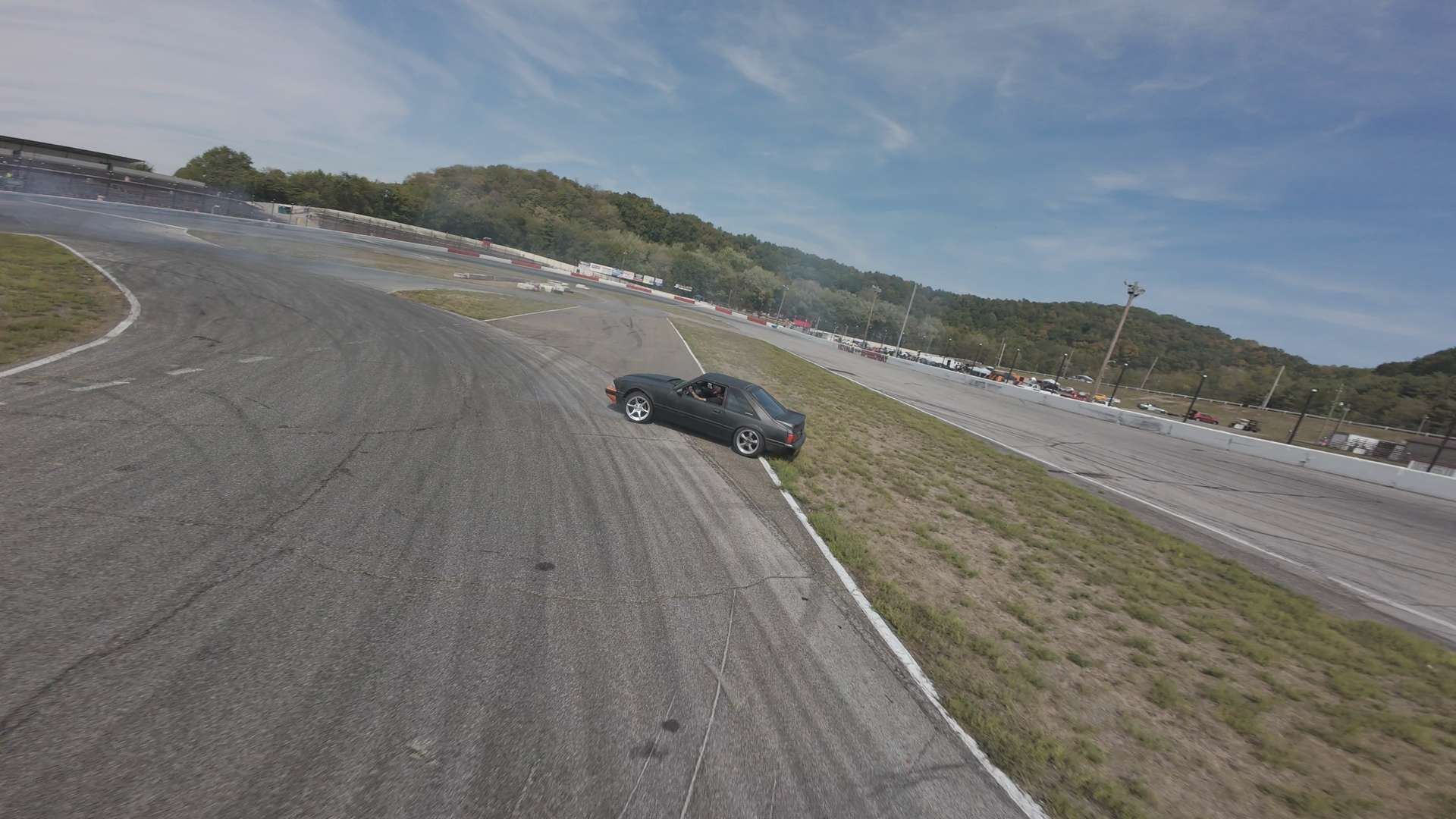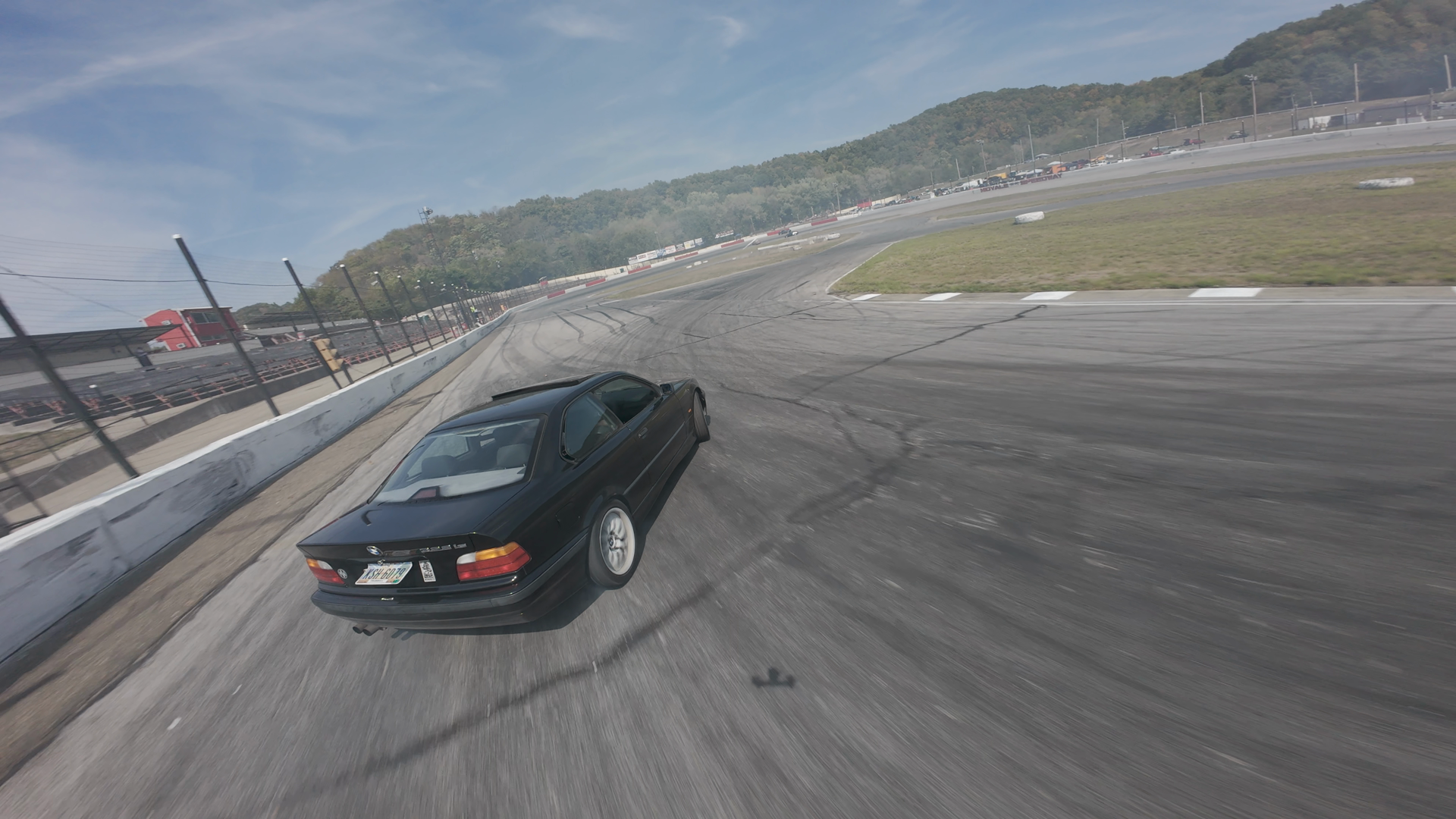 A black BMW is captured in mid-drift on a turn at Midvale Speedway. The car is leaving tire marks on the track, indicating it’s moving at a moderate speed. The surrounding environment includes a curved racetrack bordered by grass, safety barriers, and a backdrop of hills and trees under a clear blue sky. No visible people inside the car are distinguishable, but the vehicle's condition and motion suggest it is engaged in a drifting session. The video appears to convey a sense of dynamic action in a professional-grade motorsport setting.