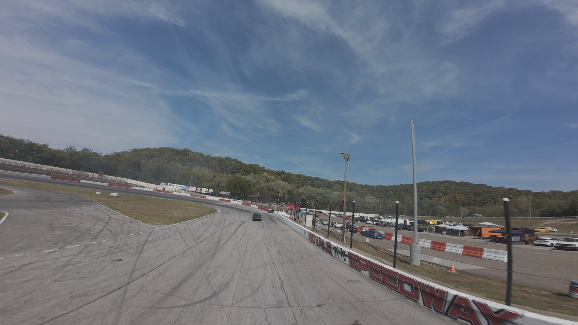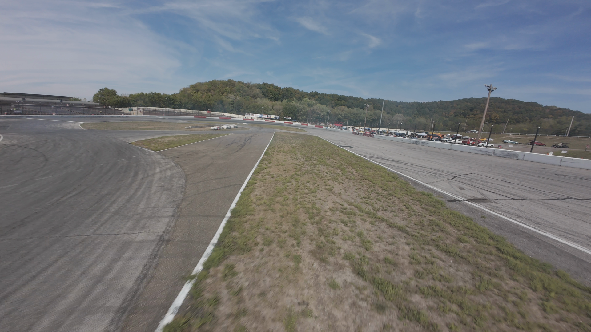 A wide aerial view of Midvale Speedway, a winding asphalt track under a clear sky, with tire marks along its edge. The track is bordered by a grassy infield and a series of buildings, including the pit area, which can be seen in the background. The surroundings include trees and some industrial structures. The scene captures the vastness of the track with a gentle curve in the foreground leading to a straight section in the distance.