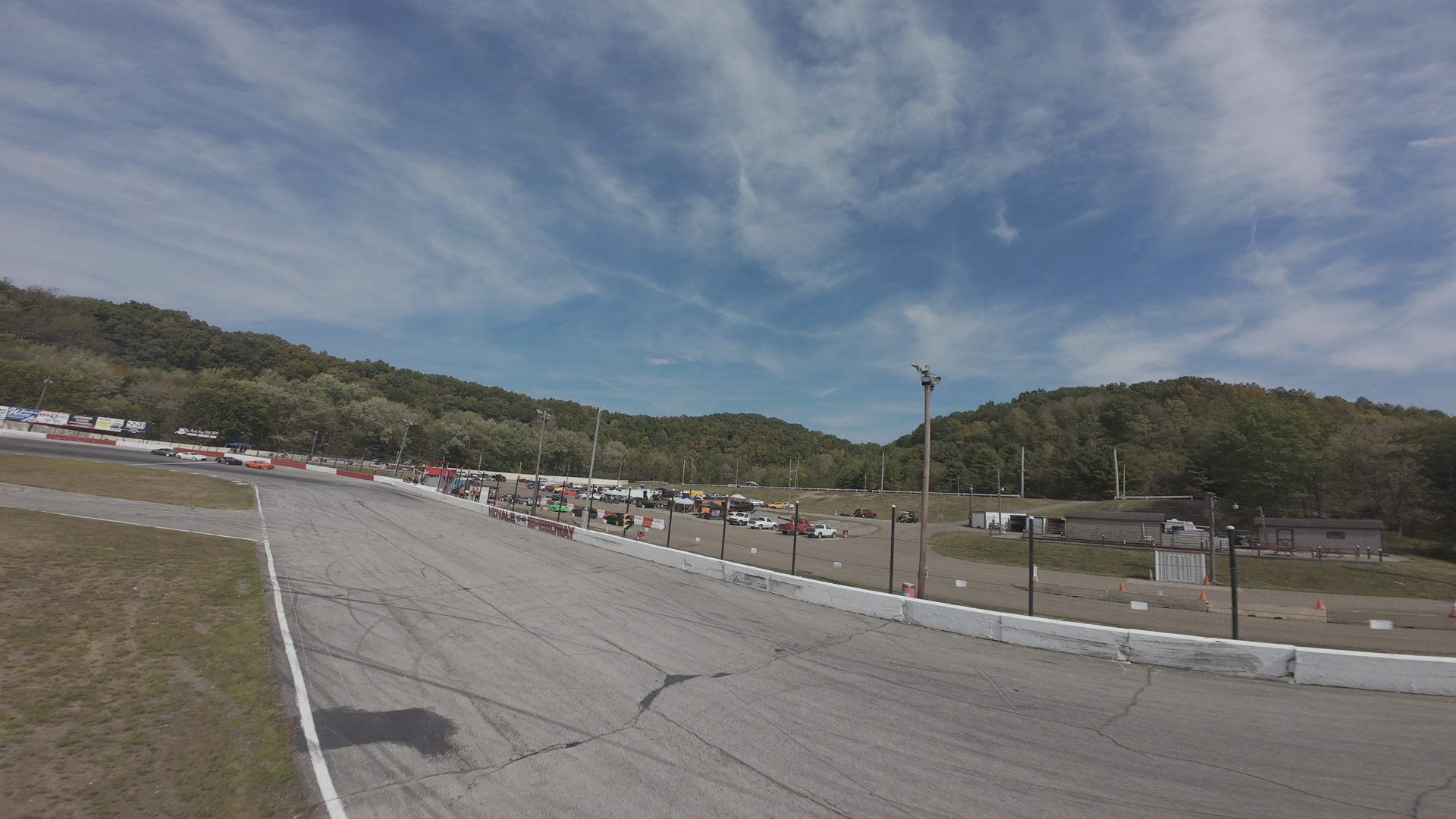 The image showcases the Midvale Speedway, a racetrack set amidst a backdrop of forested hills. Vehicles, primarily sedans and trucks, are parked along the edges of the track and in the main parking area, with a few trucks and compact cars also visible. Spectators and possibly crew members are gathered near the track, some near portable structures, such as tents and trailers. The weather appears to be clear with light clouds in the sky, suggesting a pleasant day for racing activities. The overall scene is a mix of racing activity and spectator interaction surrounding the track.