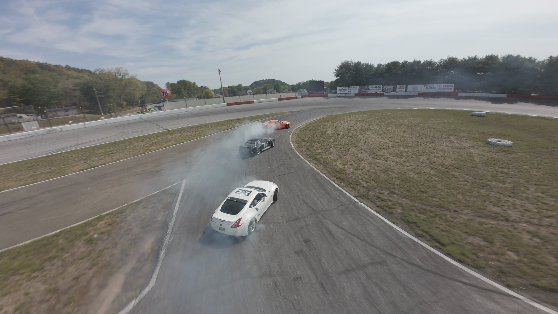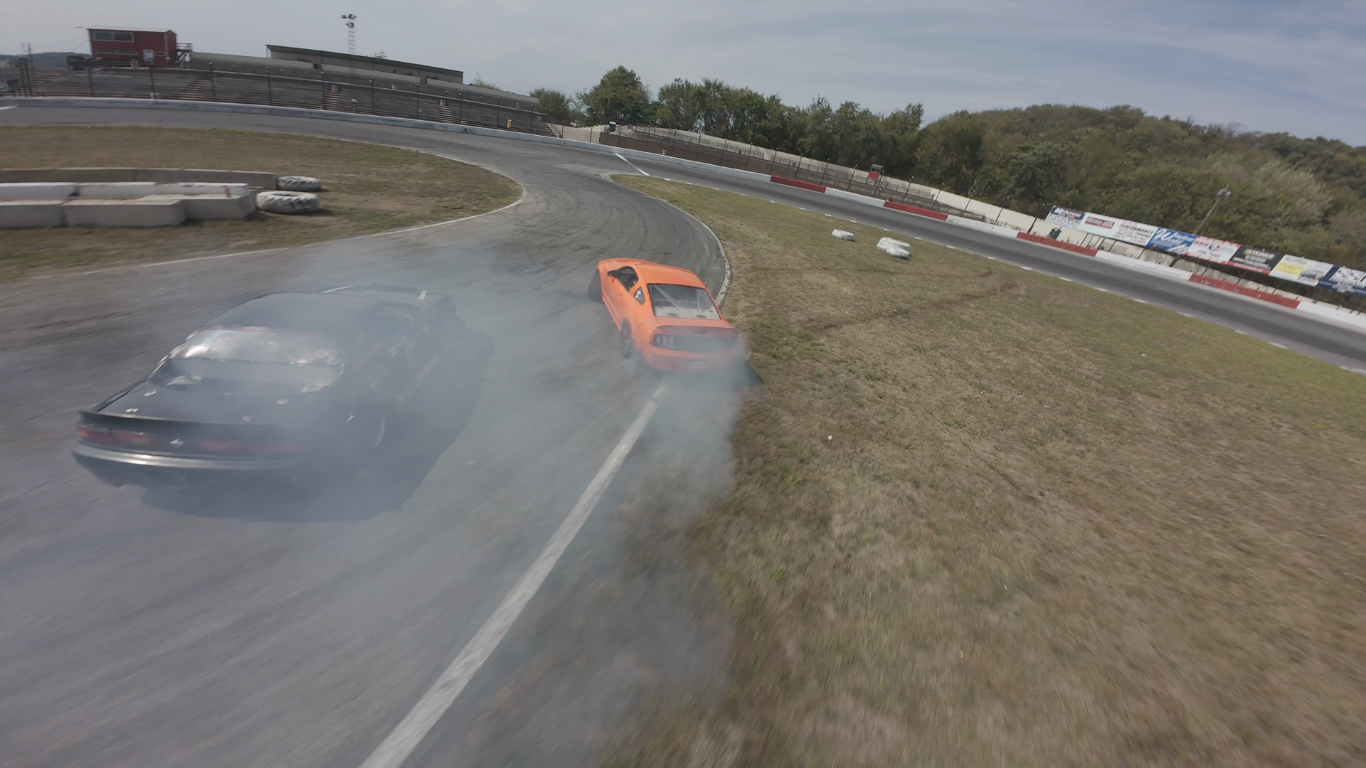 The video clip shows two sleek sports cars racing on an outdoor track, captured from a drone perspective. The track is wide and well-maintained, surrounded by grassy areas and a few trees, with race banners in the background. One car, a white Nissan 350Z, is leading in the lead, while the other, a black Chevrolet Camaro, follows closely behind. Both vehicles exhibit moderate tire smoke, indicating high-speed drift or cornering. The scene is action-packed, with the driver in the leading car wearing a white top and a helmet, and the driver in the following car wearing a dark top. The track appears to be part of a local racing or drifting event, given the signage and relaxed atmosphere.