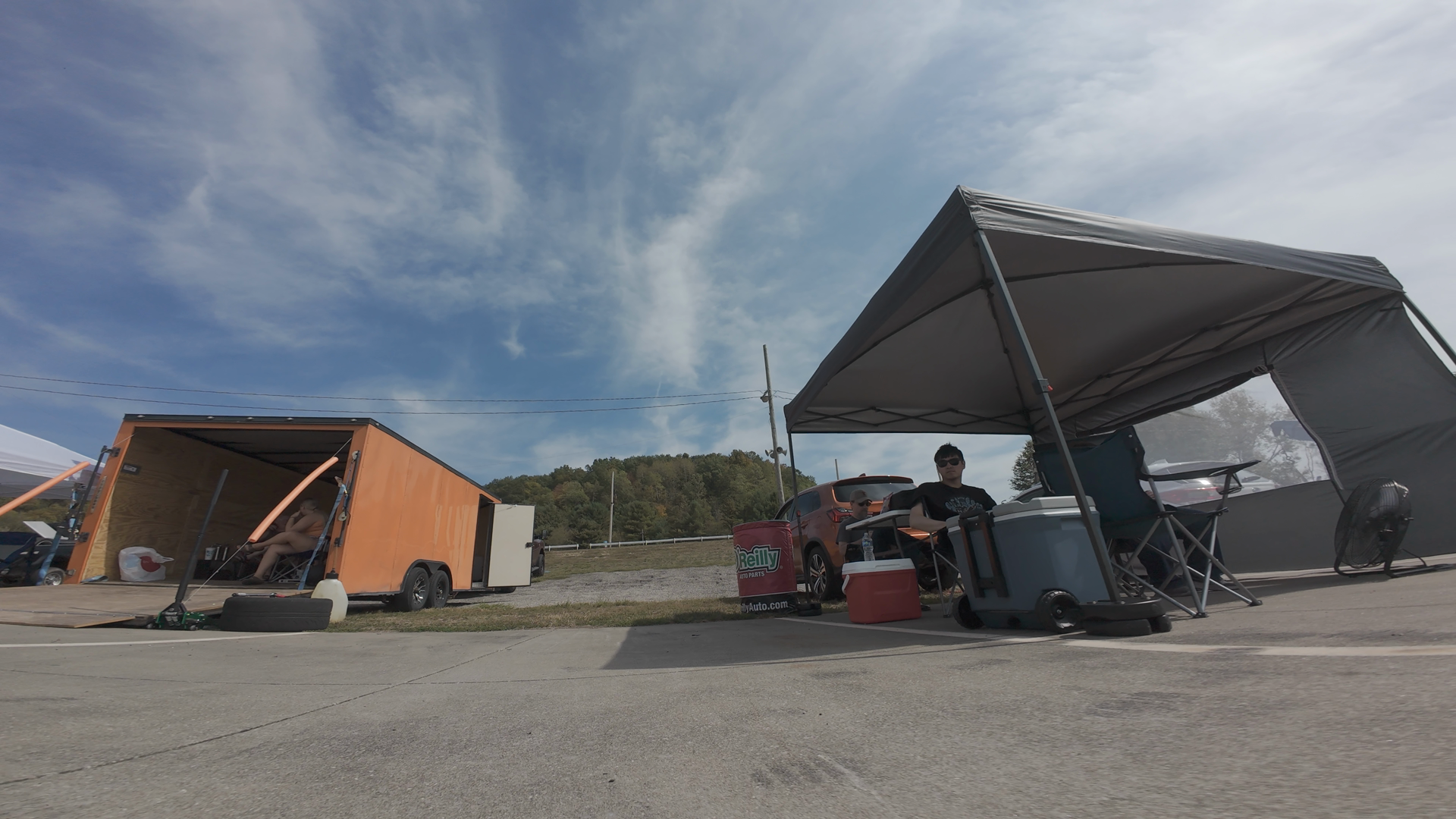 The scene is set at Midvale Speedway for an event labeled 'Club Loose Drift'. A person is sitting under a canopy, seemingly relaxing or observing, with a portable fan nearby. Nearby, an orange-tarp trailer is open, possibly used for equipment or storage. A Reilly Auto Parts branded cooler and another cooler are set up beside the tent, along with outdoor seating, indicating a leisurely or temporary setup for spectators or event participants. The setting is outdoors under a partly cloudy sky, near the edge of a parking area or event space.