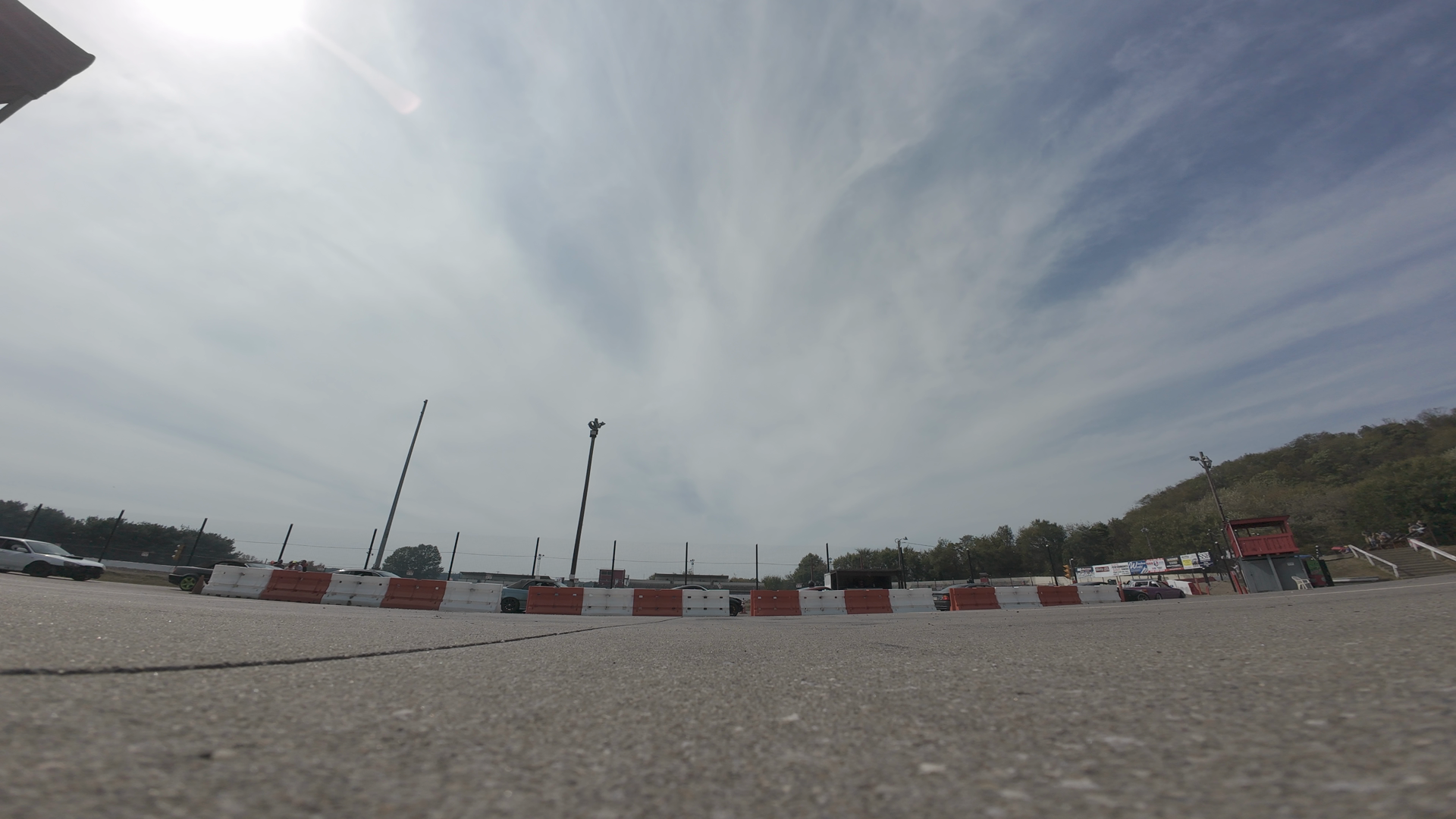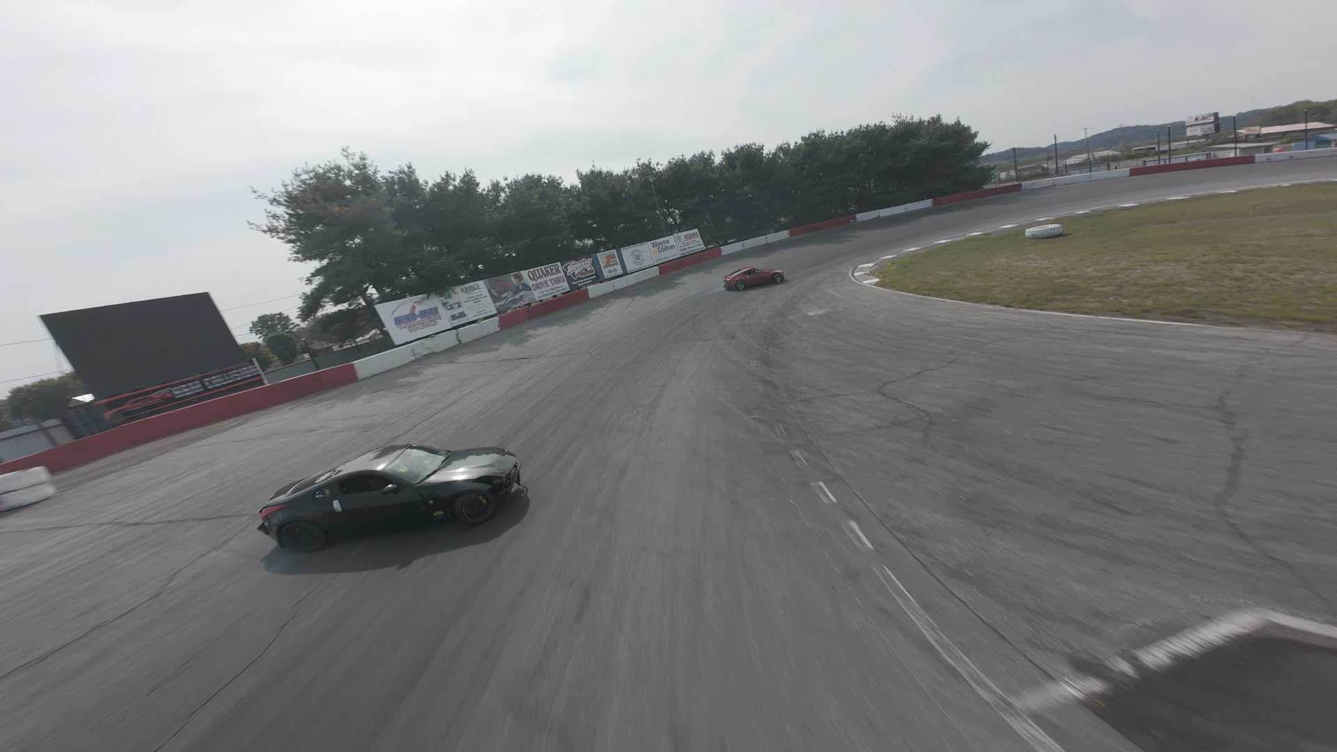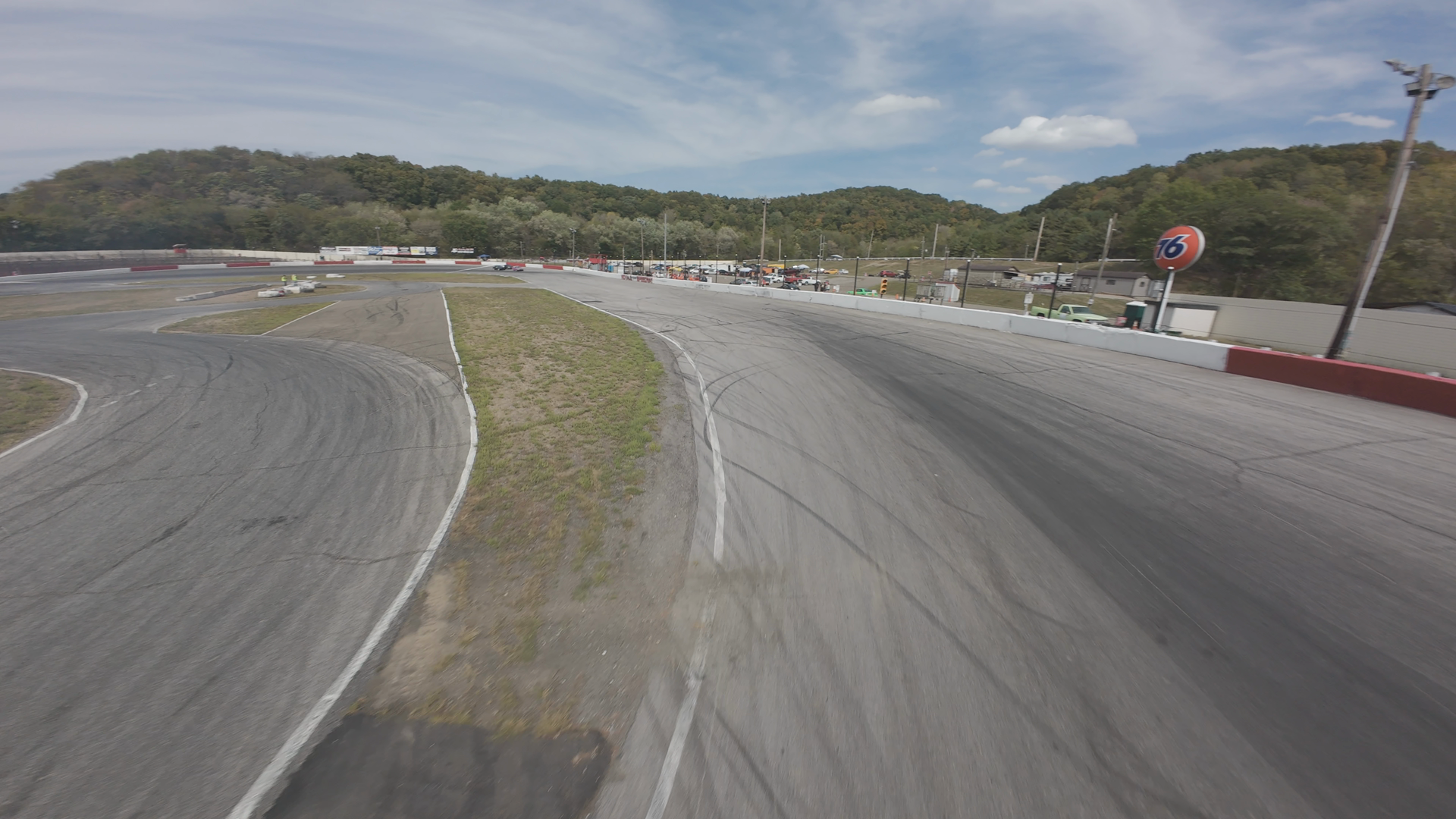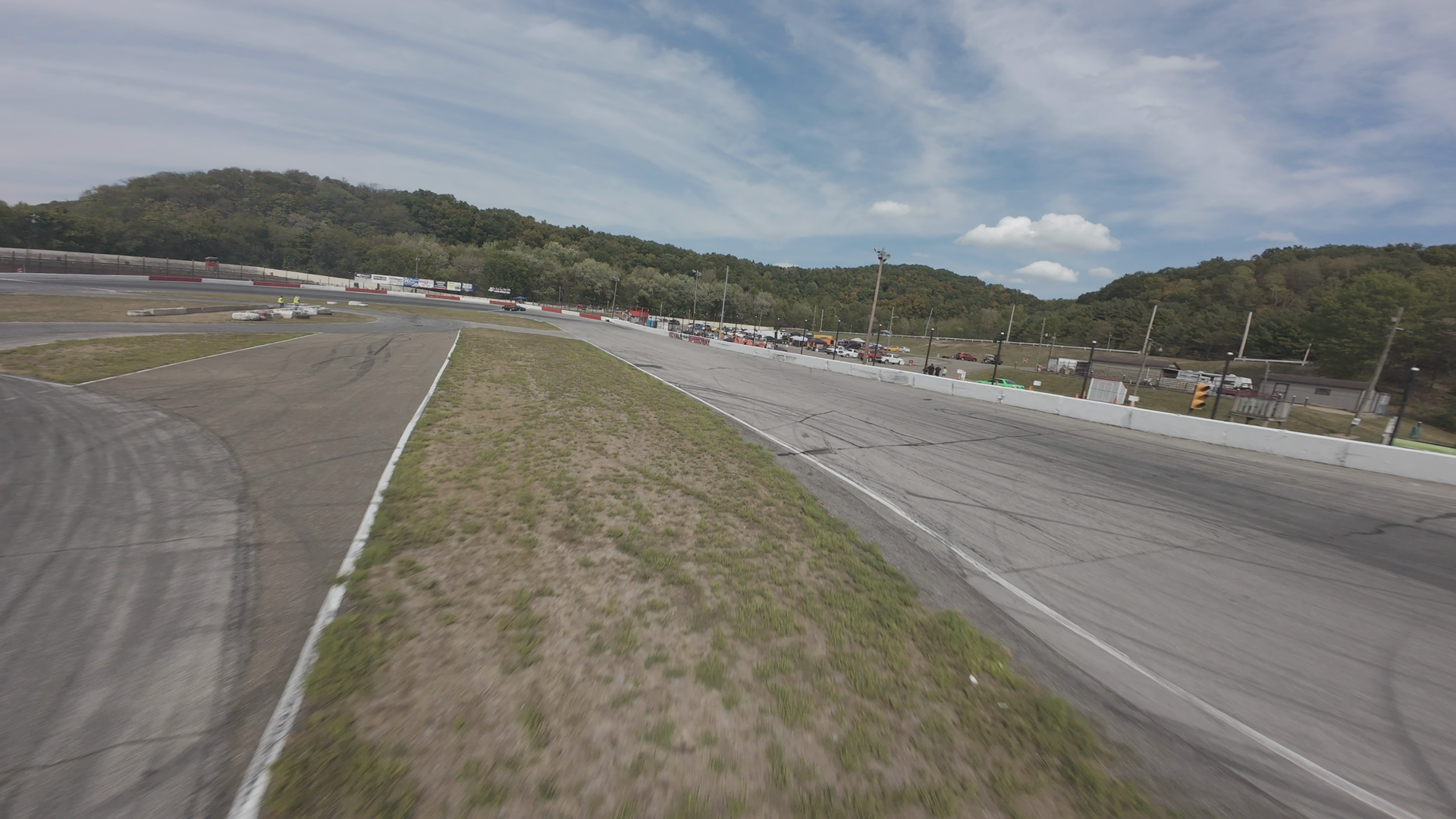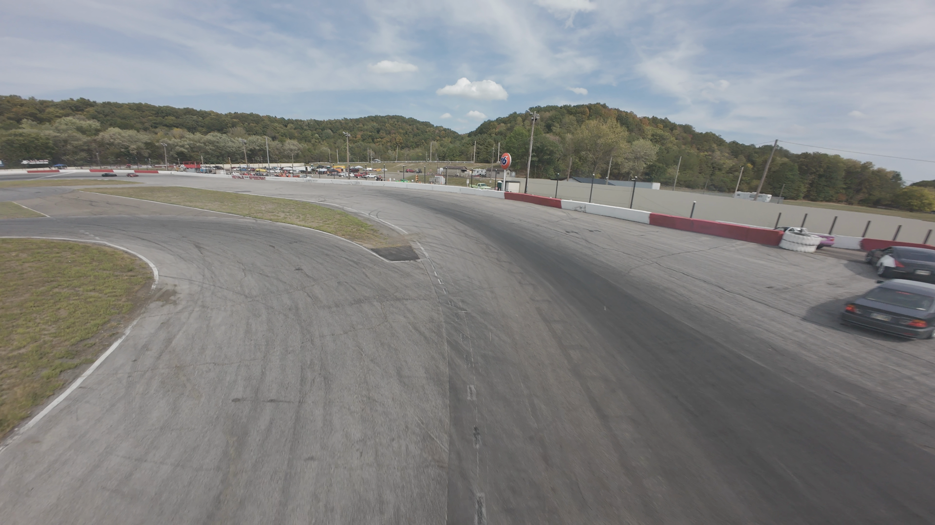 A still shot from an FPV drone capturing the expansive concrete race track at Midvale Speedway. The wide-angle shot reveals the surroundings, including barriers, trees, and some cars parked towards the horizon, with no visible action. The sky is overcast with soft, diffused light, creating a calm atmosphere. The scenery includes typical elements of a racetrack environment, such as light poles, distant traffic signals, and racetrack fencing in the background.