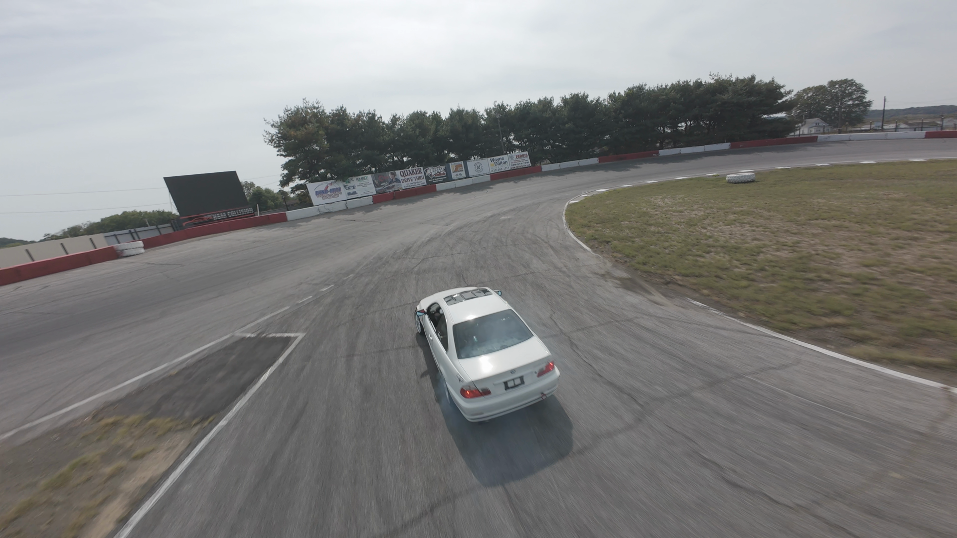 A BMW E46 is drifting at the right-hand side of the track in an aerial shot captured by an FPV drone at Midvale Speedway. The car, painted white, shows signs of use with a few visible scratches on its body. The background features a stretch of the circuit with guardrails and advertisements at the top. The setting is a cloudy day, and the environment includes open skies and trees around the track. The car is moving at a moderate speed, maintaining a controlled drift near the white boundary of the track.
