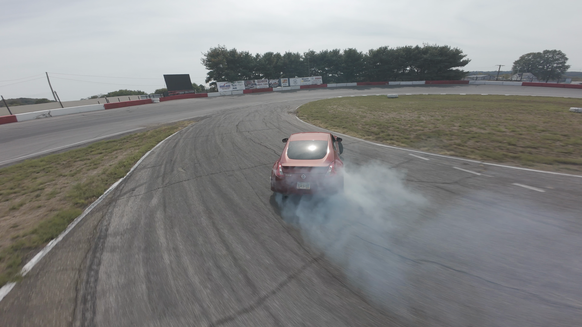 A red Nissan 370Z is drifting at Midvale Speedway, producing a plume of tire smoke as it negotiates a sharp curve. The car is positioned prominently on the racetrack, slightly leaning into the corner. The background features a grassy infield and a well-maintained racetrack surrounded by safety barriers. The scene suggests moderate speed with the car's tires smoking, indicating power braking or controlled braking during the drift maneuver. The image captures a moment of high-energy drifting action.