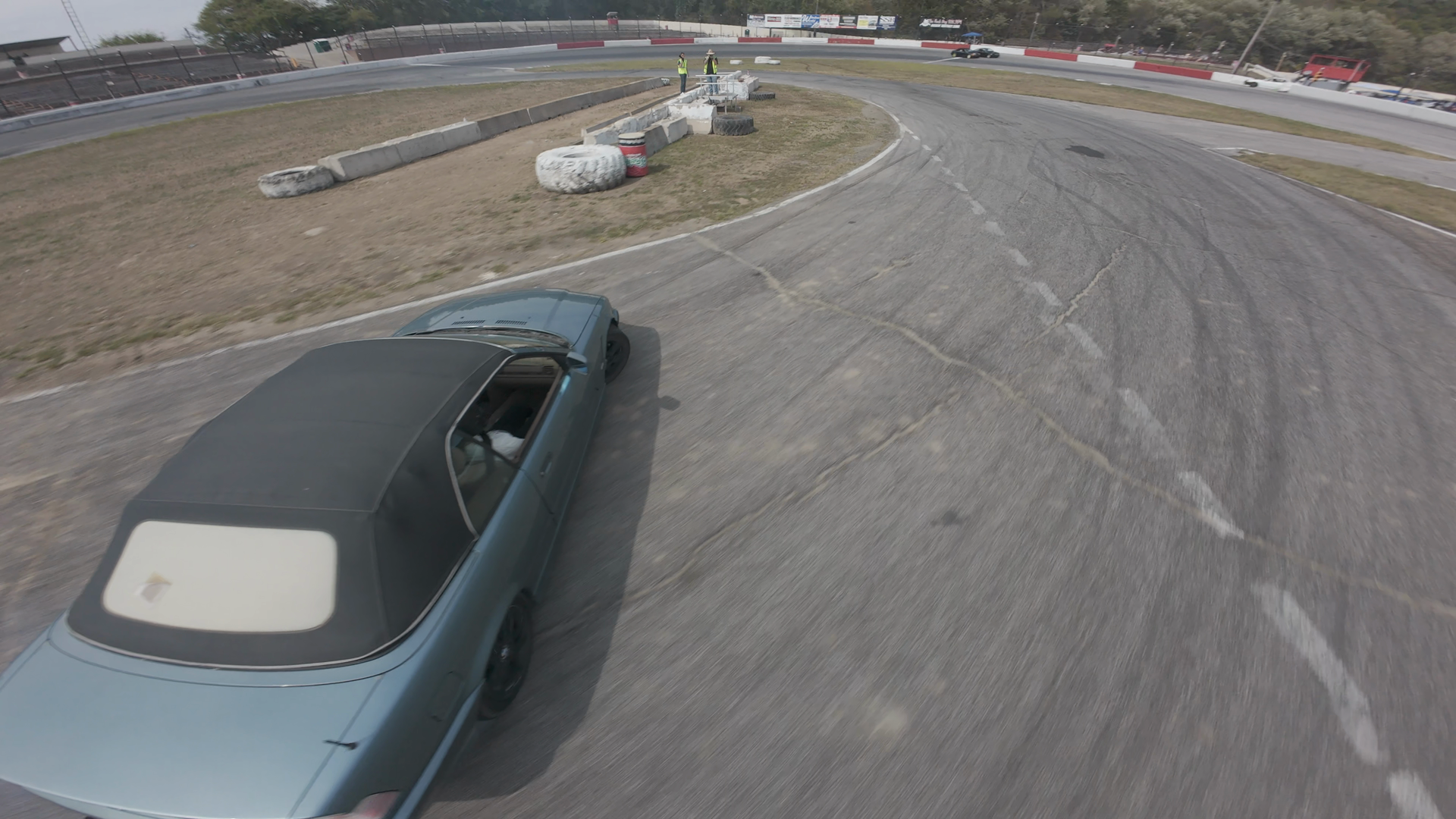 A light blue Chevrolet Camaro convertible is captured in motion on a racetrack, following a tight curve. The car appears to be performing a drifting maneuver, evident from the marked tire marks on the tarmac. The driver is visible through the car's window, wearing casual driving attire. In the background, two spectators wearing safety vests can be seen on a structure, likely overseeing the track. The surrounding landscape includes sections of grass and a few barriers along the tracks.