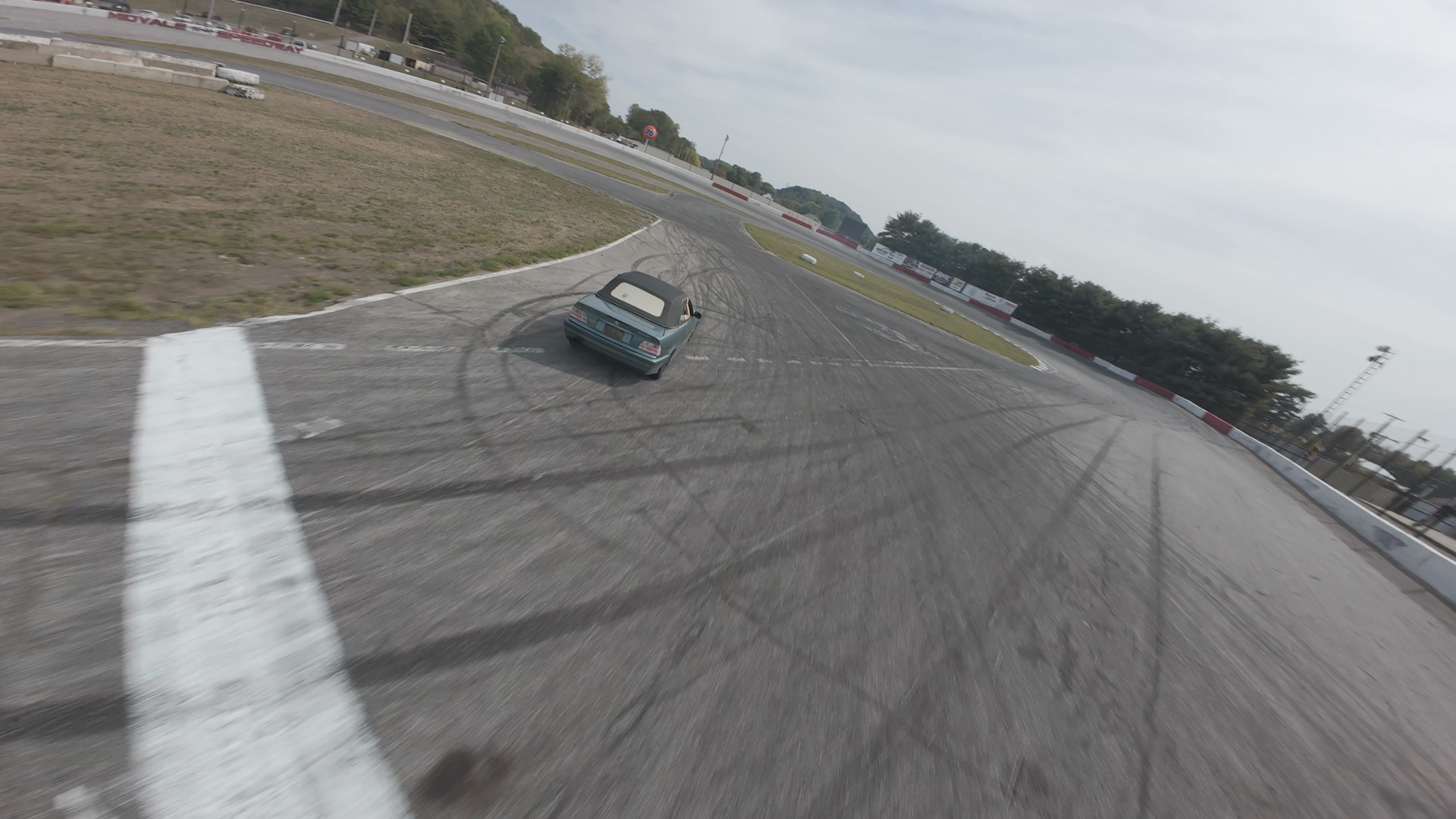 The image captures a silver convertible car drifting on a short paved racetrack with visible tire marks. The track is surrounded by a simple fence barrier and a grassy side. The scene is overcast, suggesting a cloudy day. No people or other cars are visible in this frame. The track appears to be in good condition and the car is moving smoothly yet erratically as it navigates the bend.