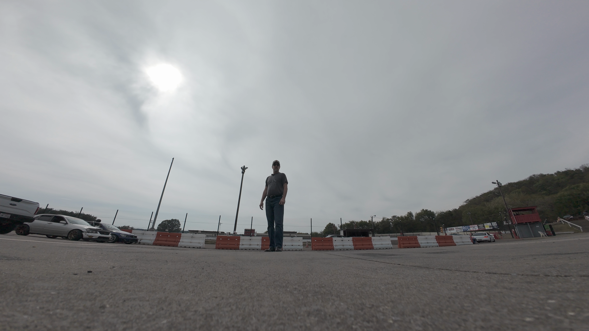 A man in casual attire—a gray polo shirt and blue jeans—stands in a spacious race track paddock. The paddock appears empty, with no other individuals in sight, and is bordered by low concrete and orange-and-white safety barriers. Several cars, including a hatchback and a white sedan, are parked in the paddock. The area is somewhat desolate, with a cloudy overcast sky above and distant outlines of trees and a single building in the background. The overall atmosphere is quiet and possibly anticipation for an opening event or competition.