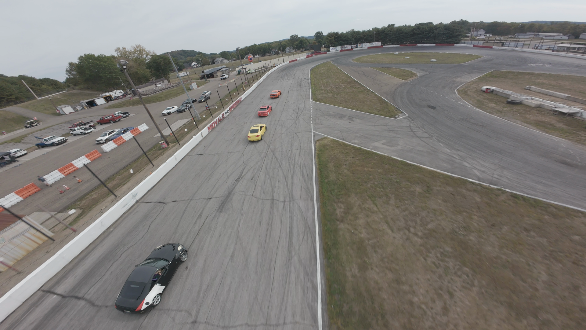 An aerial view of a race track at Midvale Speedway with several cars visible on the asphalt. The cars are positioned along a marked track, and the scenery includes grassy areas, fencing, and a distant view of the surrounding landscape with some buildings and trees. One car, a black and red coupe, is in the foreground, while others are scattered along the track. The setting appears calm, with no visible activity on the track. The weather looks overcast but dry.