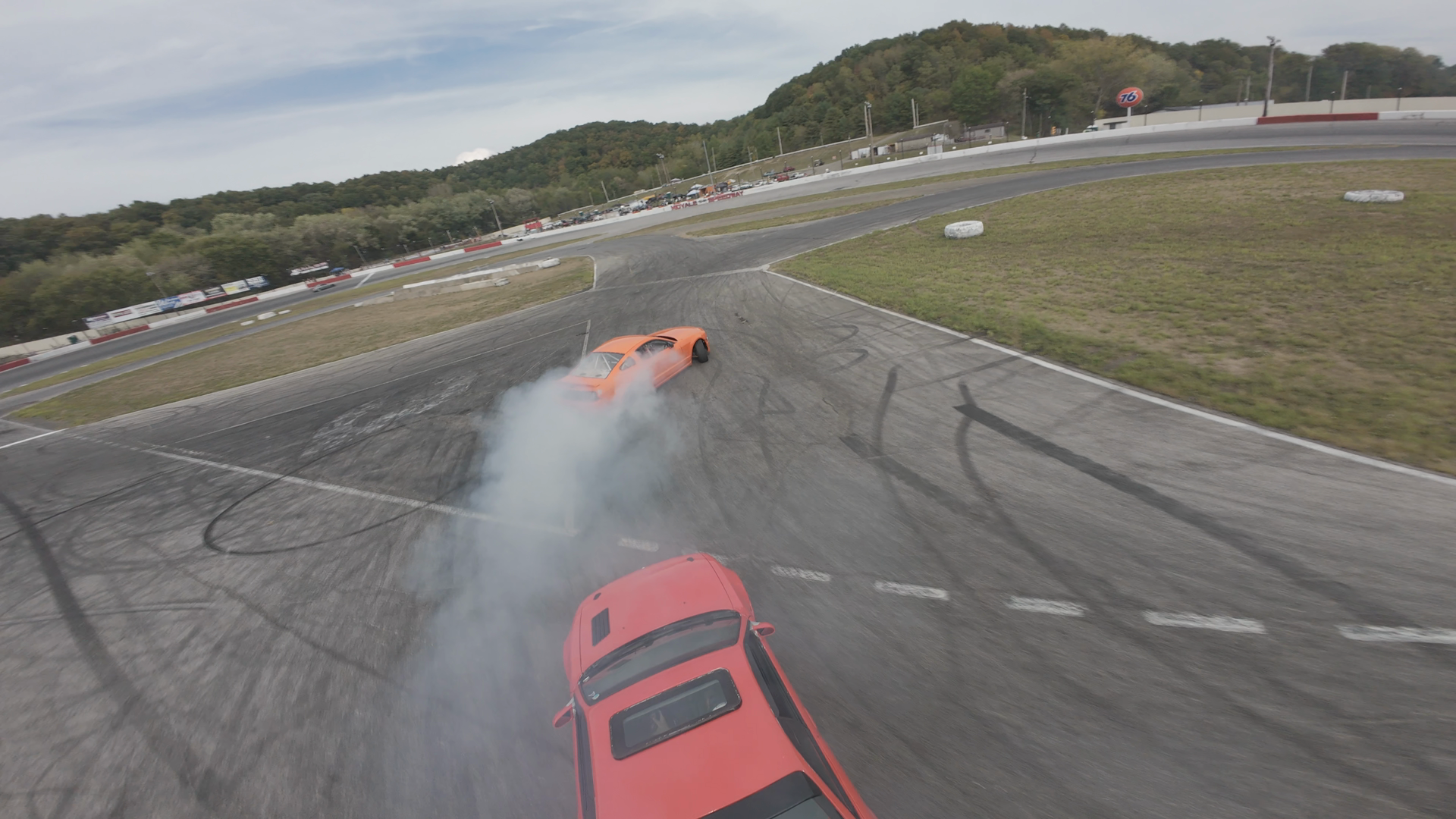 • Orange sports car drifting on a racetrack at Midvale Speedway.