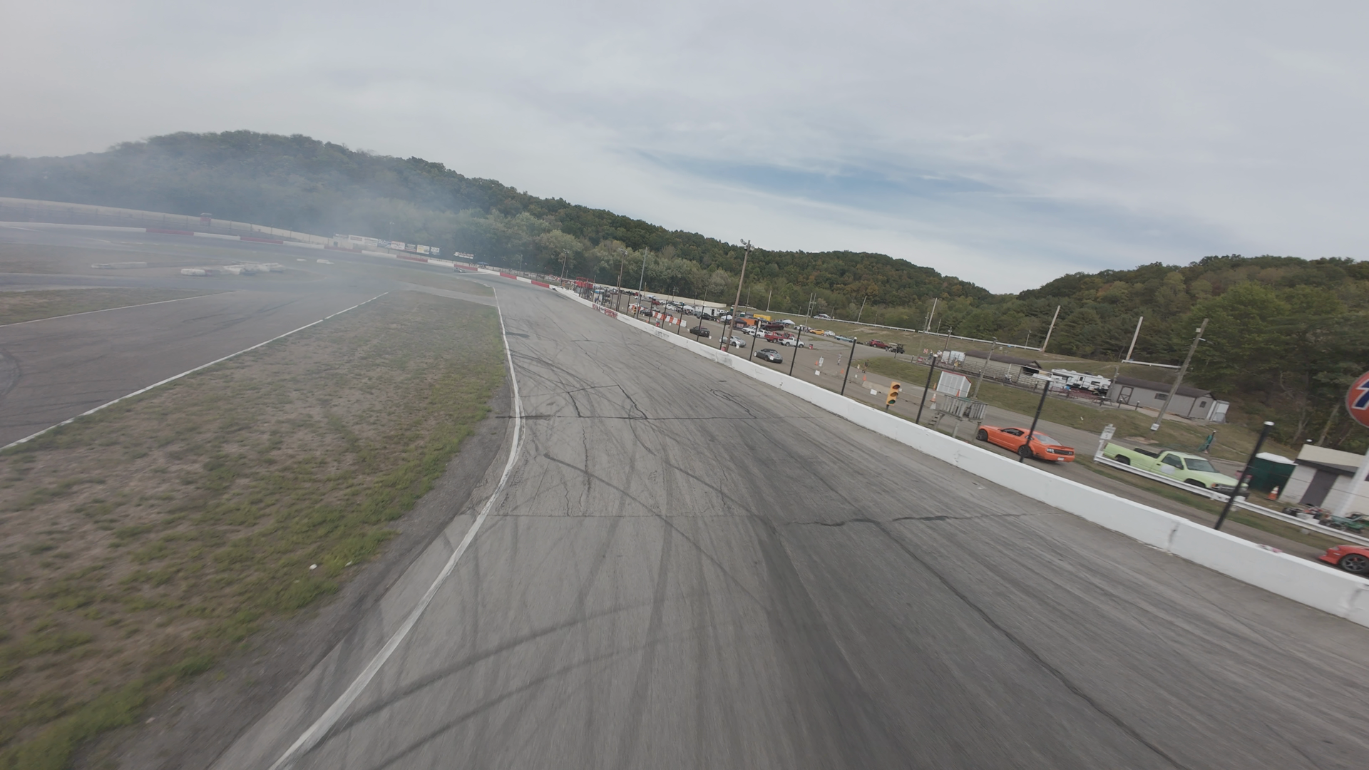 An aerial view of Midvale Speedway captures a wide stretch of the track, showcasing the asphalt surface marked with tire skid marks from racing activities. In the background, there are sparse cars parked along the track's edges and a hill covered with trees. The sky is overcast, casting a diffused light over the scene. The track is bordered by a simple white barrier. A few cars are visible near the bottom of the frame, close to what appears to be an entrance or a maintenance area with signs and infrastructure structures.
