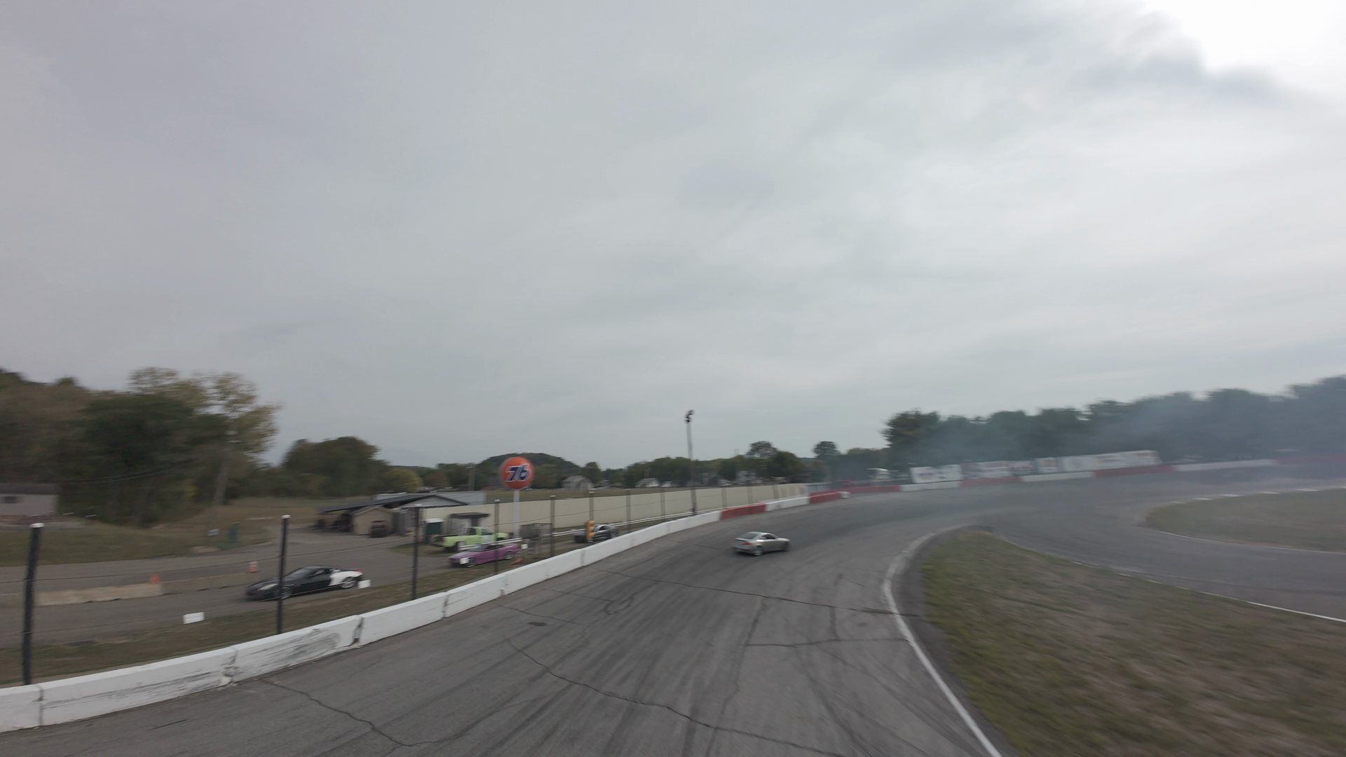 A single silver car is seen driving on a racetrack near the facilities of Midvale Speedway in Ohio. The car is traveling along a curve in the track, surrounded by a metal fence and vegetation at the edges. The sky is overcast with gray clouds, and there is a clear view of the race track and its surroundings, including a gas station sign with the number '76' and various buildings near the track. There are no visible people or additional cars in the frame, focusing the scene on the lone vehicle navigating the curve.