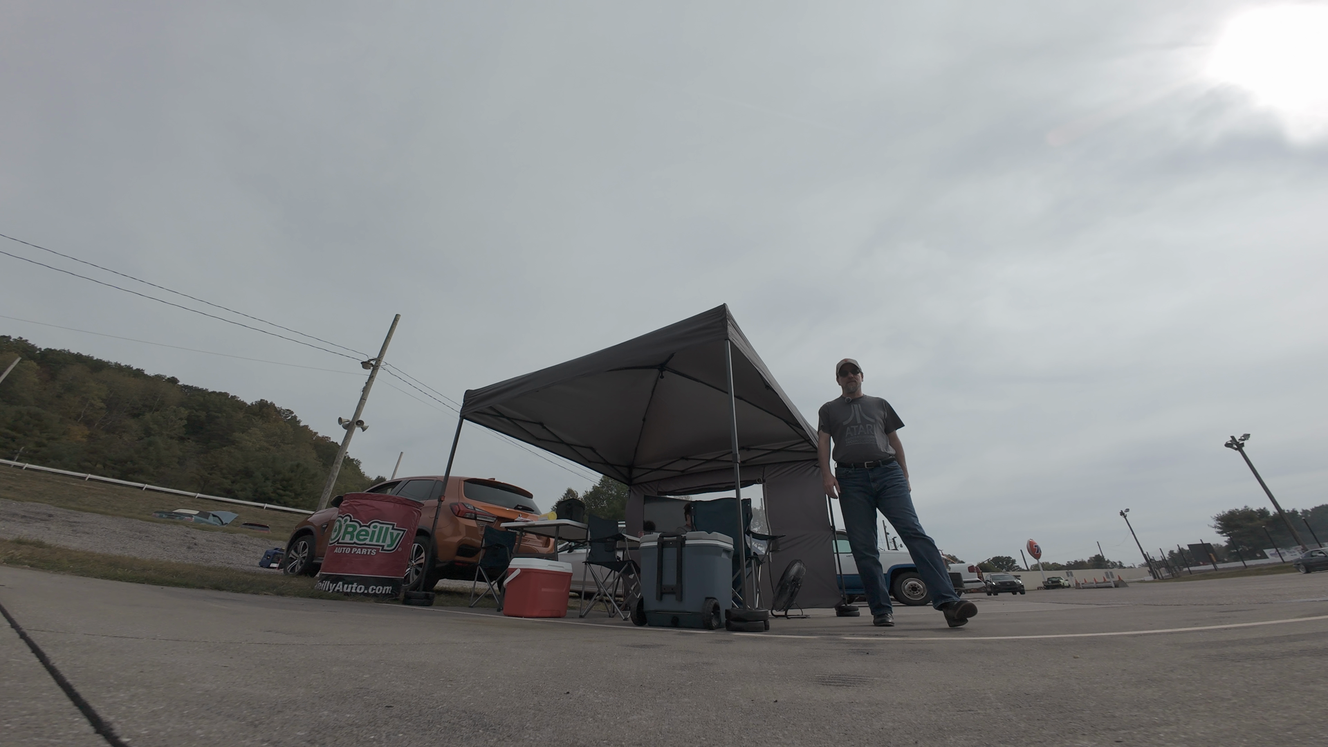A man wearing a black T-shirt with a graphic design, blue jeans, and a baseball cap is standing in a semi-urban setting near an inflatable advertisement for O'Reilly Auto Parts. He appears to be casually posing near a temporary setup with a canopy, chairs, and a trash can. In the background, there are several parked cars, including a bright orange vehicle, suggesting an event preparation area. The atmosphere is overcast, with cloudy skies and a somewhat barren landscape. The area is relatively quiet, with no other individuals visible in the immediate vicinity.