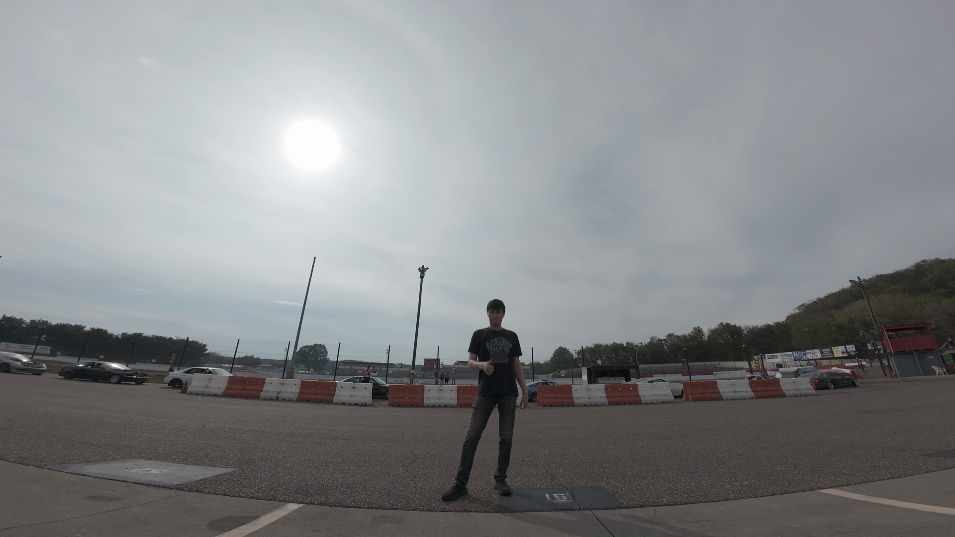 A person standing in the middle of a trackside area at Midvale Speedway, seemingly ready for the next session of the event. The surroundings display a few cars parked in the background, and the sky appears overcast. The individual is dressed in a dark t-shirt and trousers, standing on what looks like racing surface material. The venue is quiet with no active action taking place in the image itself, and the overall environment looks calm as the event is either yet to start or has just concluded.