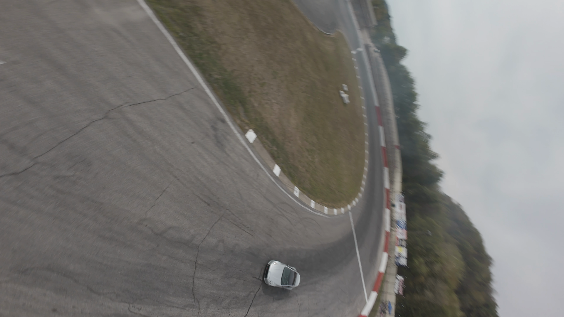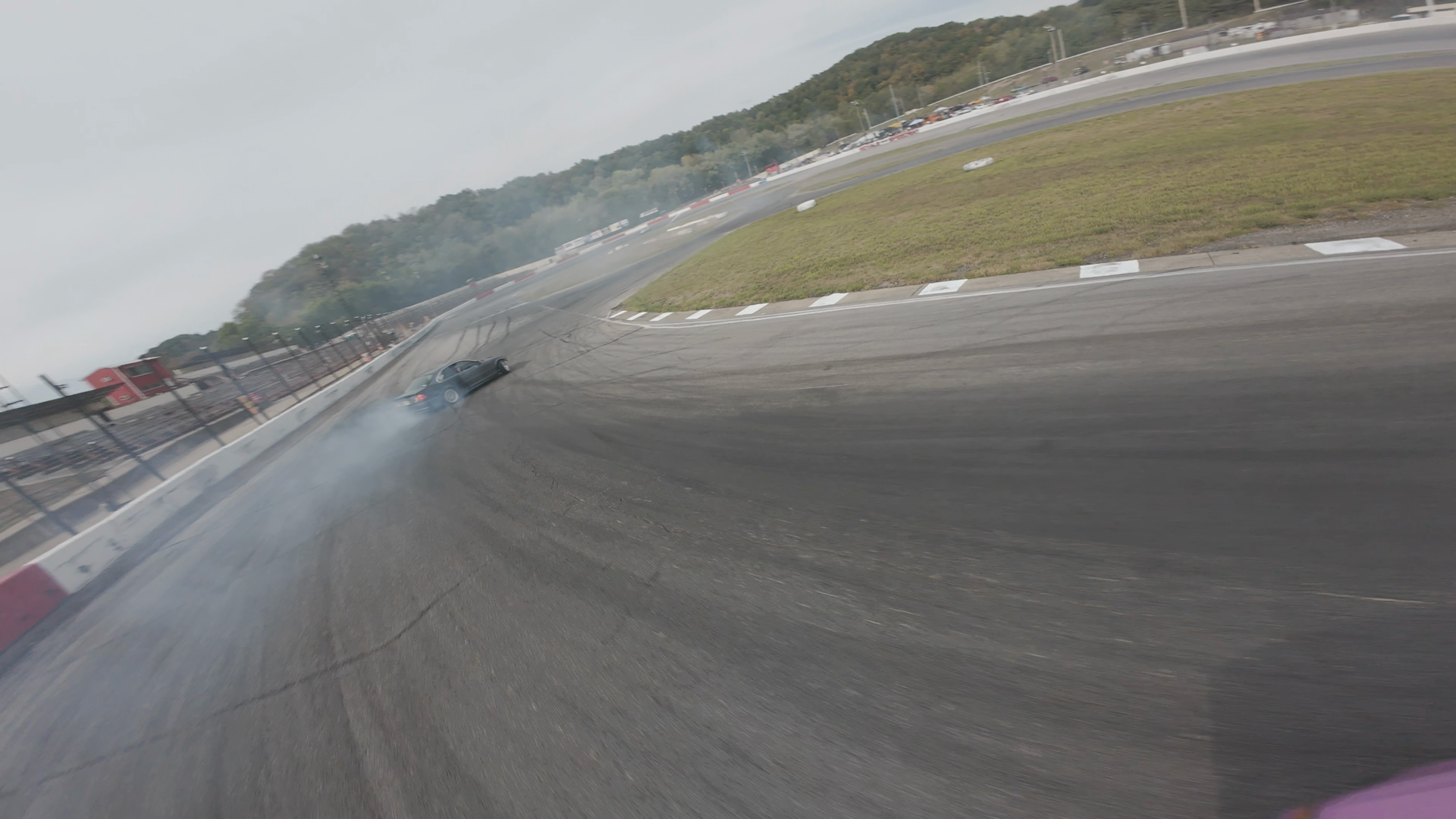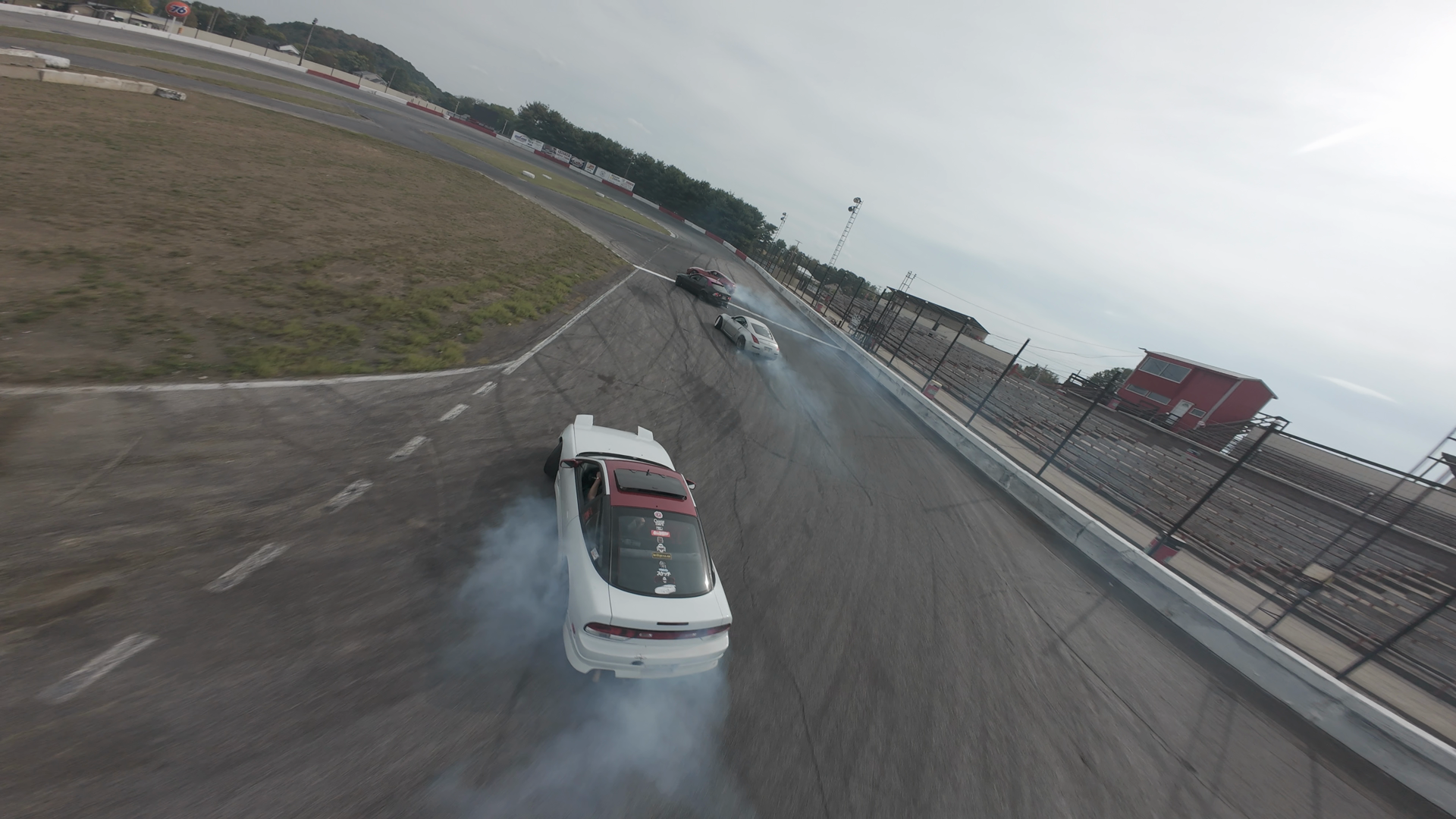 The video shows a white sports car drifting across the asphalt track of Midvale Speedway. The scene is wide and captures the curved corner of the track, where the car is sliding along the asphalt's edge. The track is surrounded by grassy areas, with a large billboard and barriers visible in the background. The car appears to be performing a controlled drift, indicative of a professional or practice session, rather than a race. The weather is overcast, and the track markings and dividers are clearly visible.