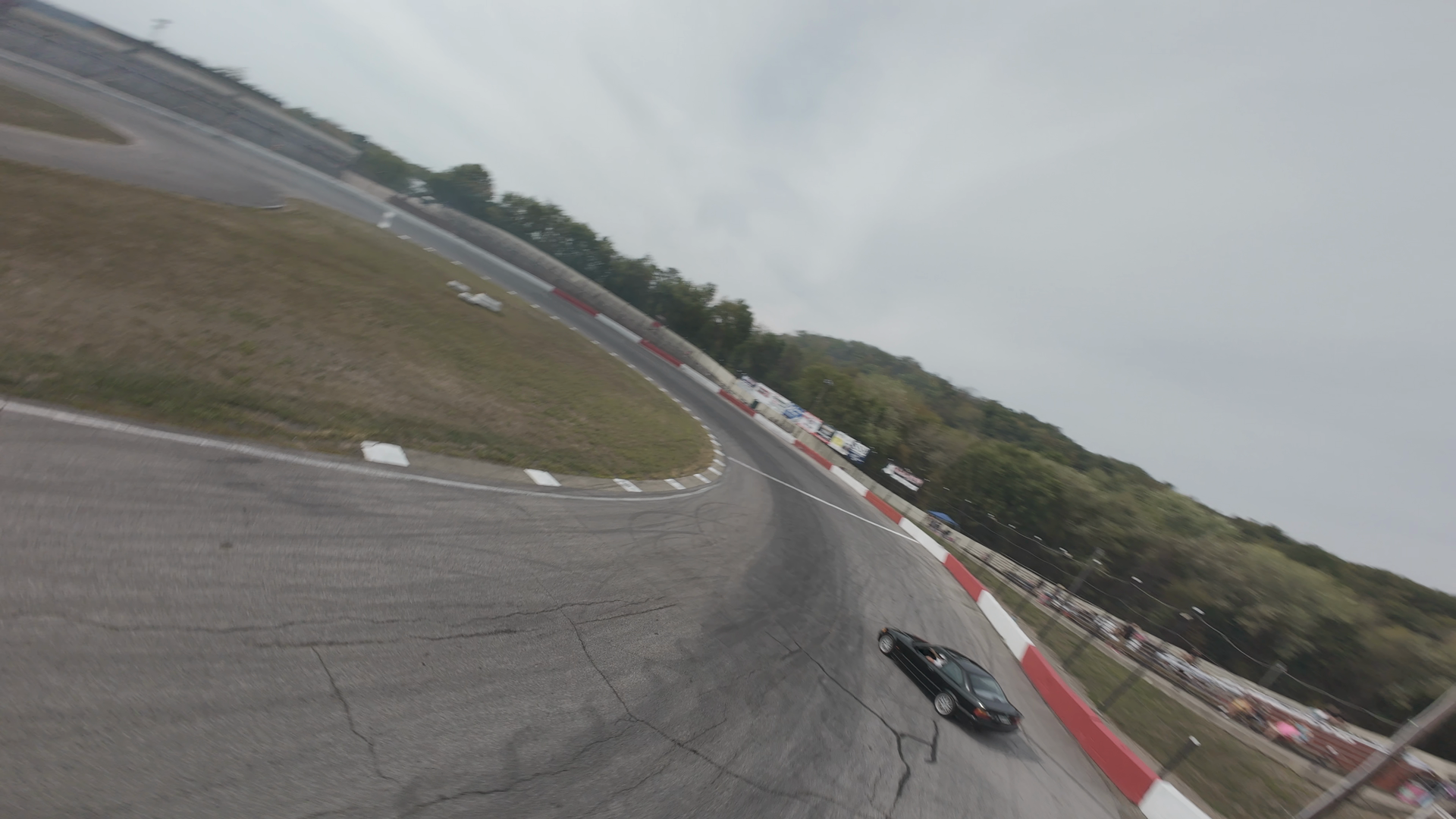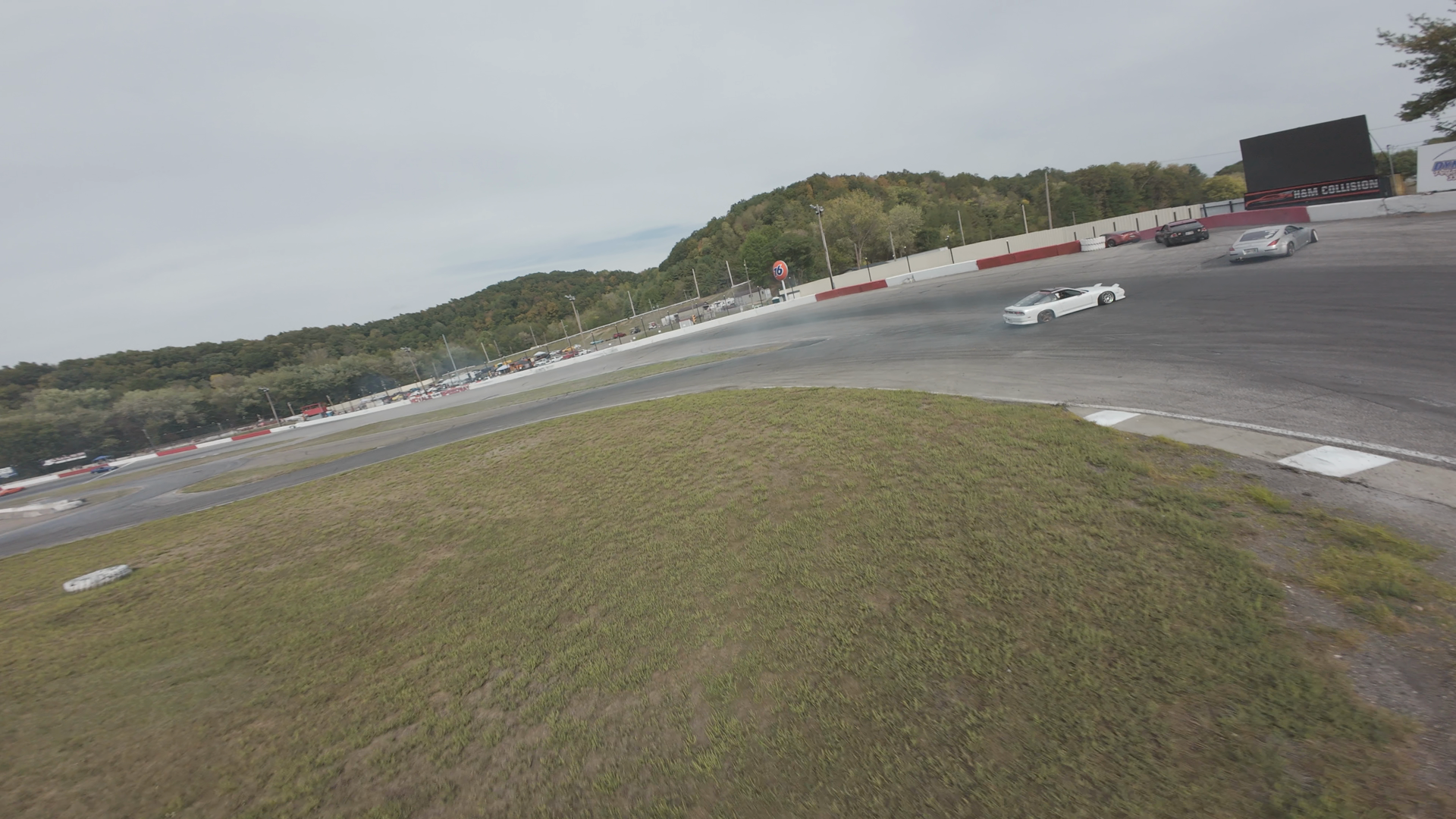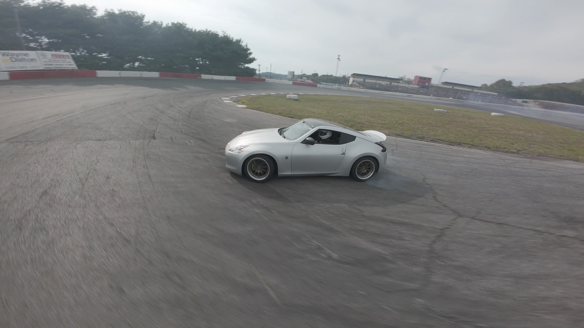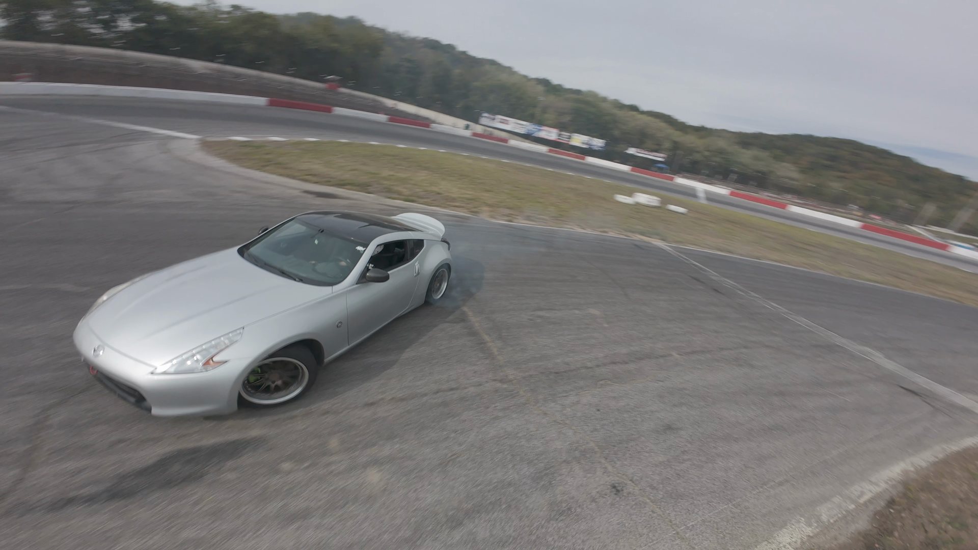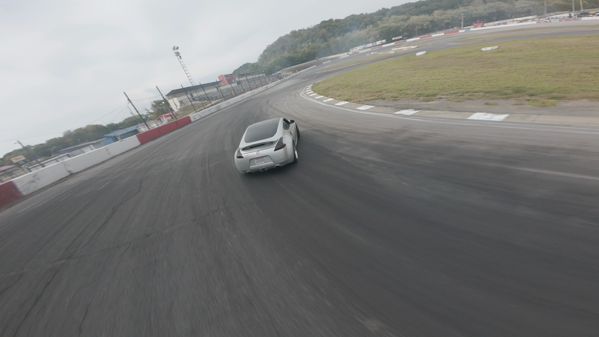 A silver Nissan 370Z is captured from a low-angle drone shot at Midvale Speedway. The car is in motion, performing a turn on the asphalt track. The scene includes red and white barrier walls alongside the track and lush green hills in the background, indicating clear weather and daylight conditions. The car's make and model are easily identifiable, and there are no visible logos or branding on the car in this shot.