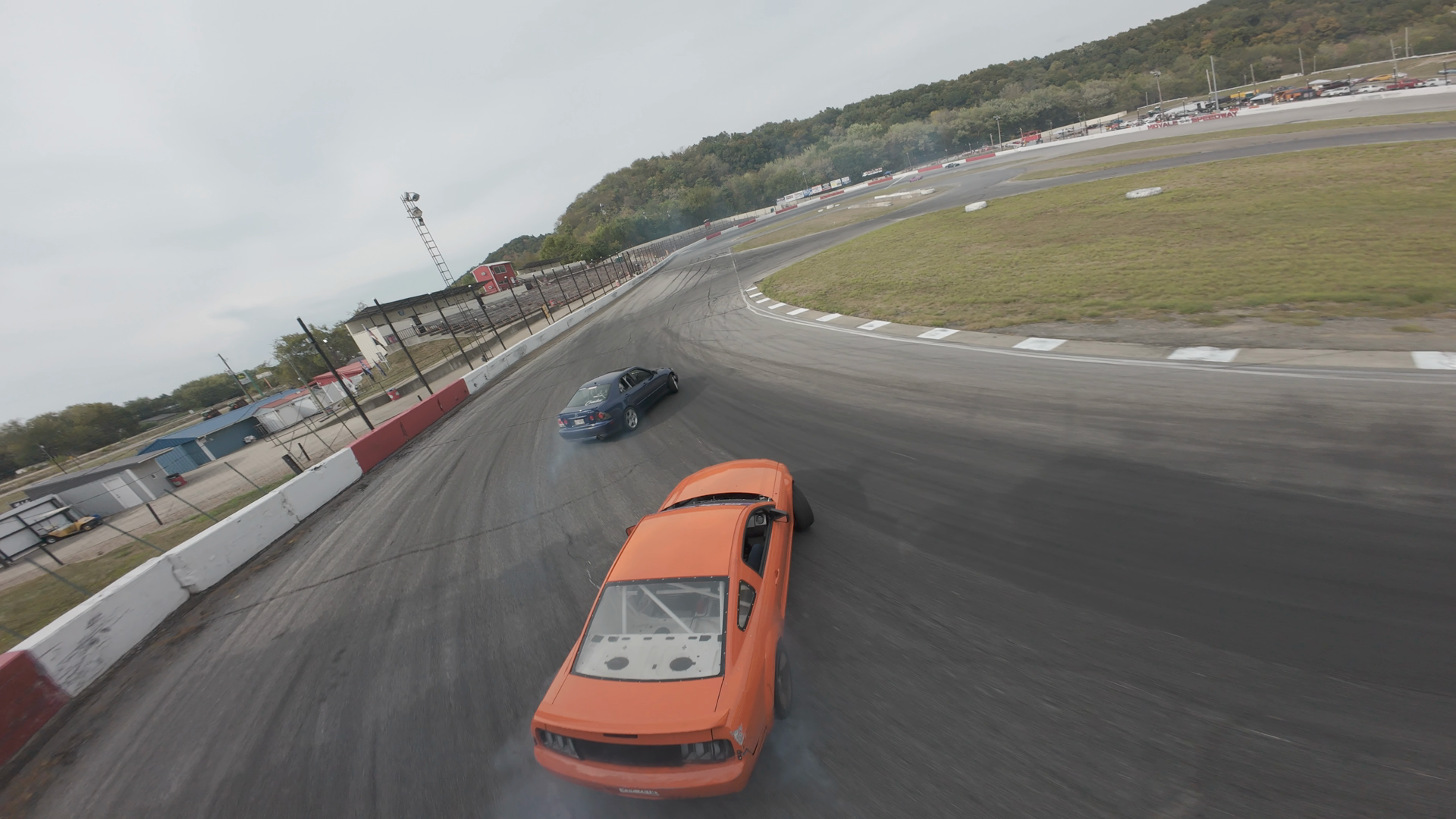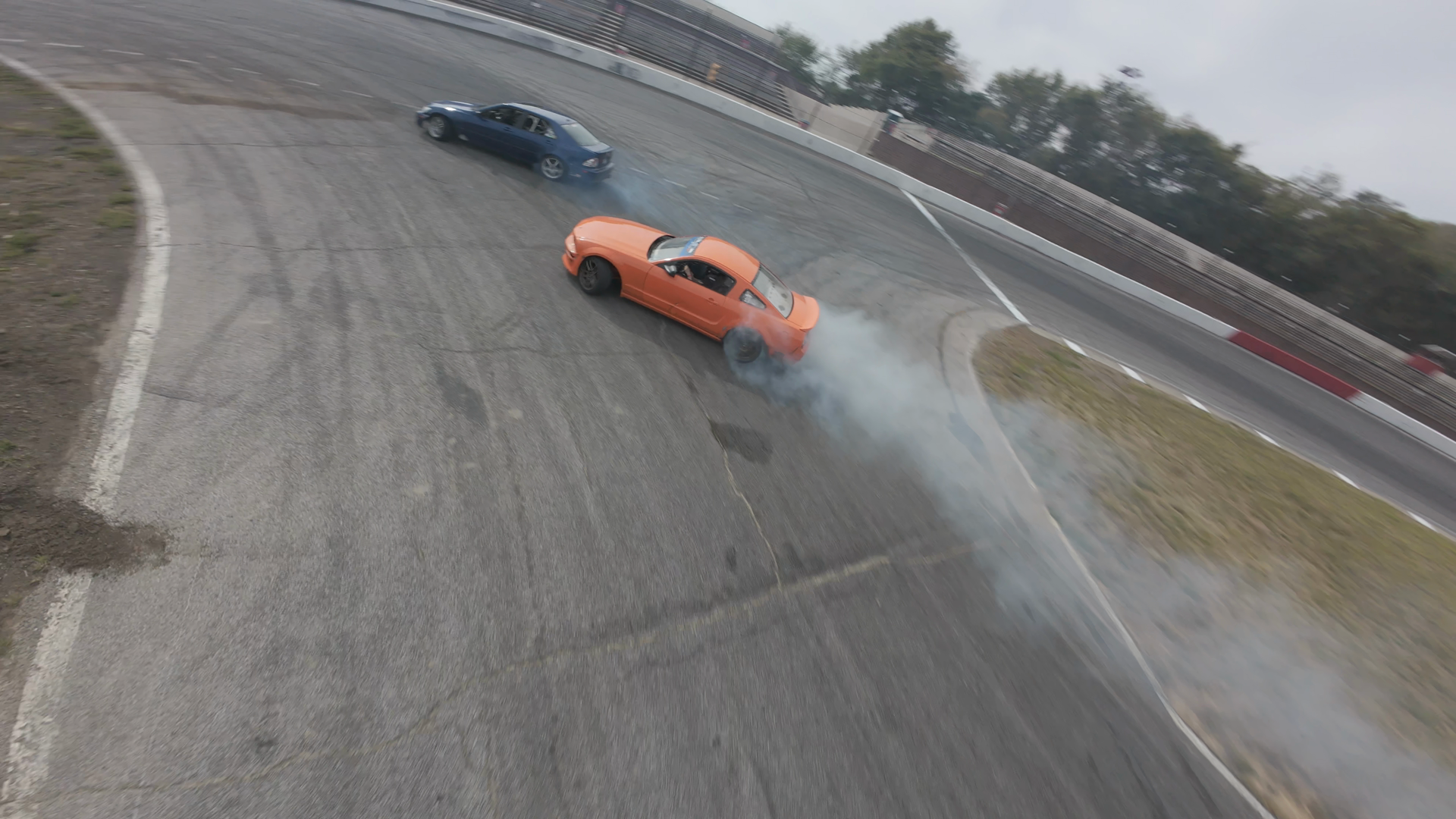 The image captures two vehicles, one orange and one blue, drifting on a racetrack at Midvale Speedway. The orange car is closer to the camera and appears to be the lead vehicle, with visible smoke coming from its tires, indicating it is undergoing a drift maneuver. The track is asphalt with barriers and a green hill in the background. The blue vehicle is slightly further back and is also part of the drift. The vehicles are low to the ground with sporty designs, and the surrounding environment includes racing facilities and grassy areas. The image conveys the excitement of live drifting at the event.