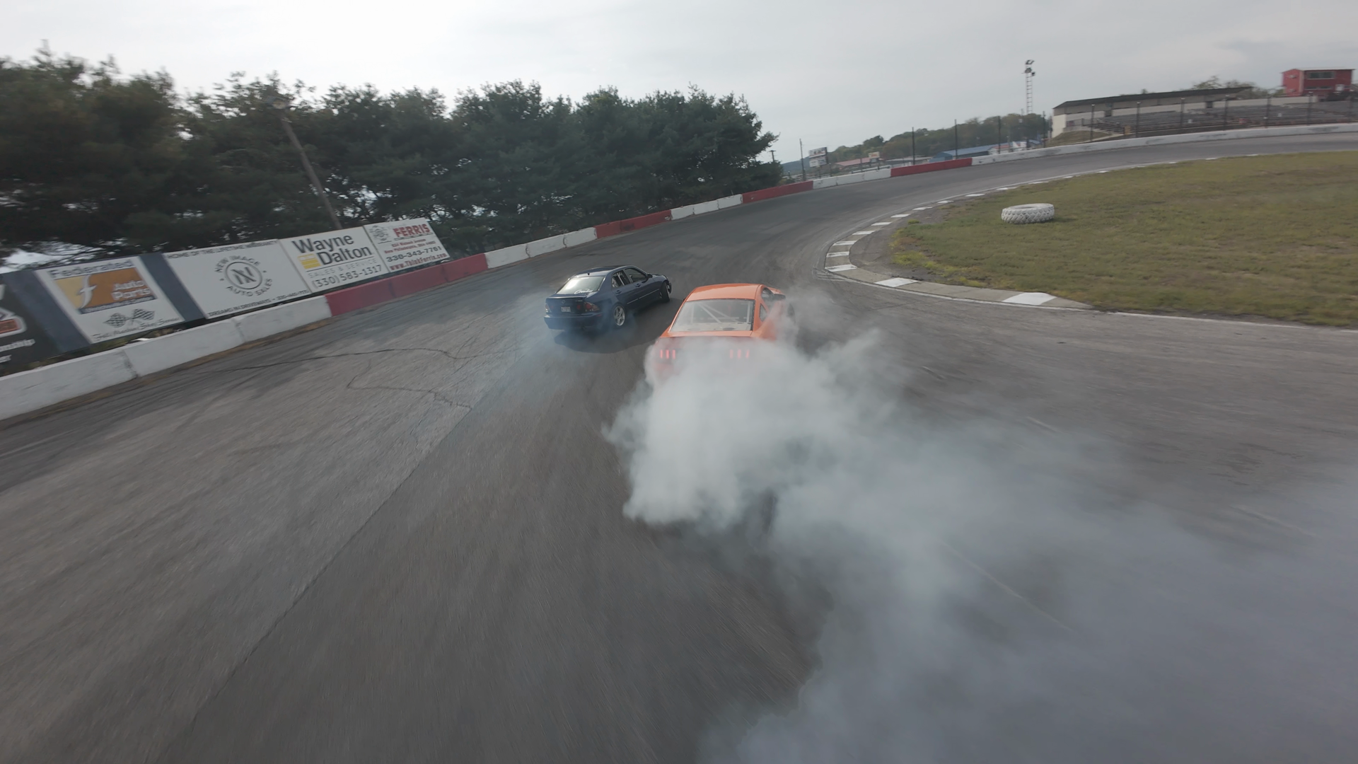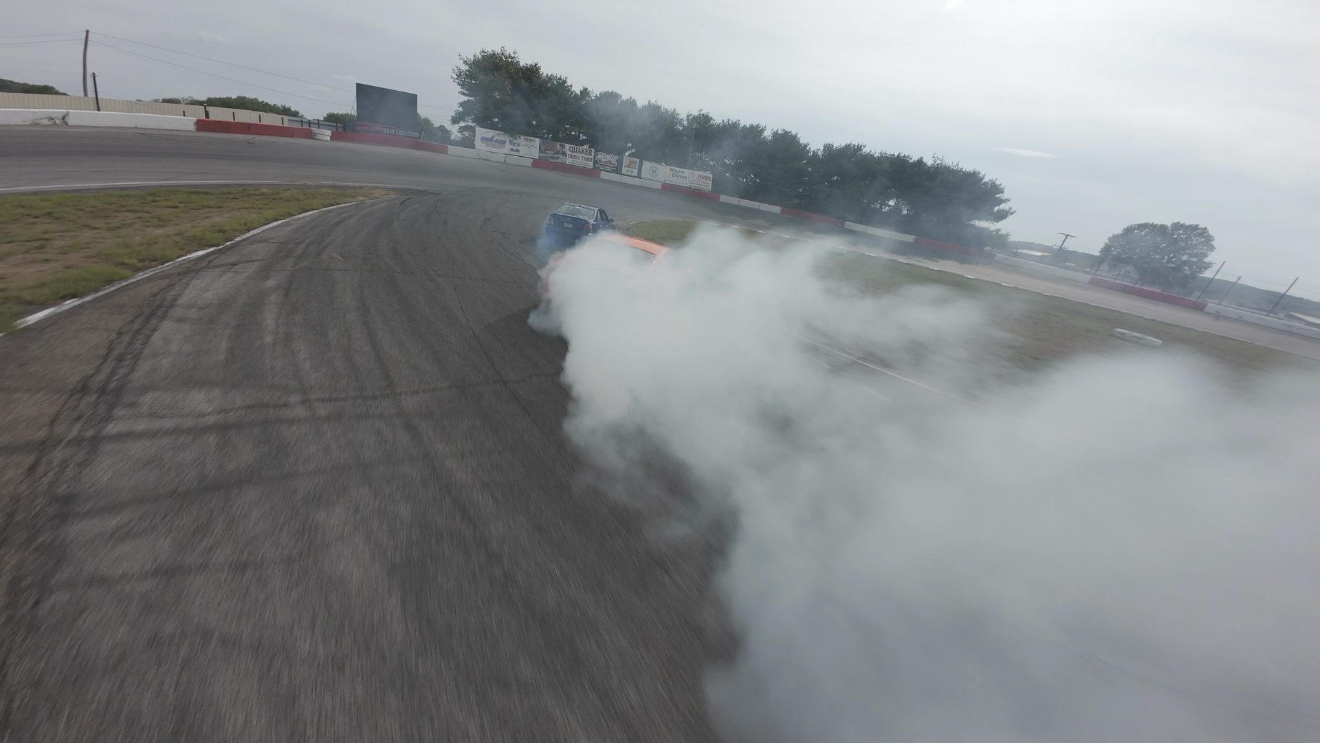 Two cars are seen drifting on a racetrack, creating a significant cloud of tire smoke as they maneuver sharp turns. The cars are emitting thick clouds of white smoke, indicating powerful tire-squeal conditions as they attempt to drift around a curve. The track is bordered by safety barriers and promotional banners that advertise nearby businesses like Fedders Exhaust and Wayne Dalton. The sky is overcast, and the scene suggests an intense drift race or drifting session.