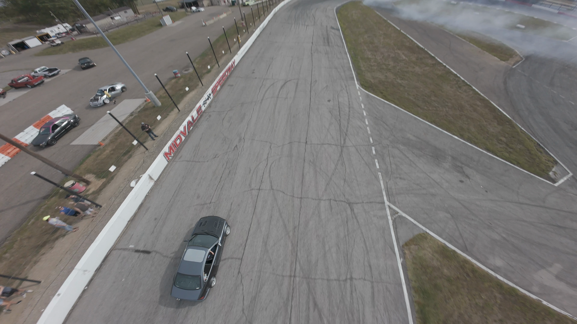 An aerial view shows a car practicing drift on the asphalt track at Midvale Speedway. The roadmarking is visible on the track. Several other cars are in the background, parked at the start/finish area. Spectators are seen walking around the track, some leaning on the fence near the speedway signage. The track is surrounded by grass, utility poles, and small buildings in the distance. The event appears calm, with no significant action happening.