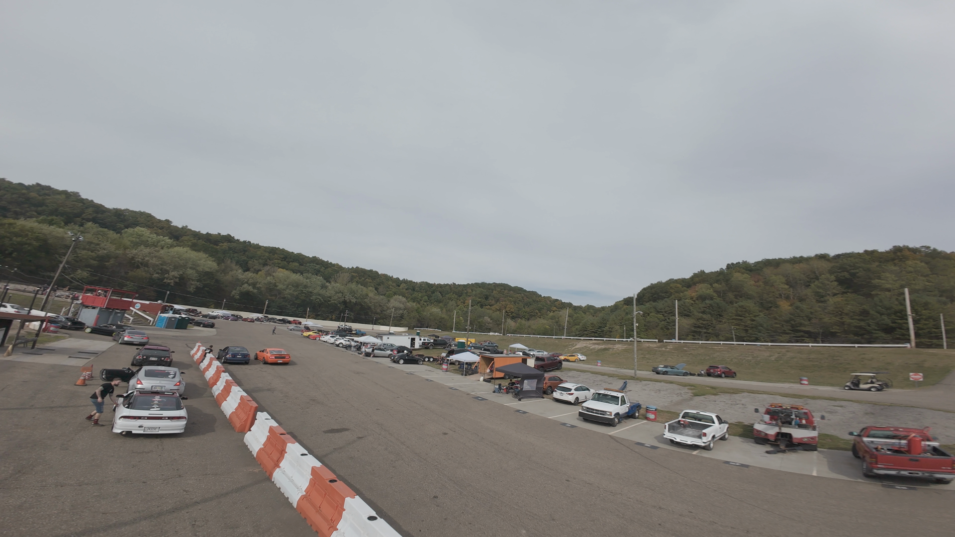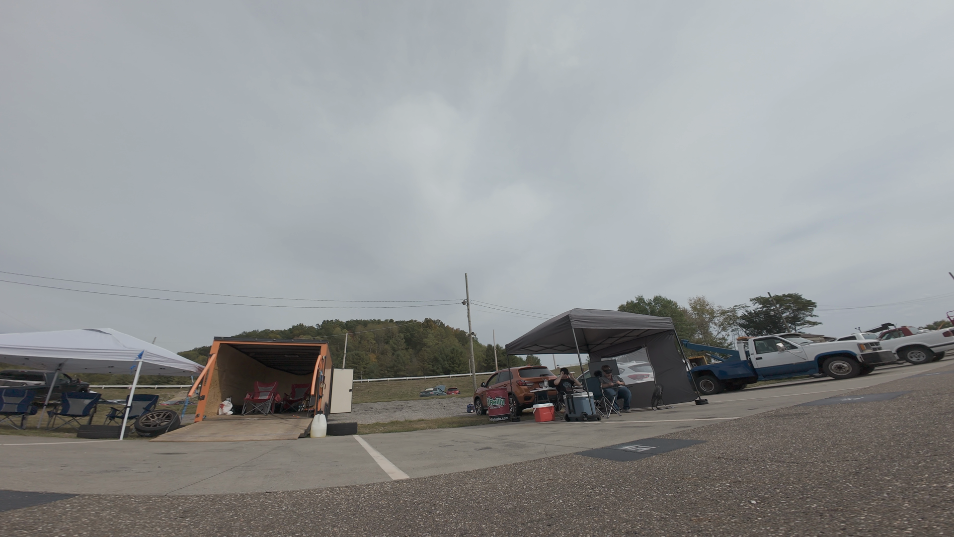 The image shows a wide-angle view of a parking area at Midvale Speedway, under an overcast sky. Several cars are parked, and there are people sitting around under a gray pop-up canopy. There's an orange structure, possibly a trailer or storage unit, near a white tent with blue flaps. Several folding chairs and tables are set up for spectators or participants. The area appears calm with no visible activity, and no signs of ongoing drift or race at the moment of the image.