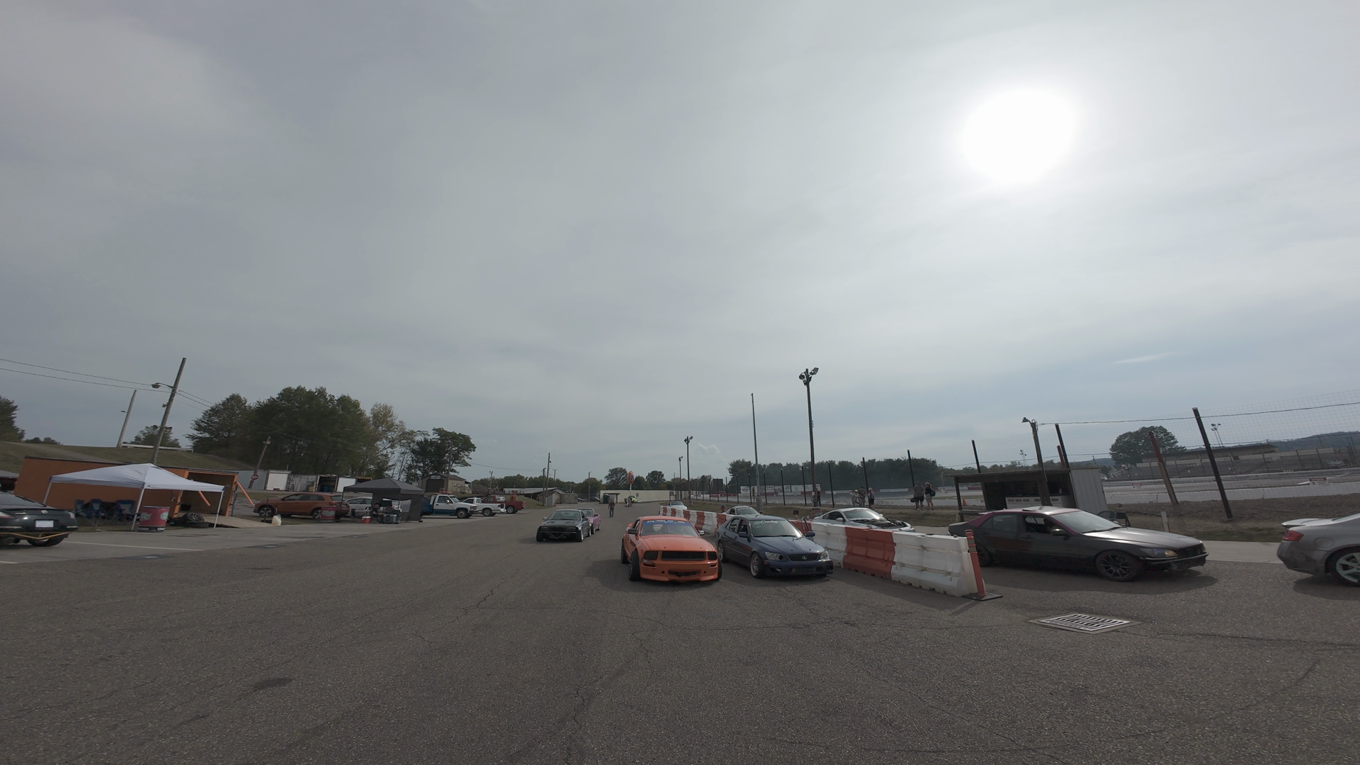 The image shows a wide view of the parking area at Midvale Speedway, where several performance cars are parked. The sky is overcast, and the lot appears to be mostly empty except for the vehicles and some scattered belongings like trash cans and portable toilets. In the background, there's a row of low buildings, and beyond that, a view of the race track. The cars are positioned in a way that suggests they are preparing for a drift event, indicating readiness for automotive activities at the track. There are no visible signs or branding within the image content, but one car has noticeable paint damage, adding a gritty realism to the setting.