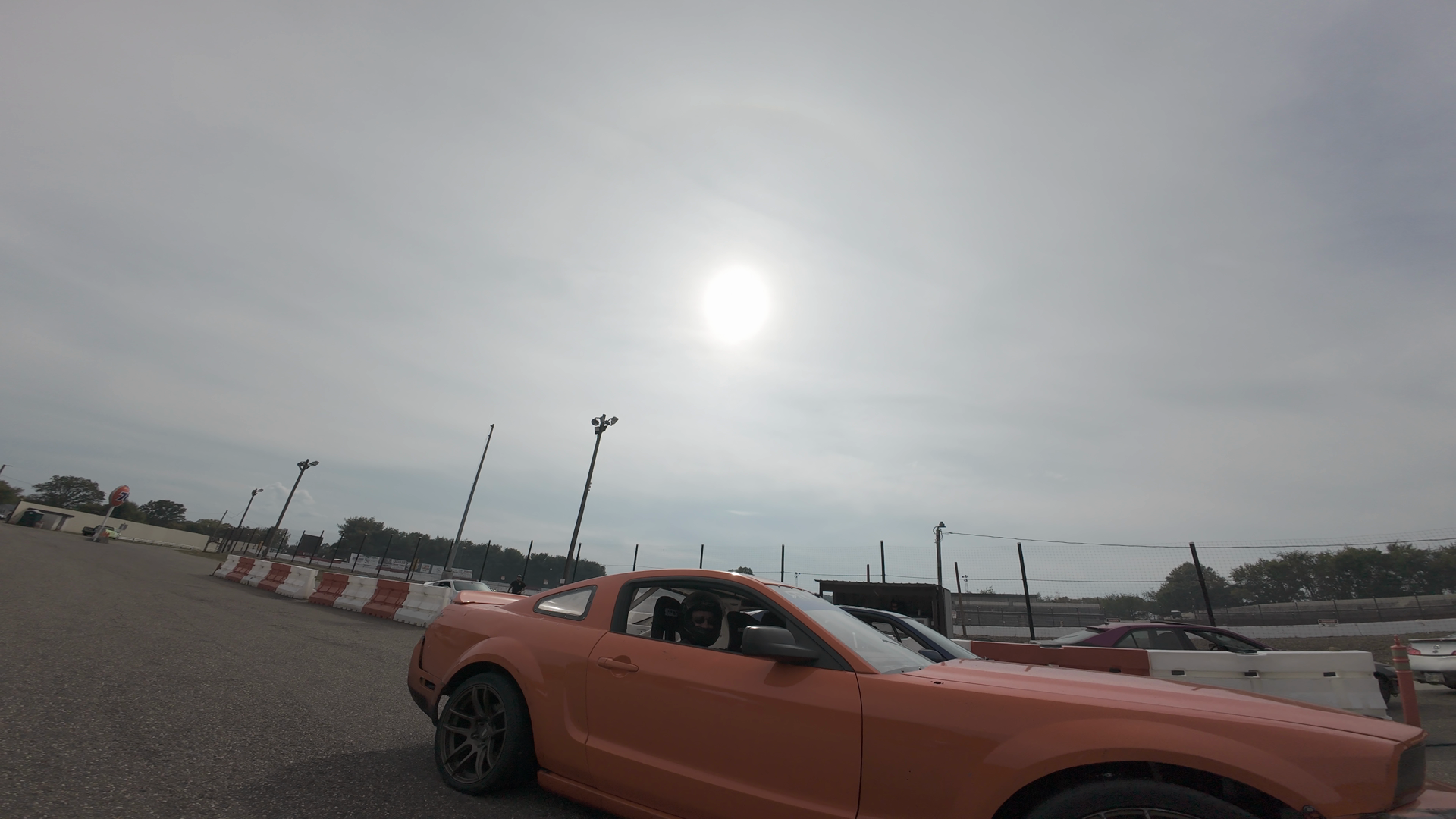 A bright orange Ford Mustang is stationary in the paddock area at Midvale Speedway, preparing for or concluding a drifting session. The car's top is down, allowing the driver to have a clear view of their surroundings. The driver's side window is rolled down. In the background, there are other cars, including a white racing truck parked nearby. The setting is overcast with low natural light, and the sun is visible in the sky, casting a soft glow over the scene. There’s a glimpse of the racetrack in the distance, enclosed by safety barriers and surrounded by trees and other structural elements. The scene suggests preparation for a competitive drift event, indicating an exciting atmosphere.