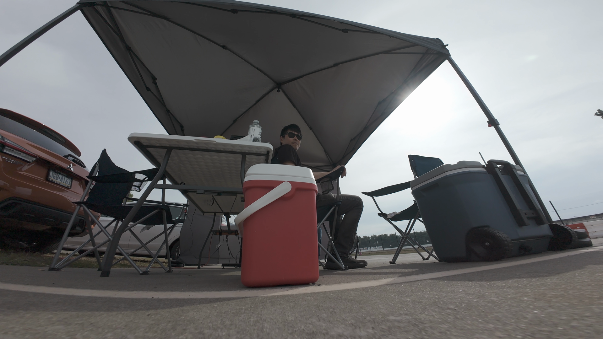 The image shows a man relaxing under a canopy in a race track tailgate area during the Club Loose Drift event at Midvale Speedway. The man is seated on a folding chair and leaning slightly back, with an air of casual comfort. Next to him is a large red cooler, indicating a relaxed, social atmosphere ideal for attending an event like this. The tent provides shade over the seating area, with a car parked nearby and other race-related equipment visible in the background. The setting is a flat asphalt area, common for race track surroundings, suggesting a warm day perfect for such an event.