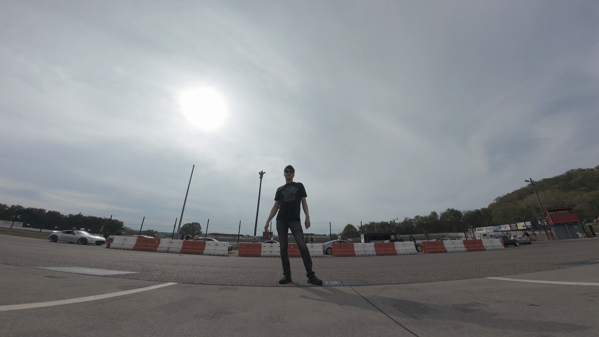 A man stands on a track set at Midvale Speedway, preparing for a race. He wears a black graphic t-shirt, gray pants, and black sneakers. The sky is bright with scattered clouds, and a race car is parked near him, partially visible in the background. The setting appears readiness-oriented with cars lined up and safety cones set up. There are also bystanders and spectators in the distance, indicating the beginning or preparation phase of the event.