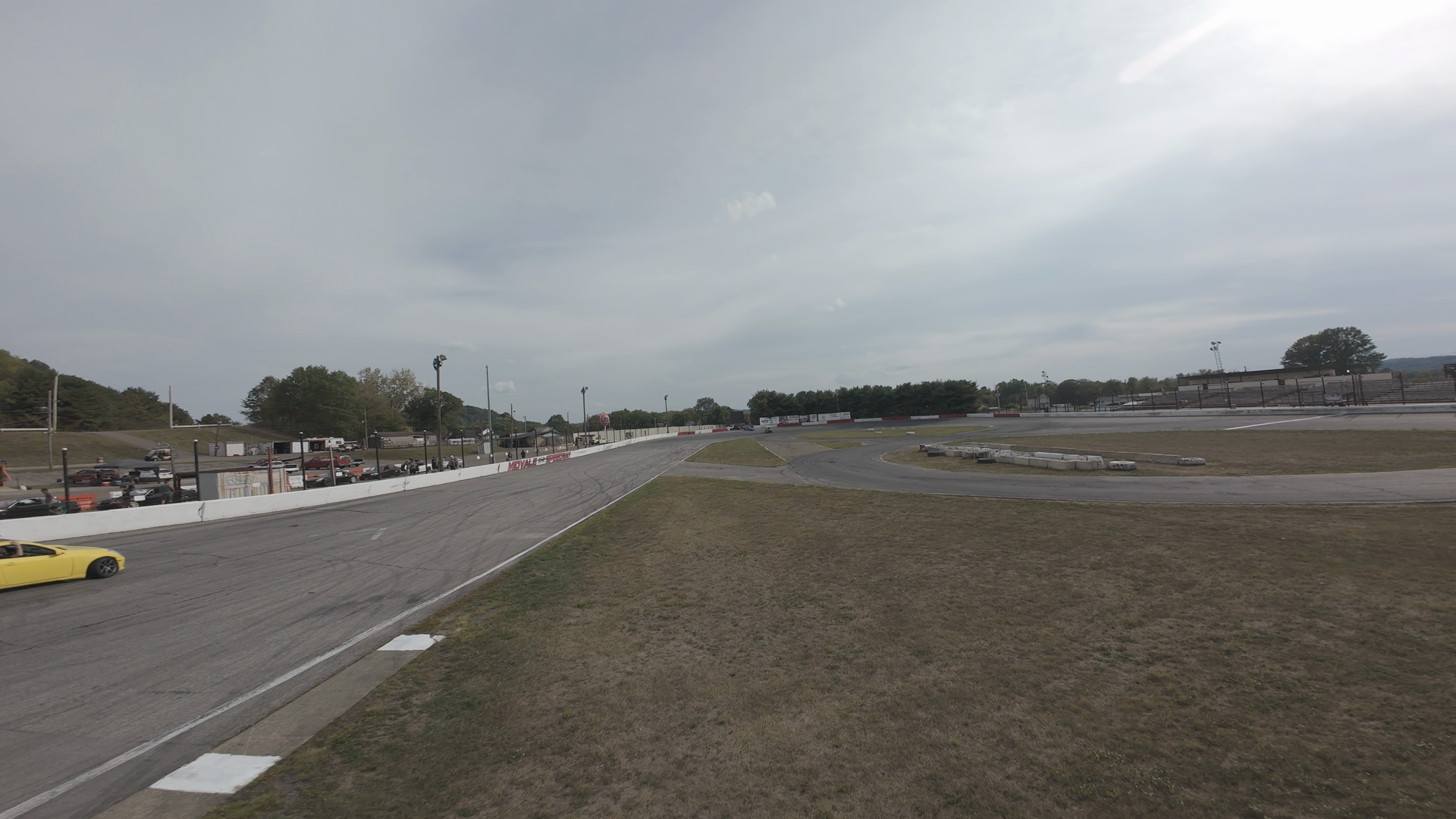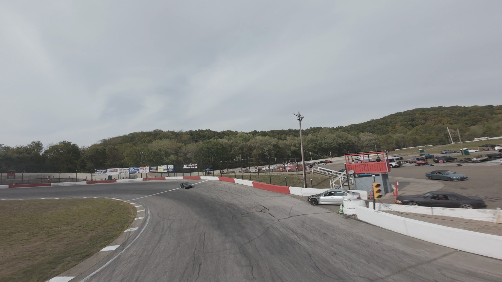 A car, possibly a sedan, is seen on a race track at Midvale Speedway. The car is facing away from the camera and appears to be stationary or moving very slowly on the curve of the track. The track is bordered by grass and some tire recovery hoops are visible. The surrounding area includes some trackside facilities and a backdrop of trees and overcast skies.