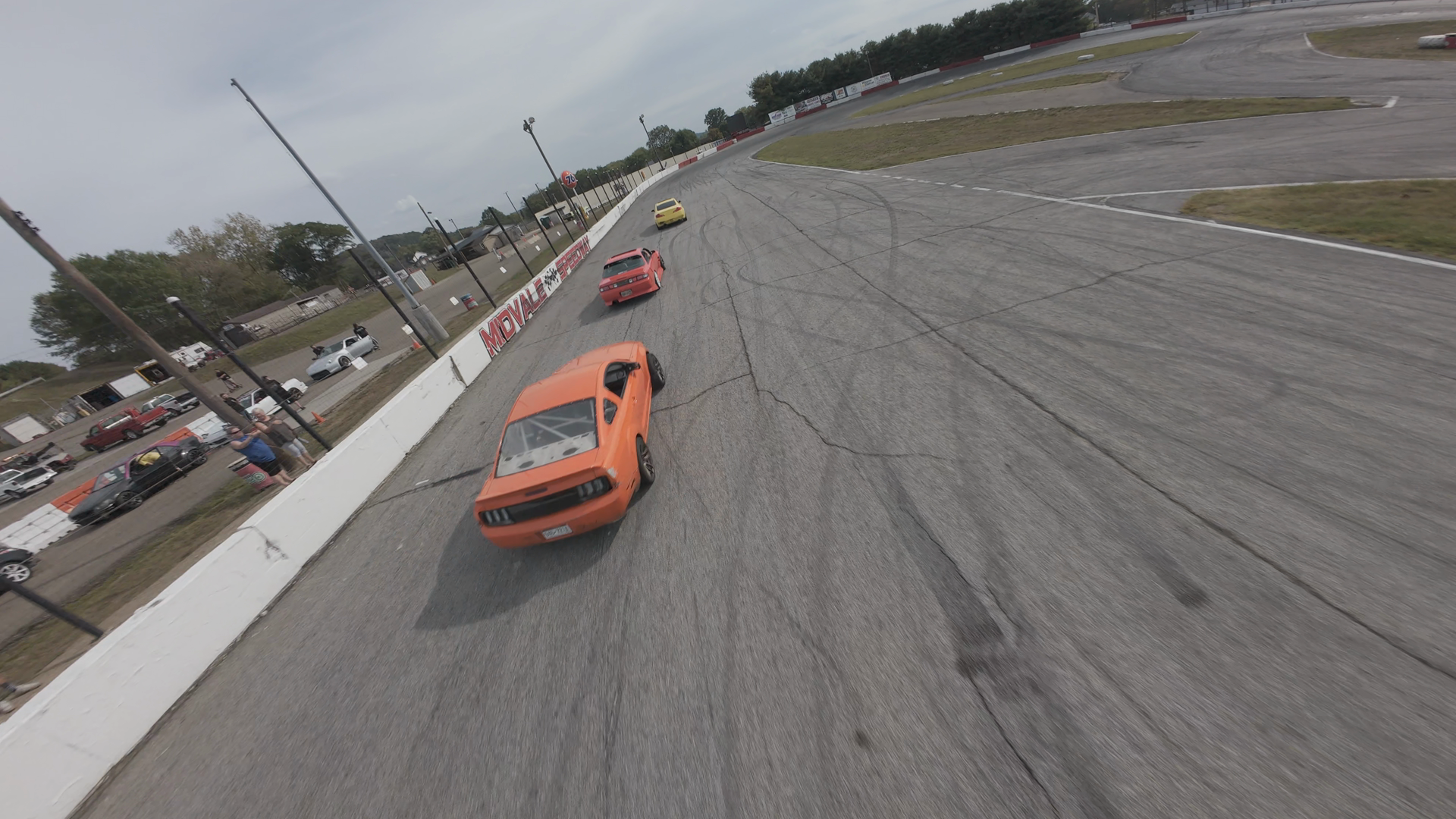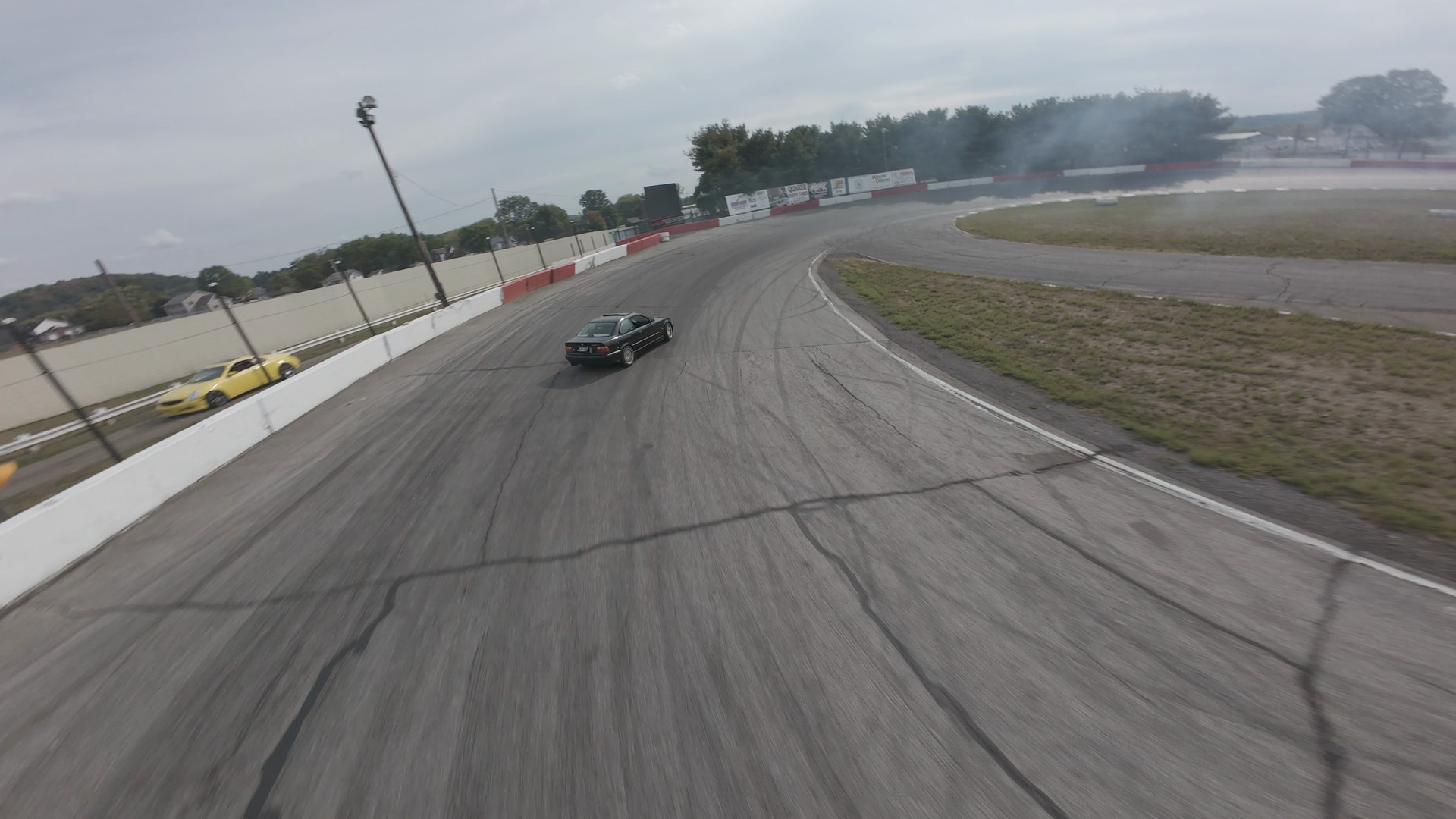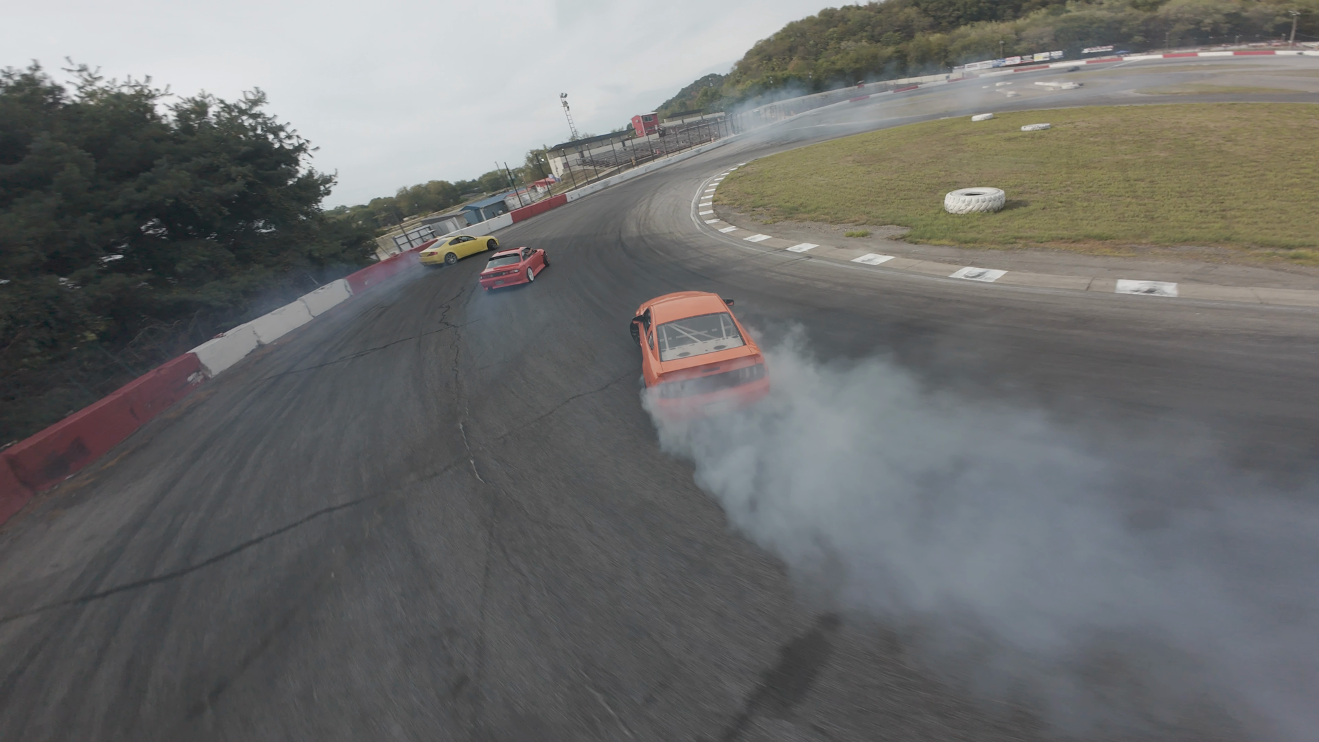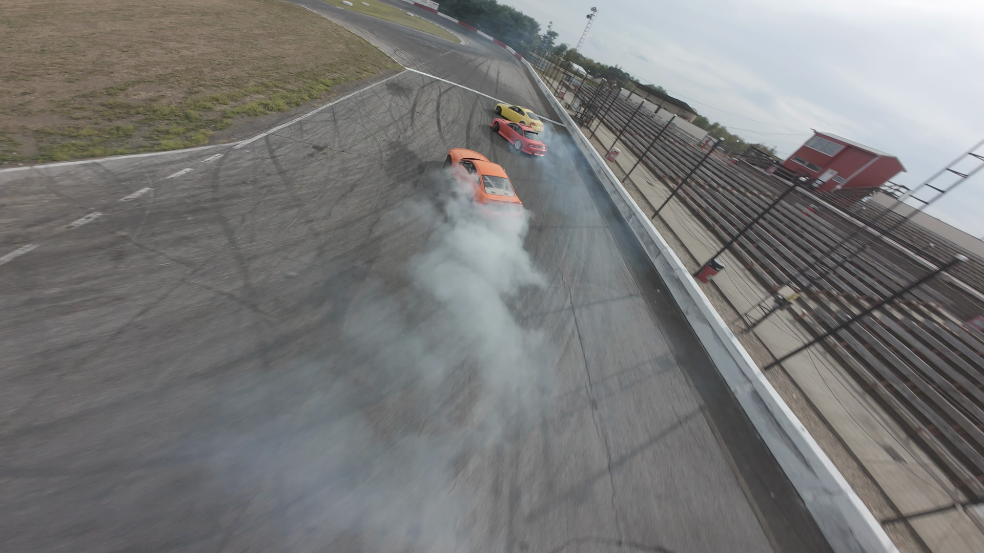 The video captures the thrilling moment of a drift race at Midvale Speedway. Two cars are seen in a tight corner with smoke billowing from their tires, highlighting the intensity of the drift session. The lead car is an orange racing vehicle, likely designed specifically for drifting, showcasing its modifications for high-performance driving. The second car is a yellow vehicle, positioned closely behind. Both drivers are focused, maintaining precise control over their vehicles, indicative of a competitive setting. The track layout shows curves and sections where the cars are performing their high-speed maneuvers. The environment includes theMidvale Speedway's surroundings with trees and a clear sky, suggesting an outdoor race day.