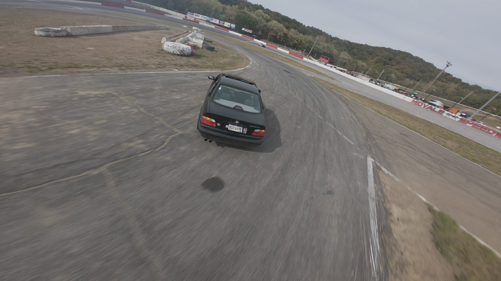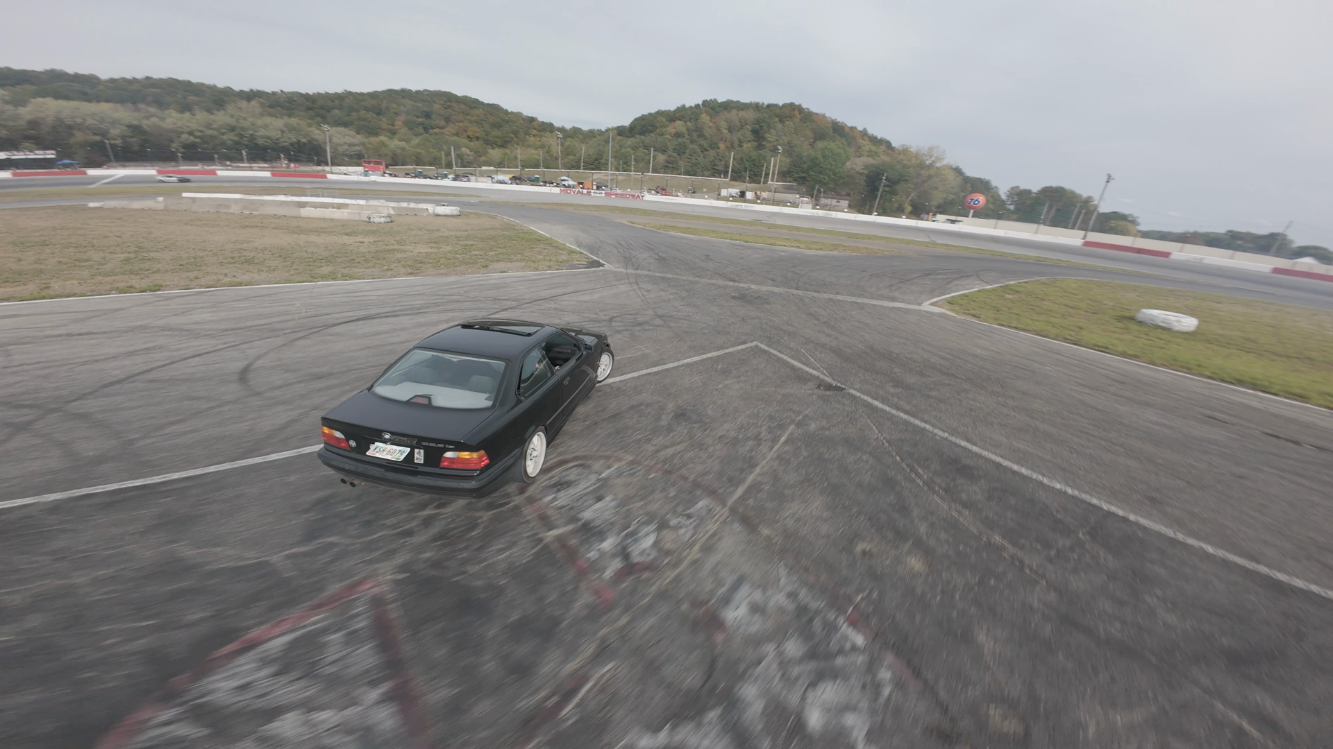 A black BMW drifts around a curve on a racetrack with visible tire marks from previous drift sessions. The car is moving at a moderate speed, indicated by the clean traction of its tires. The track is surrounded by a grassy area and a few stationary vehicles and equipment can be seen in the background. The sky is overcast, and there are no people visible in the image, emphasizing the focus on the vehicle's motion and the track environment.