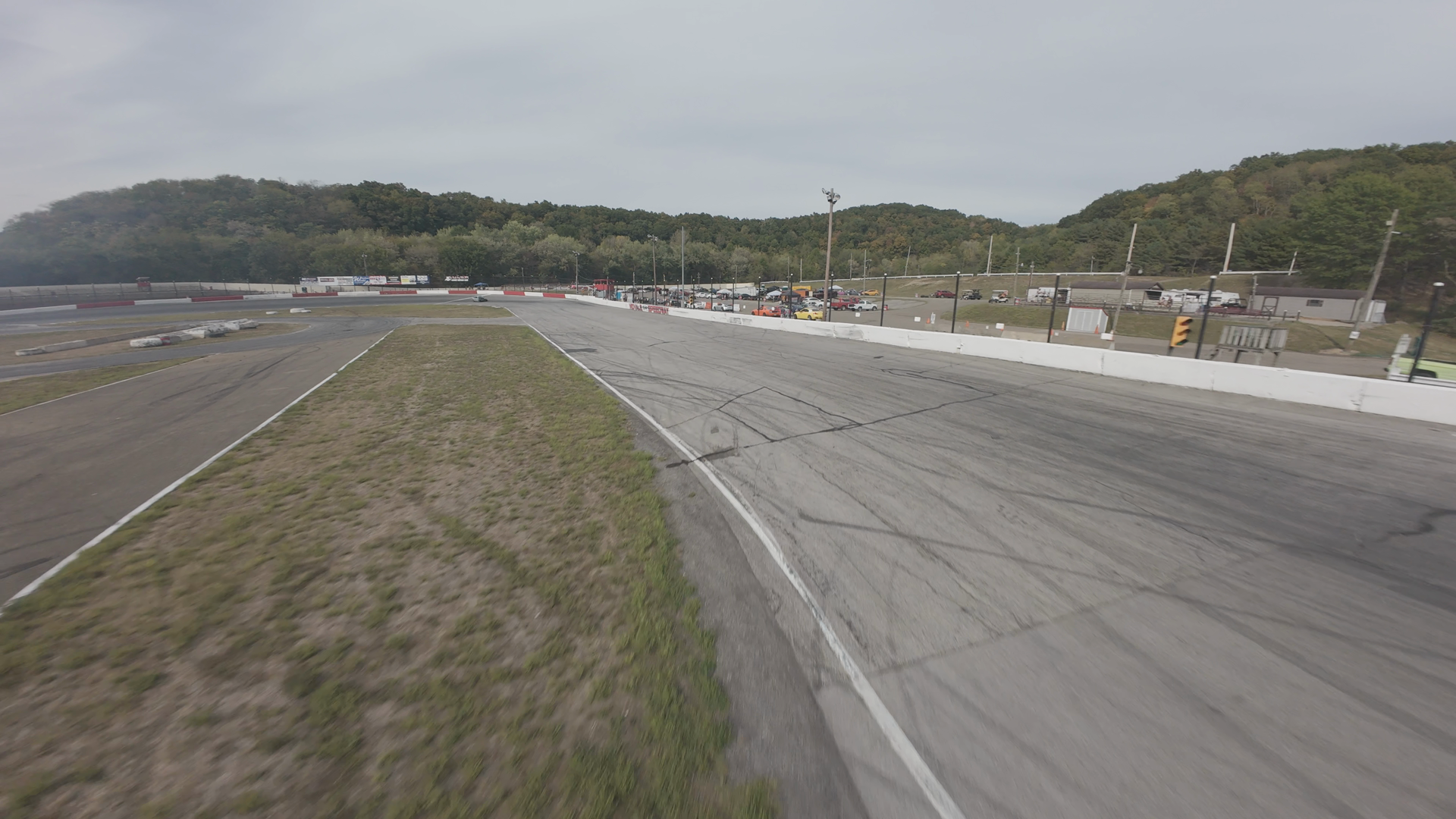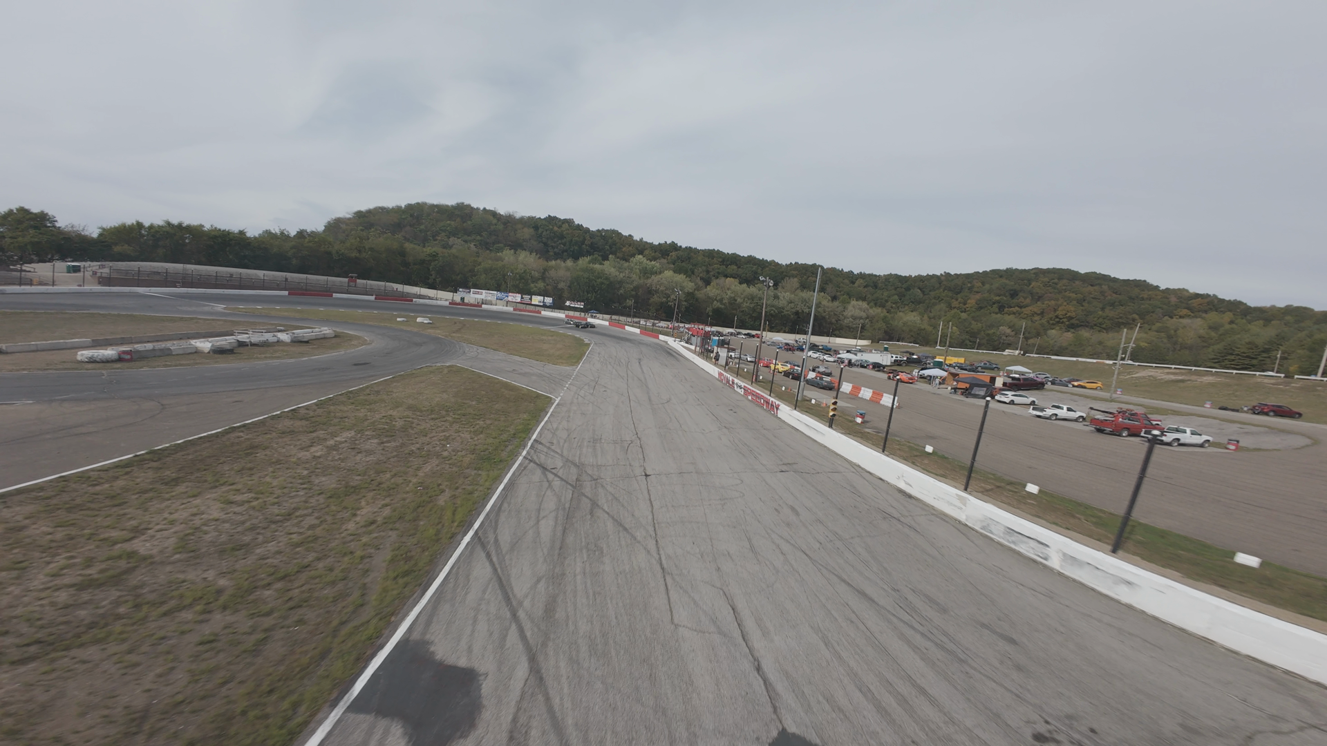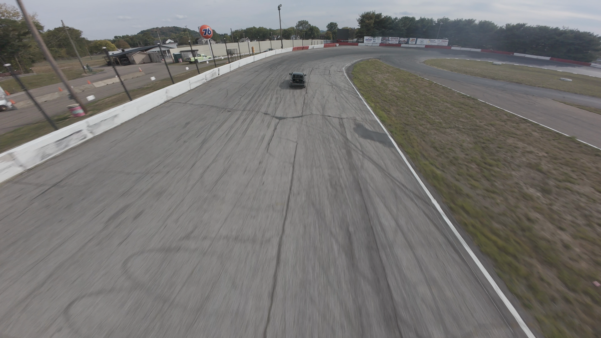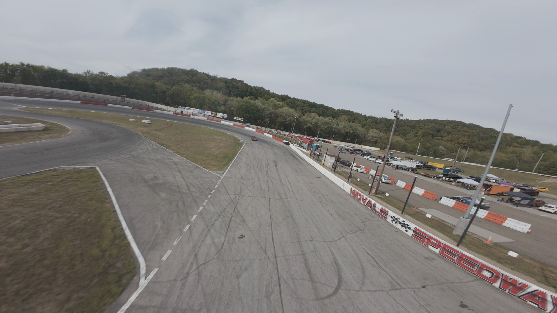 An aerial view of a vehicle driving on the Midvale Speedway. The vehicle is in the middle of the track, making a slight turn, with a worn asphalt surface showing signs of frequent use. The surrounding area includes fencing, grassy patches, and parts of the spectator area and facilities. The scene captures the dynamic movement of the car against the serene backdrop of the speedway and open landscapes in the distance.