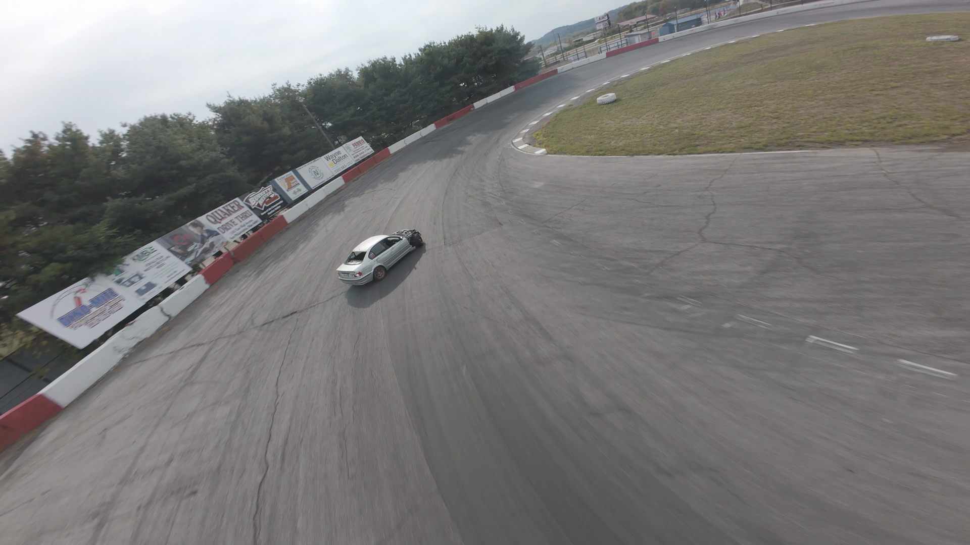 An aerial view captures a close-up of two cars drifting on a racetrack, surrounded by a track bordered by red and white barriers. The scene shows an orange car leading the drift curve with visible tire smoke, while a yellow car follows closely behind. The racetrack appears to be a short circuit, as observed by the lack of grandstands or large spectator areas in the immediate view. The environment is mostly clear with a hint of overcast skies, indicating possibly cool or mild weather conditions. This appears to be part of a drifting event, likely during the day given the ambient light. The track's surface appears well-worn, with tire marks visible across it.