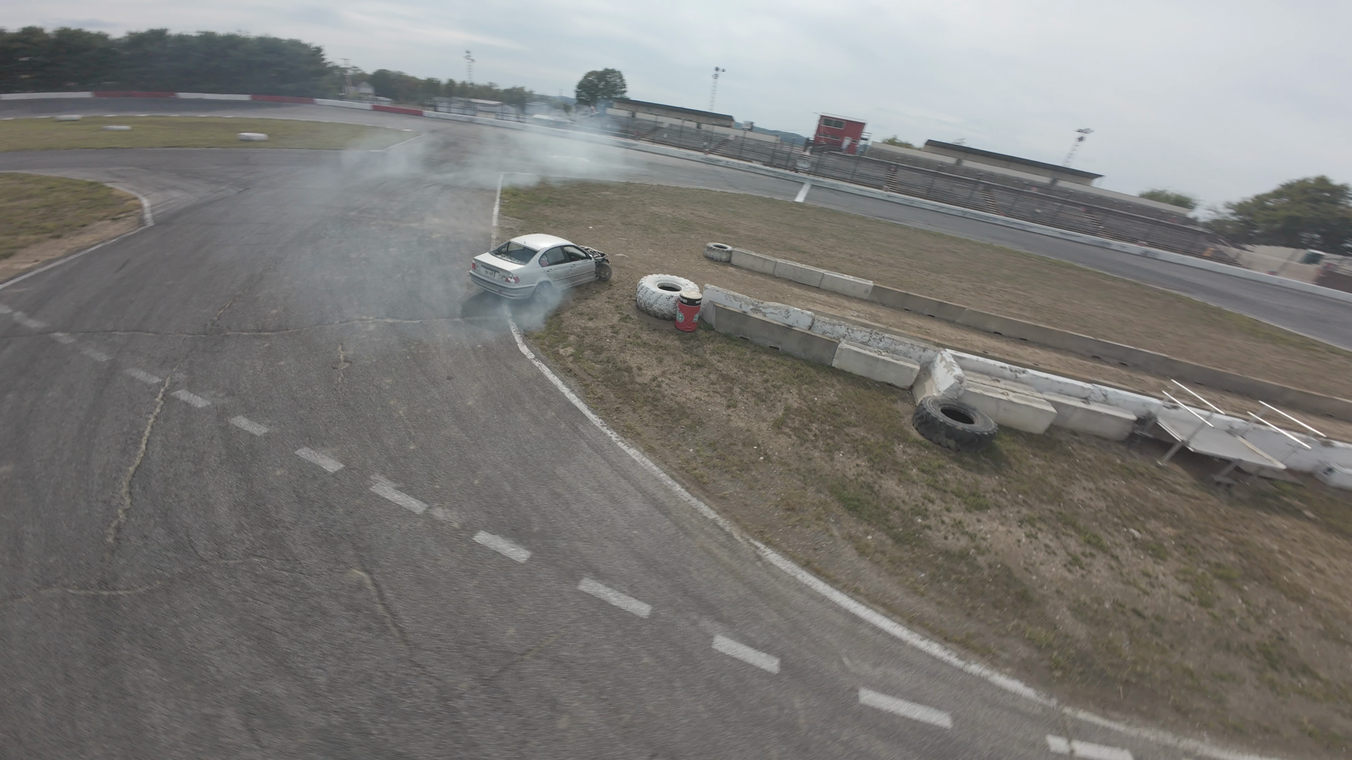 A white car skids dramatically on a race track, generating a substantial cloud of tire smoke. The car appears to have spun out of control, with debris being flung from the rear tire onto the dirt beside the track. The scene is captured from an FPV drone, highlighting the dynamic action with a wide-angle view. There are tire barriers visible in the background, and the track is surrounded by bare earth and sparse vegetation, indicating a relatively new or under-maintained area. The excitement level of the scene is low due to the lack of active cars and the static nature of the single incident.