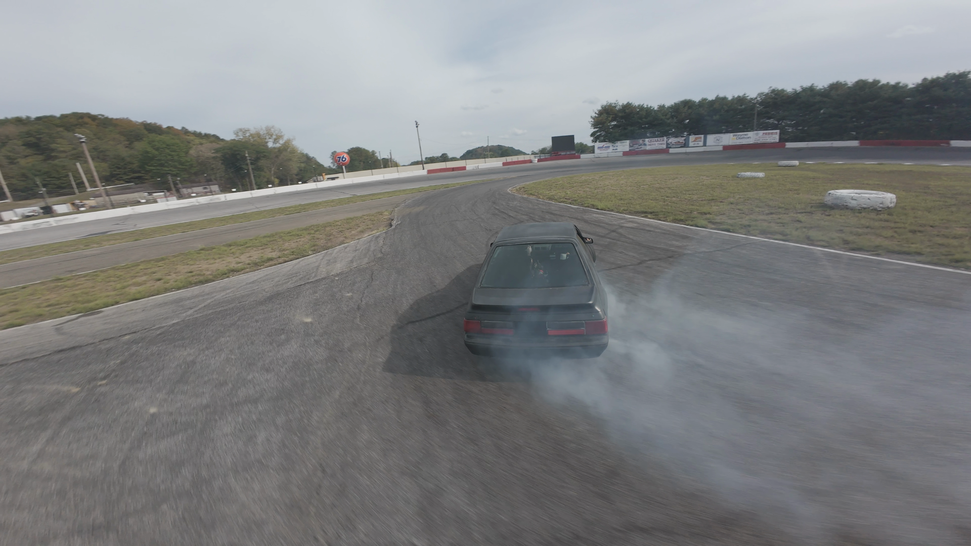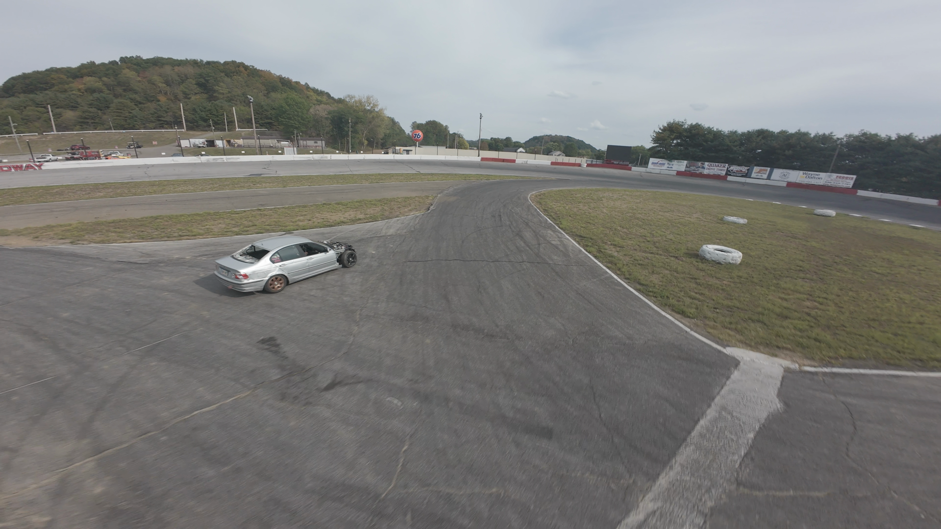 A blue car is captured in action from an aerial perspective, making a dramatic drift turn around a curve on a racetrack. Smoke trails behind the car, emphasizing the power and precision of the maneuvers. The scene is set at Midvale Speedway in Ohio, with other cars and racing facilities visible in the background. The driver inside the car appears focused, though the driver’s details are not clear.