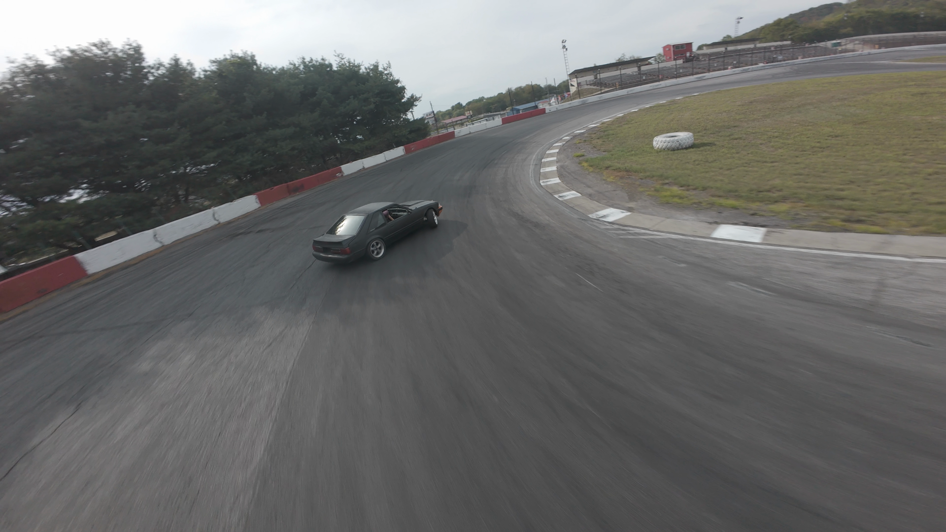 A gray sedan is captured from a drone shot driving on the smooth asphalt surface of a racetrack. The car is heading towards a curve with red and white curbing, indicating a cornering area. The surrounding environment includes green grass and trees in the background, as well as distant buildings and structures that form part of the racetrack facility. The car appears to be in motion, possibly at a relaxed cruising speed, with an empty interior due to the lack of occupants in the image. The scene is well-lit, suggesting daytime.