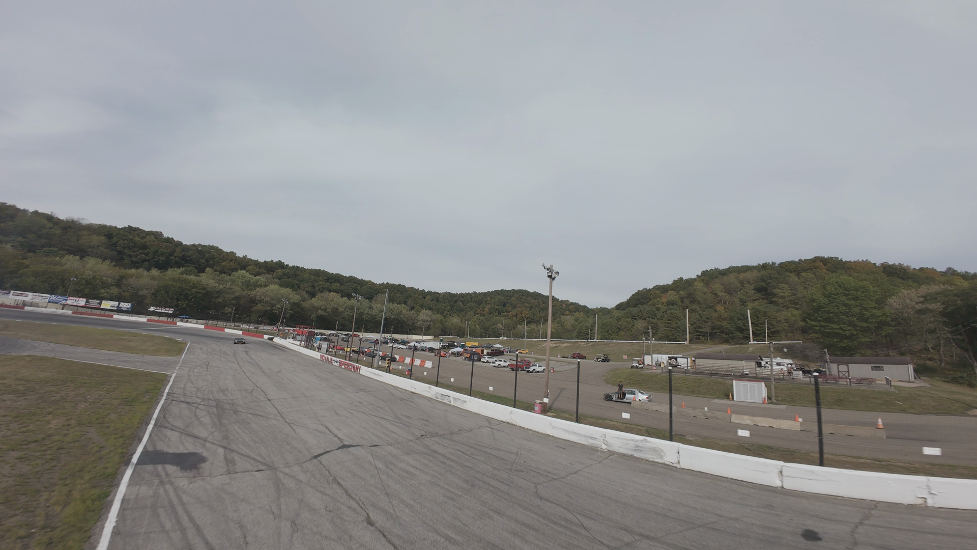 The image captures an expansive view of Midvale Speedway, showcasing the curved layout of the racetrack with tire skid marks prominently marking the surface's use. The track is bordered by a mix of fencing, grassy areas, and a backdrop of forested hills. In the distance, cars and small trailers are parked on the infield, suggesting preparations for an upcoming drift event. The scene conveys the anticipation of a racing gathering, with a calm and overcast sky adding a neutral tone to the setting.
