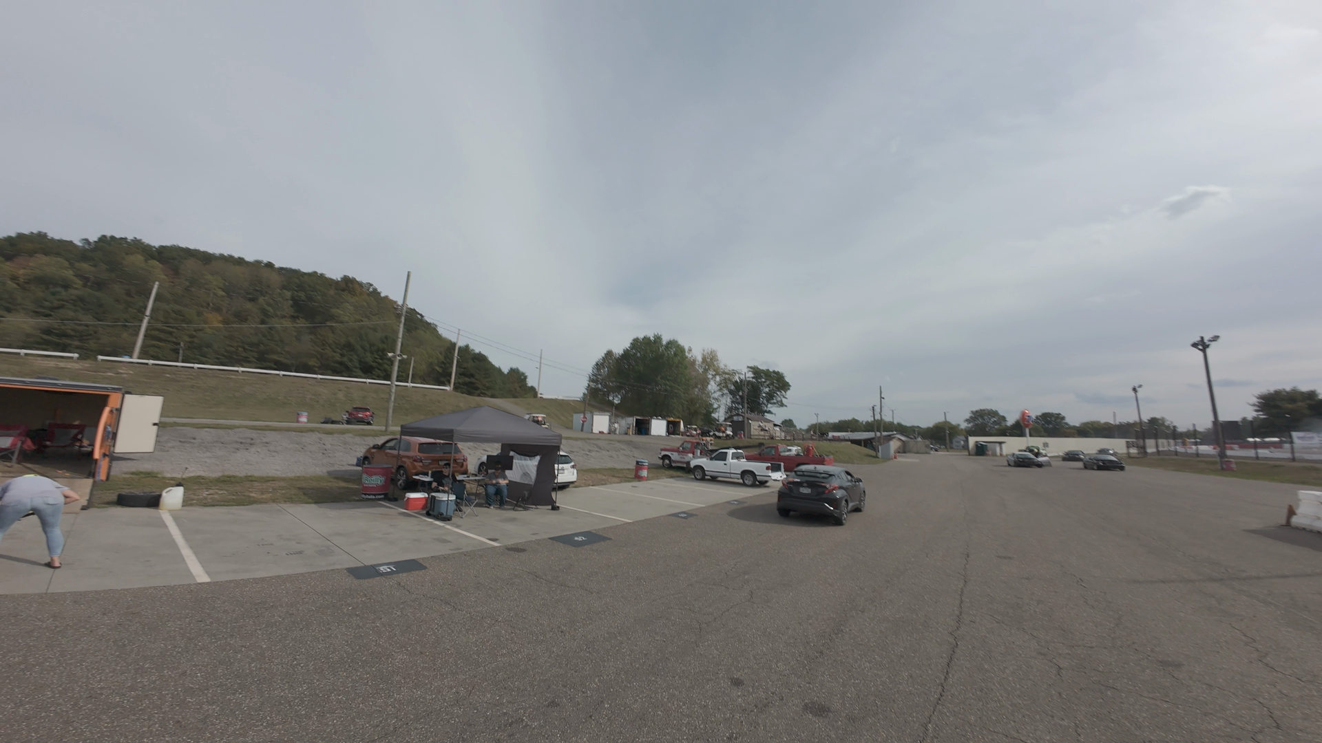 The image shows an open space at Midvale Speedway, a popular racing venue. The area features a wide parking lot with several vehicles, including a white truck and a silver car. People are either standing or sitting under a canopy near the right side of the image, suggesting a break or rest area. The background includes a section of the speedway track bordered by hills on one side and utility poles and other structures on the other. The weather appears to be overcast, with a cloudy sky. There are no cars currently on the main track, indicating that the drifting event from the Club Loose Drift might have ended or is not in progress at the moment of the photo.