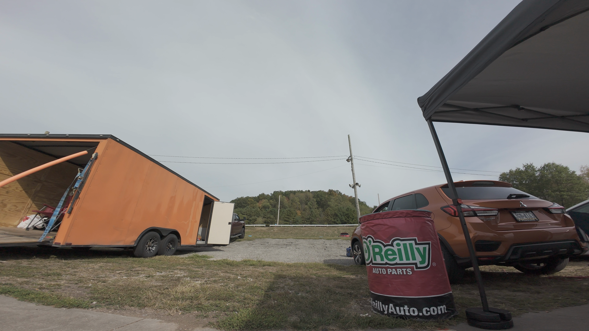 The image shows an orange trailer with an open ramp parked on a dirt lot near the area of Midvale Speedway. Adjacent to the trailer, an orange vehicle is parked, featuring a promotional sign on the rear box panel reading 'O'Reilly Auto Parts.' The surroundings include a partially covered tent structure to the right and a grassy area in the background. The setting appears to be outside the race track, likely for equipment storage or transport. A tree line can be seen in the distance under a clear sky.