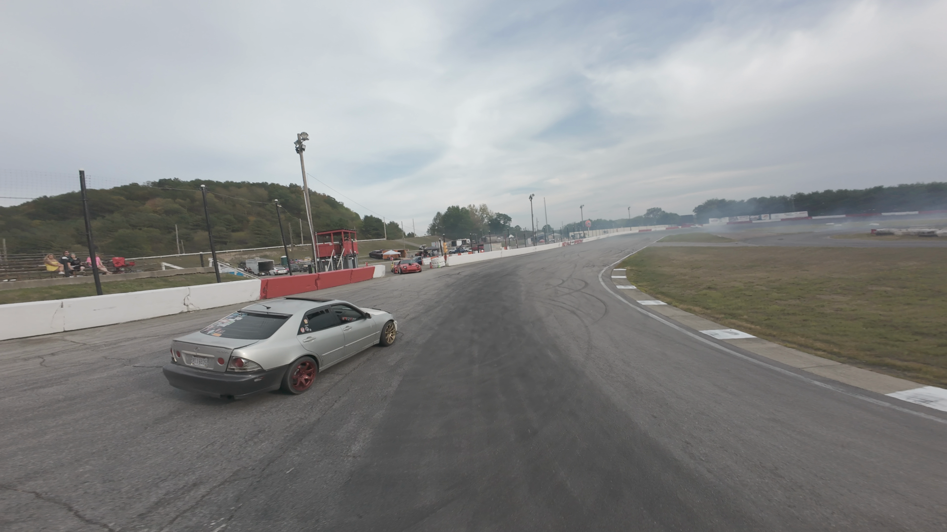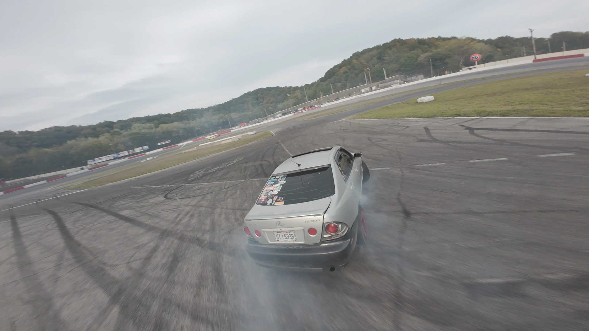 A silver Lexus IS300 is driftin at Midvale Speedway, leaving tire marks on the track and generating smoke from the tires. The car is positioned in the center of the frame, moving forward and angled slightly towards the left. The environment of the track is surrounded by greenery and an overcast sky, indicating cloudy weather. The tires are visibly scuffed and smoking, reflecting an intense and dynamic drift session. The scene conveys an adrenaline-pumping atmosphere, enhanced by the lack of visible spectators, focusing the attention on the high-speed vehicle maneuvering on the asphalt track.