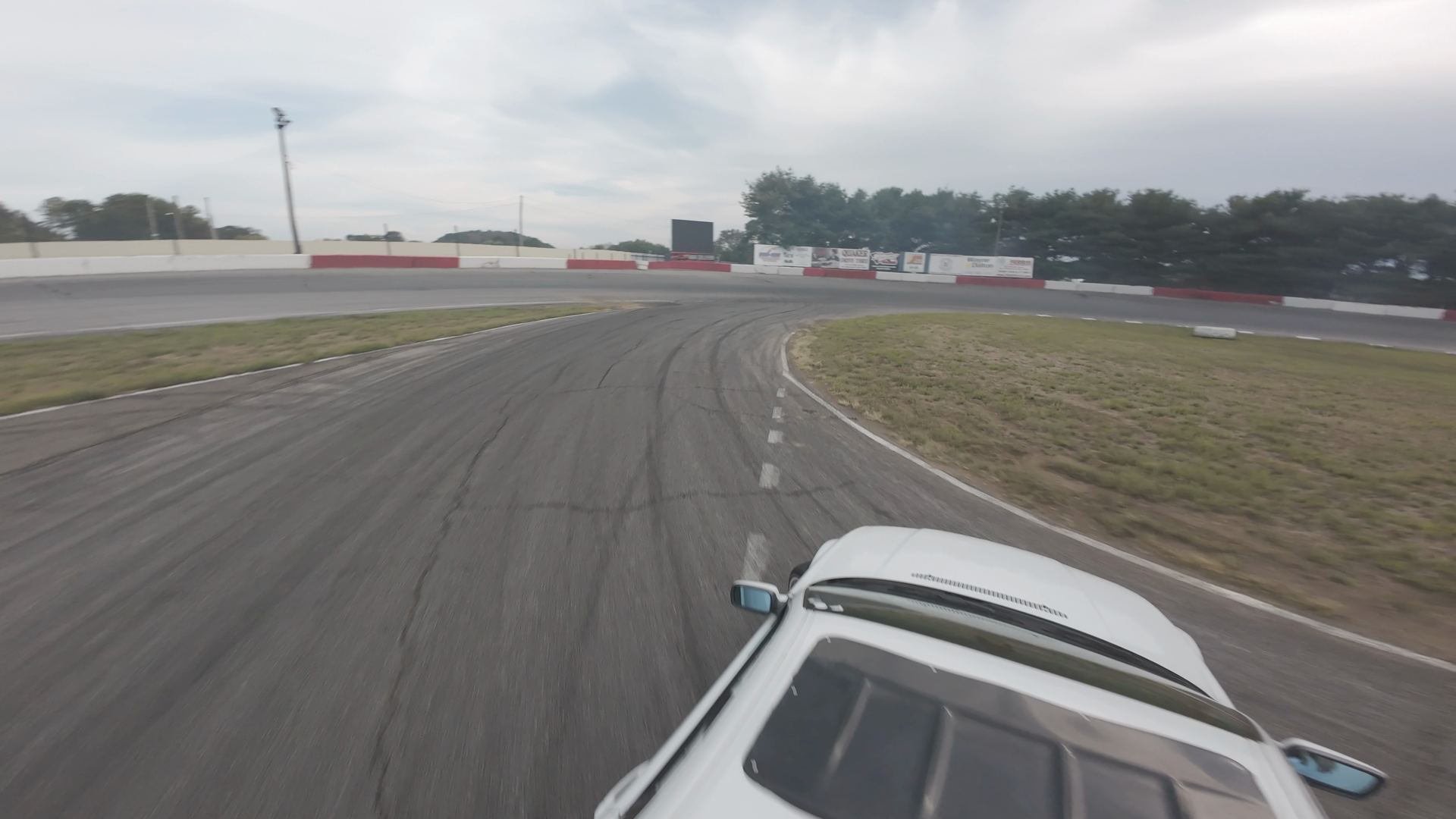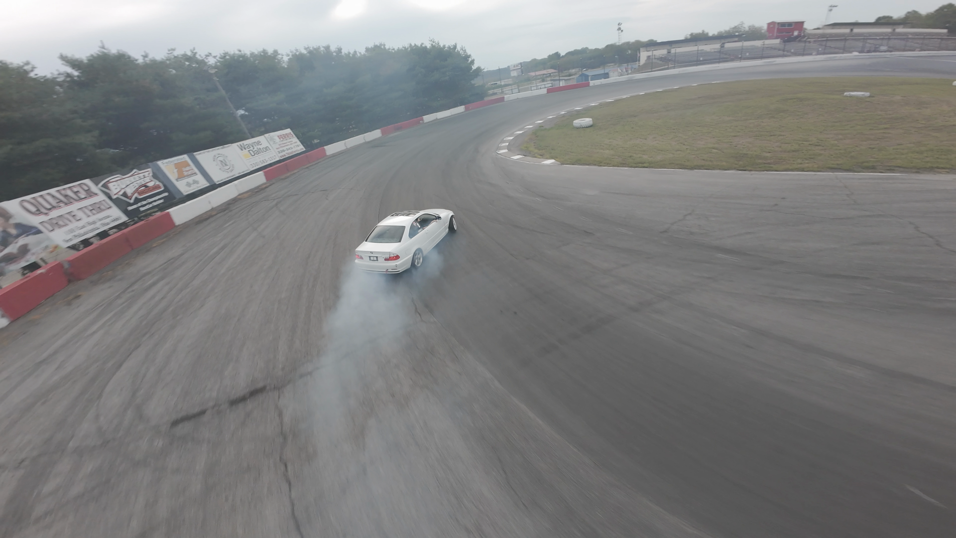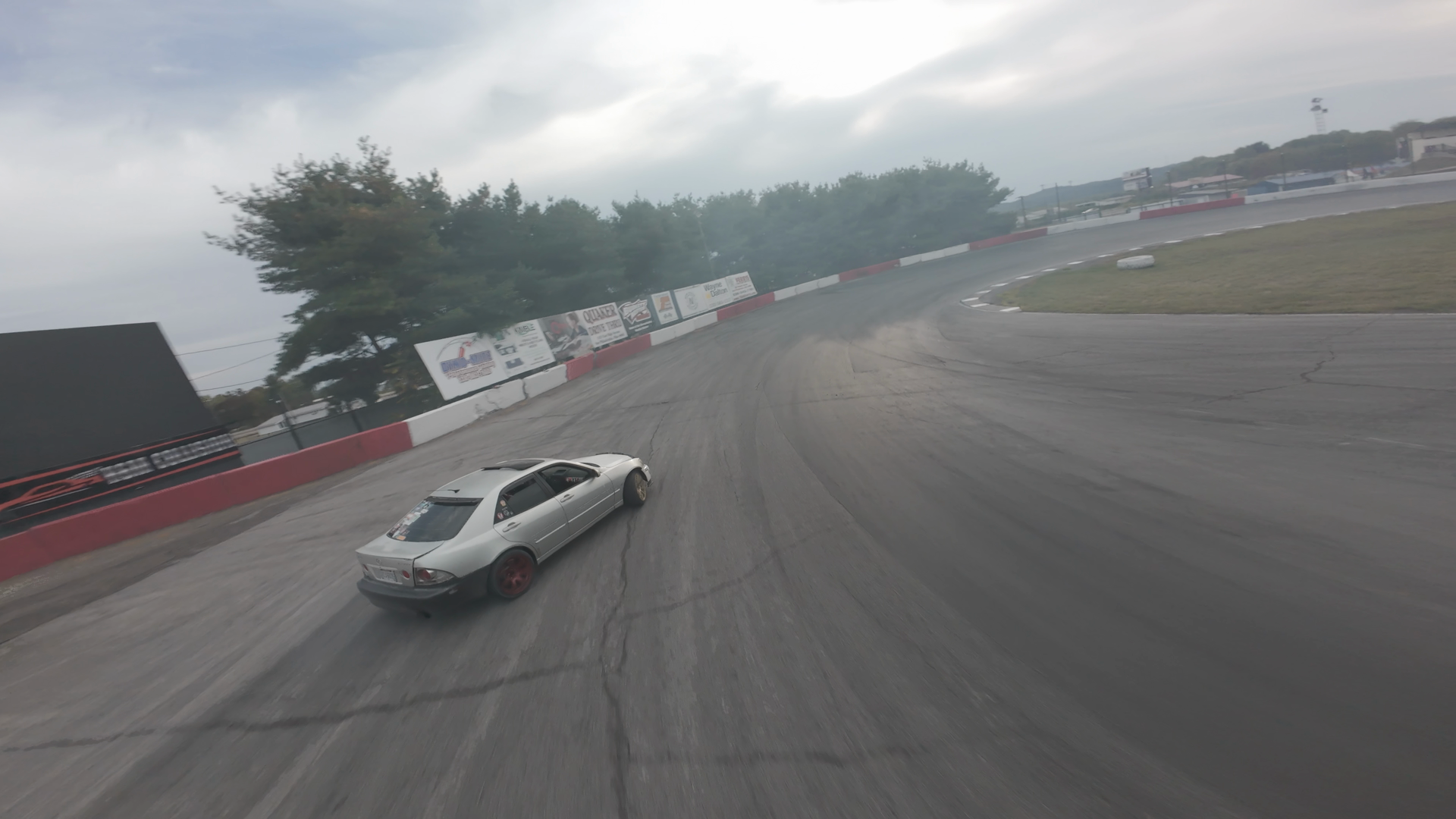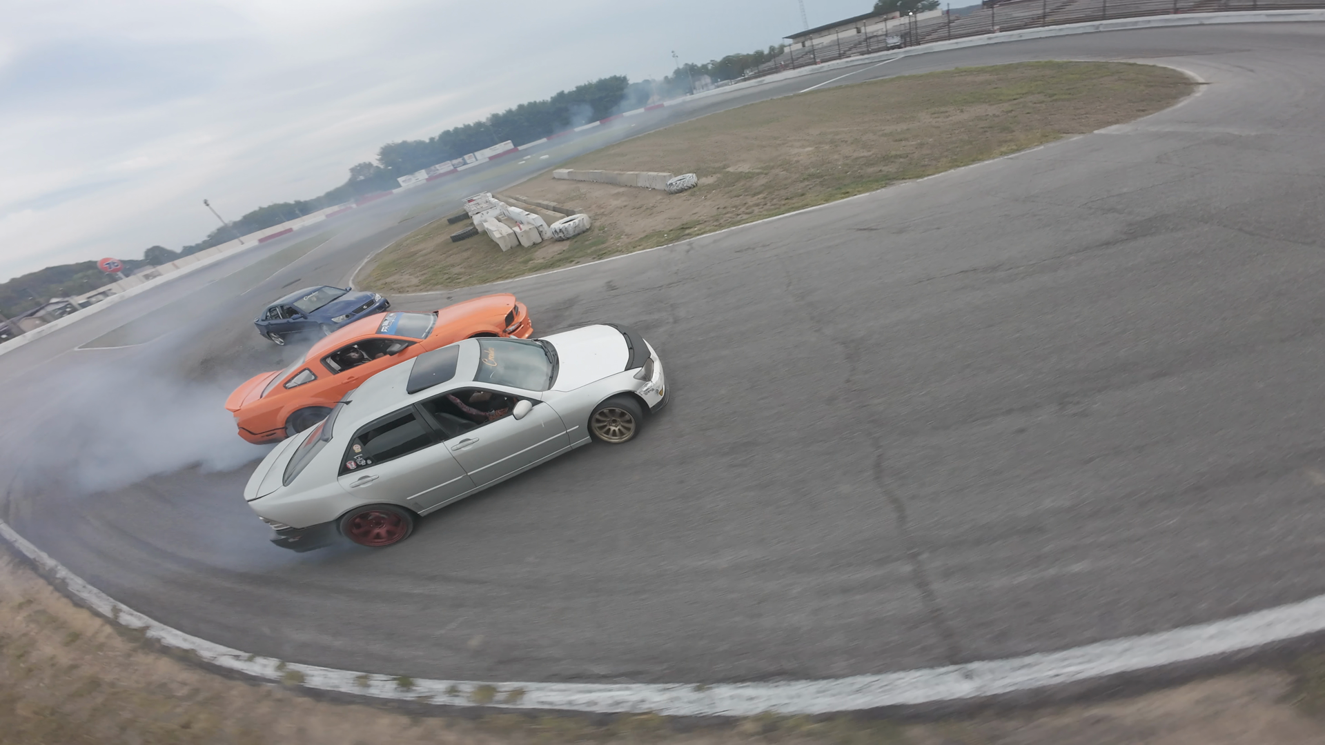 An aerial view ofMidvale Speedway during a Club Loose Drift event. Several racecars are scattered on the track, with one car in the foreground slightly angled to the left. The cars are positioned at various points on the oval track, which curves prominently around the left side. The track is bordered by a red and white barrier, and lush green trees can be seen in the background. Cars are various colors, including white, black, and red. The sky appears overcast, indicating cool or cloudy weather.