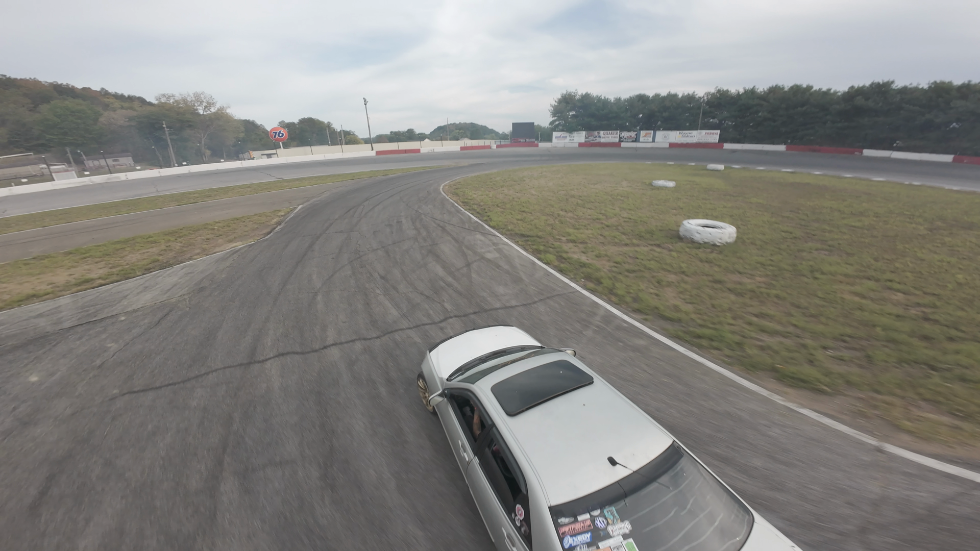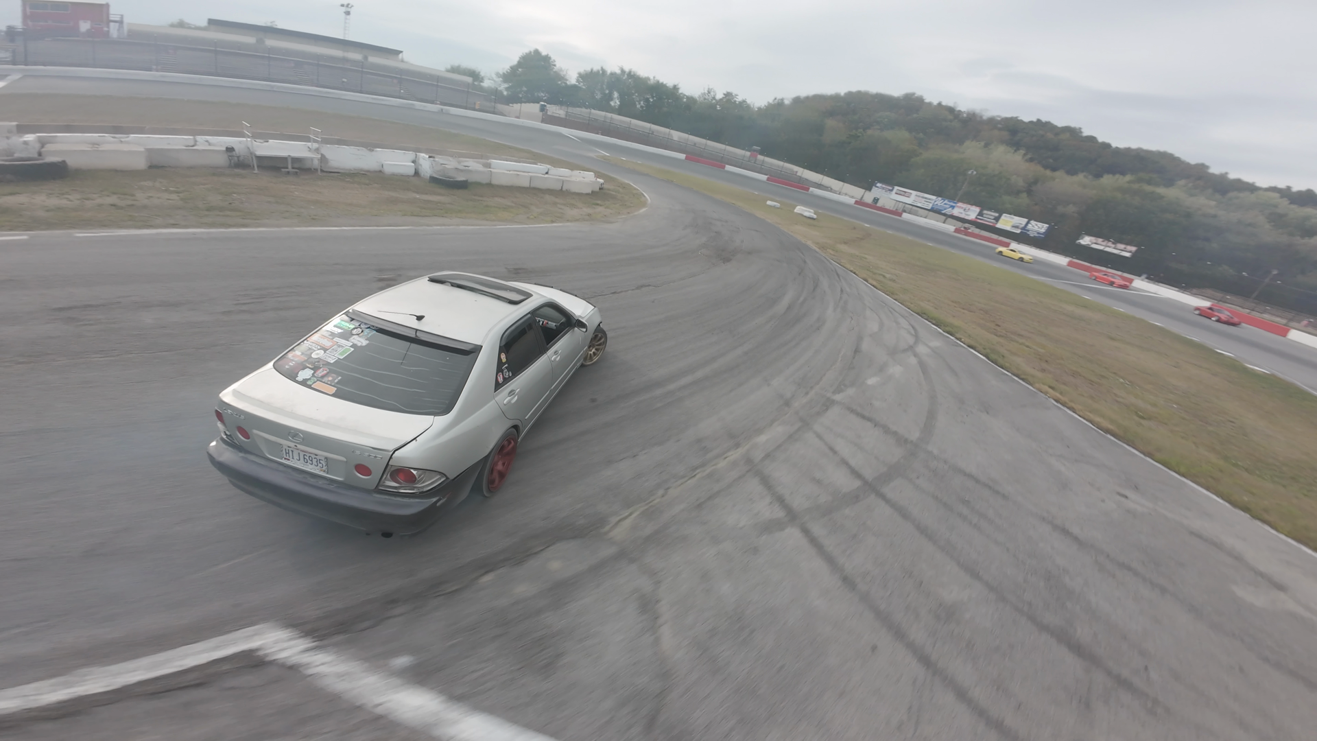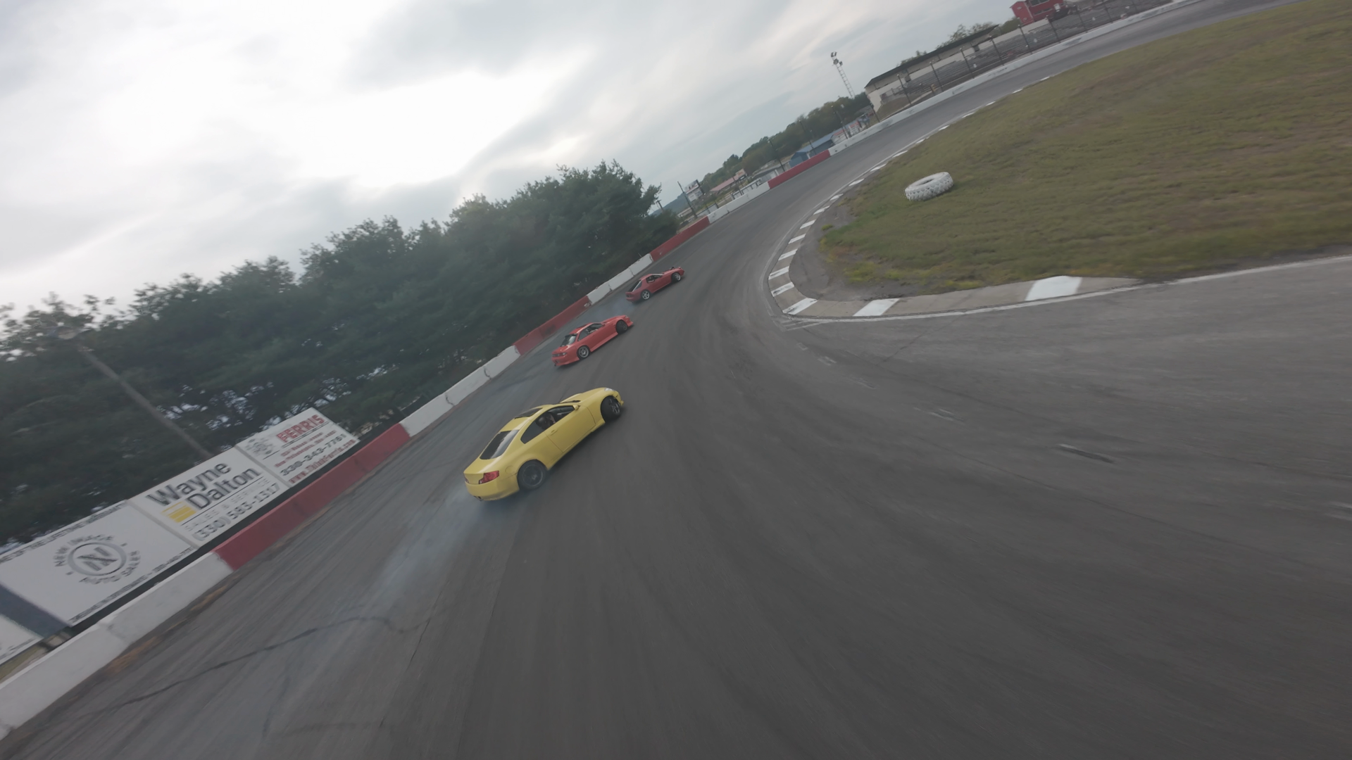 An aerial view ofMidvale Speedway during a Club Loose Drift event. Several racecars are scattered on the track, with one car in the foreground slightly angled to the left. The cars are positioned at various points on the oval track, which curves prominently around the left side. The track is bordered by a red and white barrier, and lush green trees can be seen in the background. Cars are various colors, including white, black, and red. The sky appears overcast, indicating cool or cloudy weather.