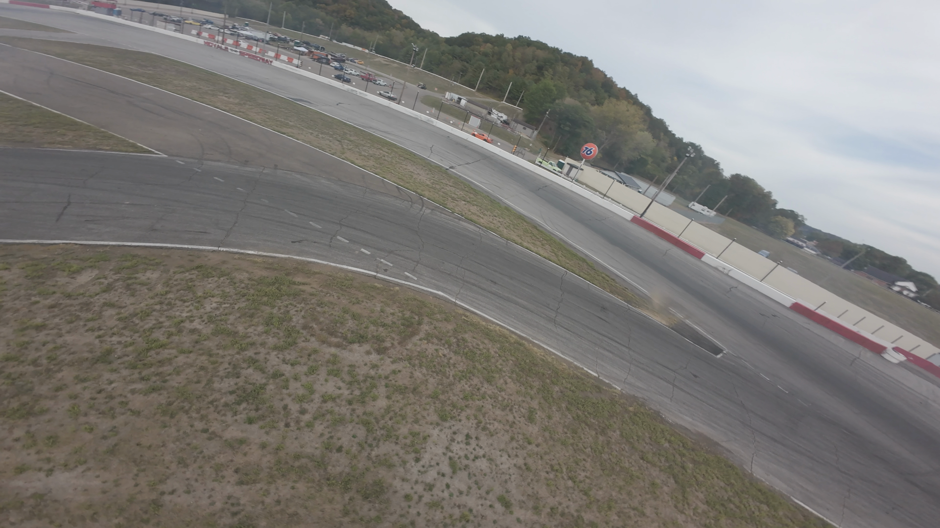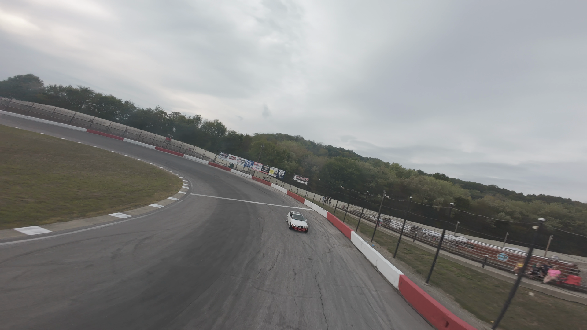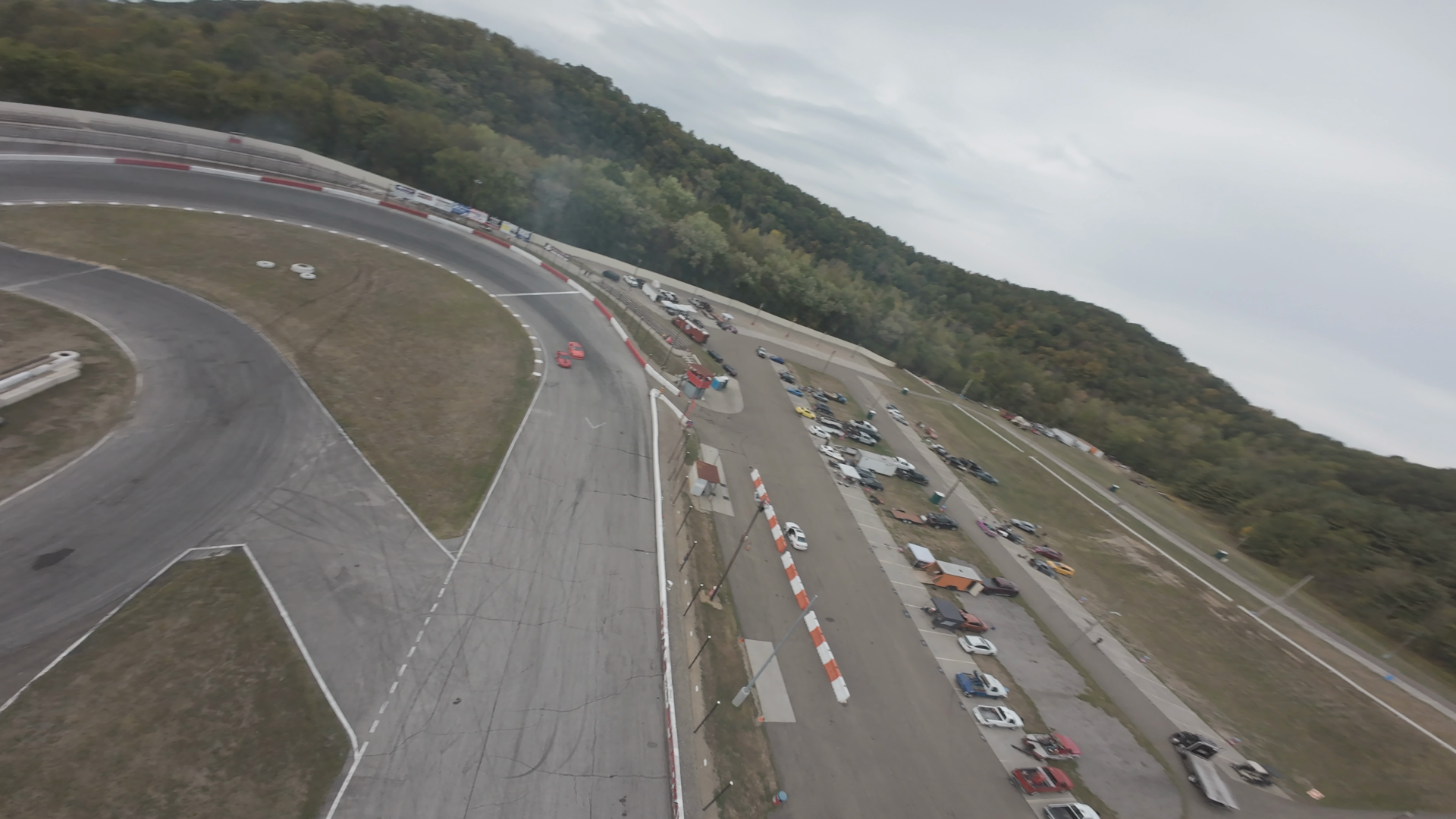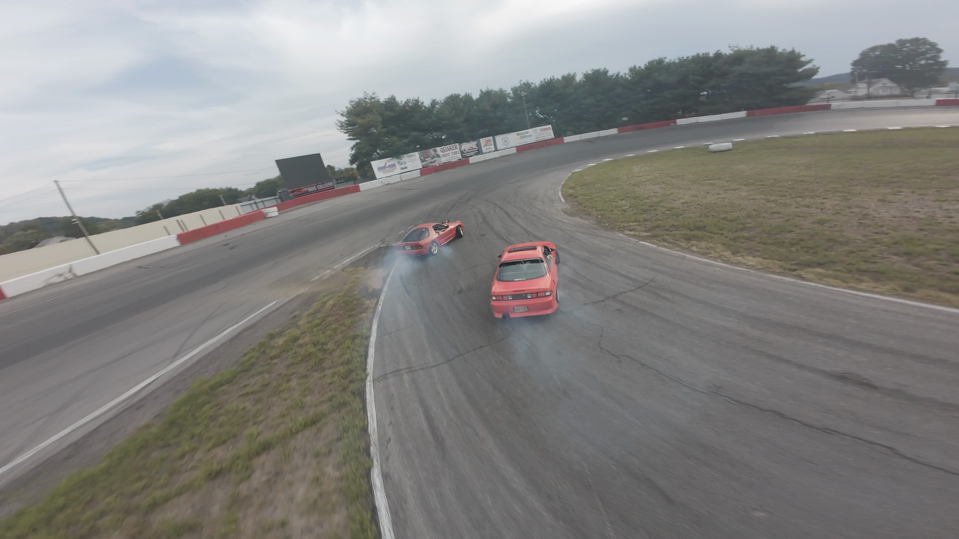 An aerial view ofMidvale Speedway during a Club Loose Drift event. Several racecars are scattered on the track, with one car in the foreground slightly angled to the left. The cars are positioned at various points on the oval track, which curves prominently around the left side. The track is bordered by a red and white barrier, and lush green trees can be seen in the background. Cars are various colors, including white, black, and red. The sky appears overcast, indicating cool or cloudy weather.