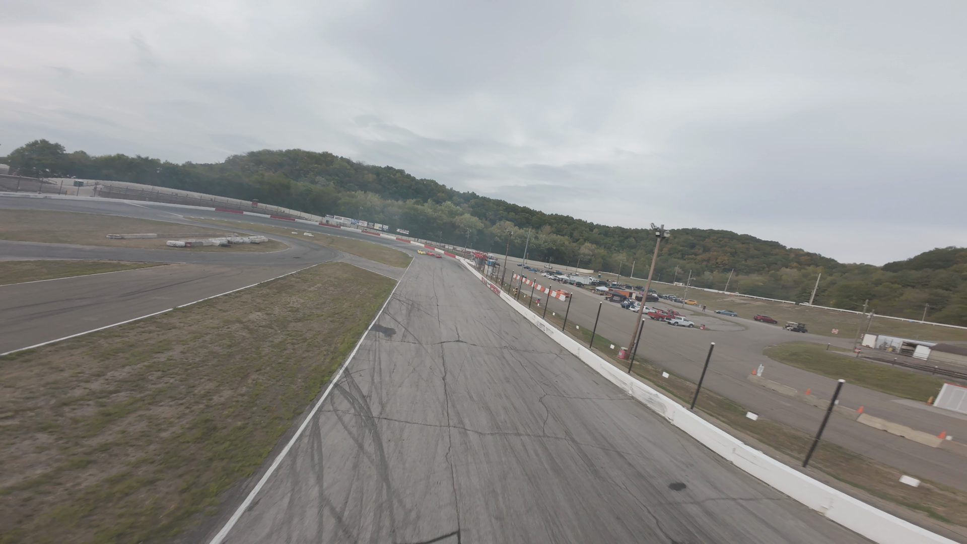 The image shows the interior of Midvale Speedway's starting gate area under an overcast sky. The asphalt is smooth and flat, with safety barriers on either side, painted in alternating white and red. The scene is empty, with no cars or personnel visible, suggesting preparation or downtime. The lighting is soft, possibly due to the cloudy weather, casting minimal shadows. In the distance, part of the stands and some forested trees can be seen on the horizon, indicating a rural location.