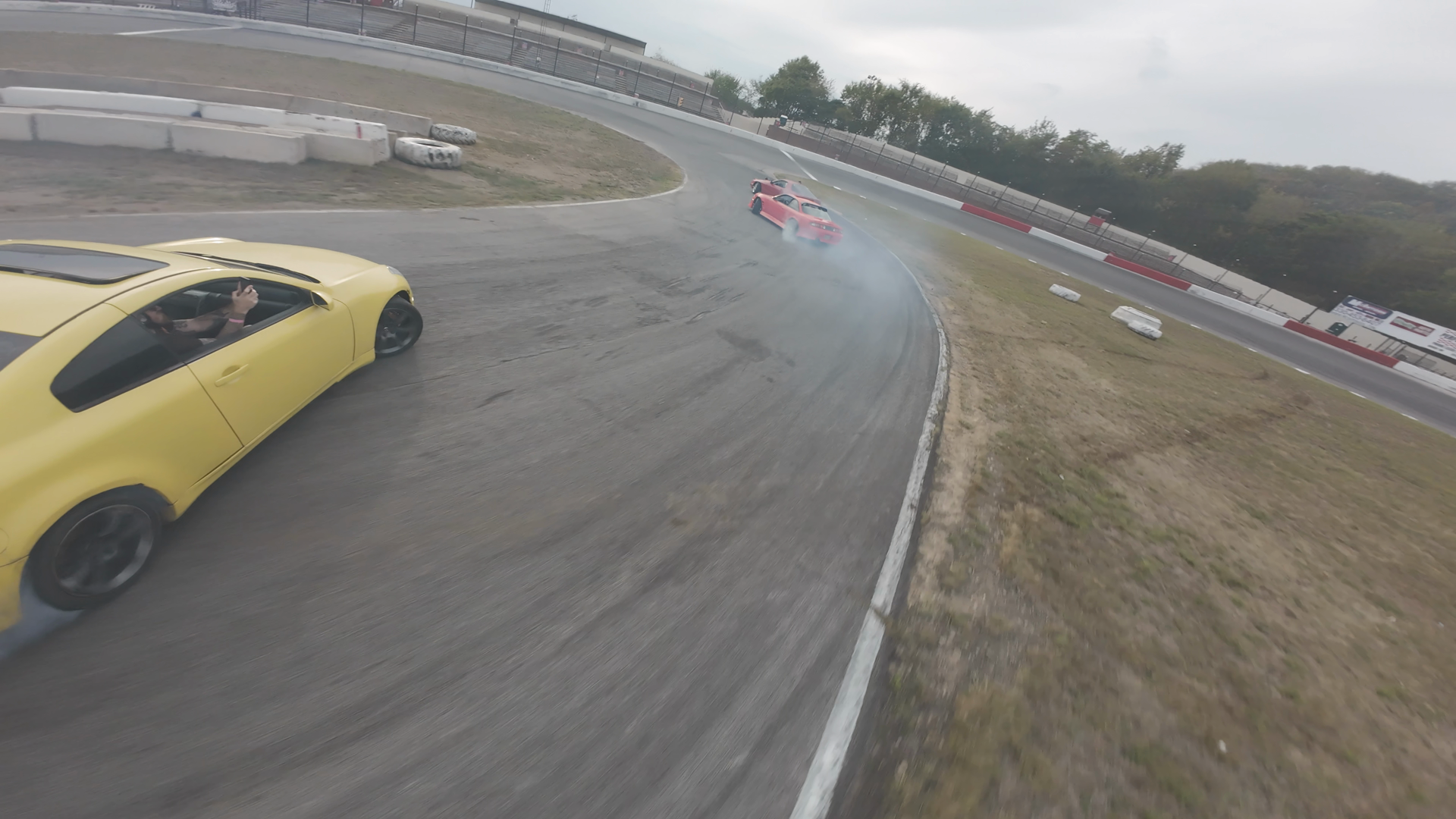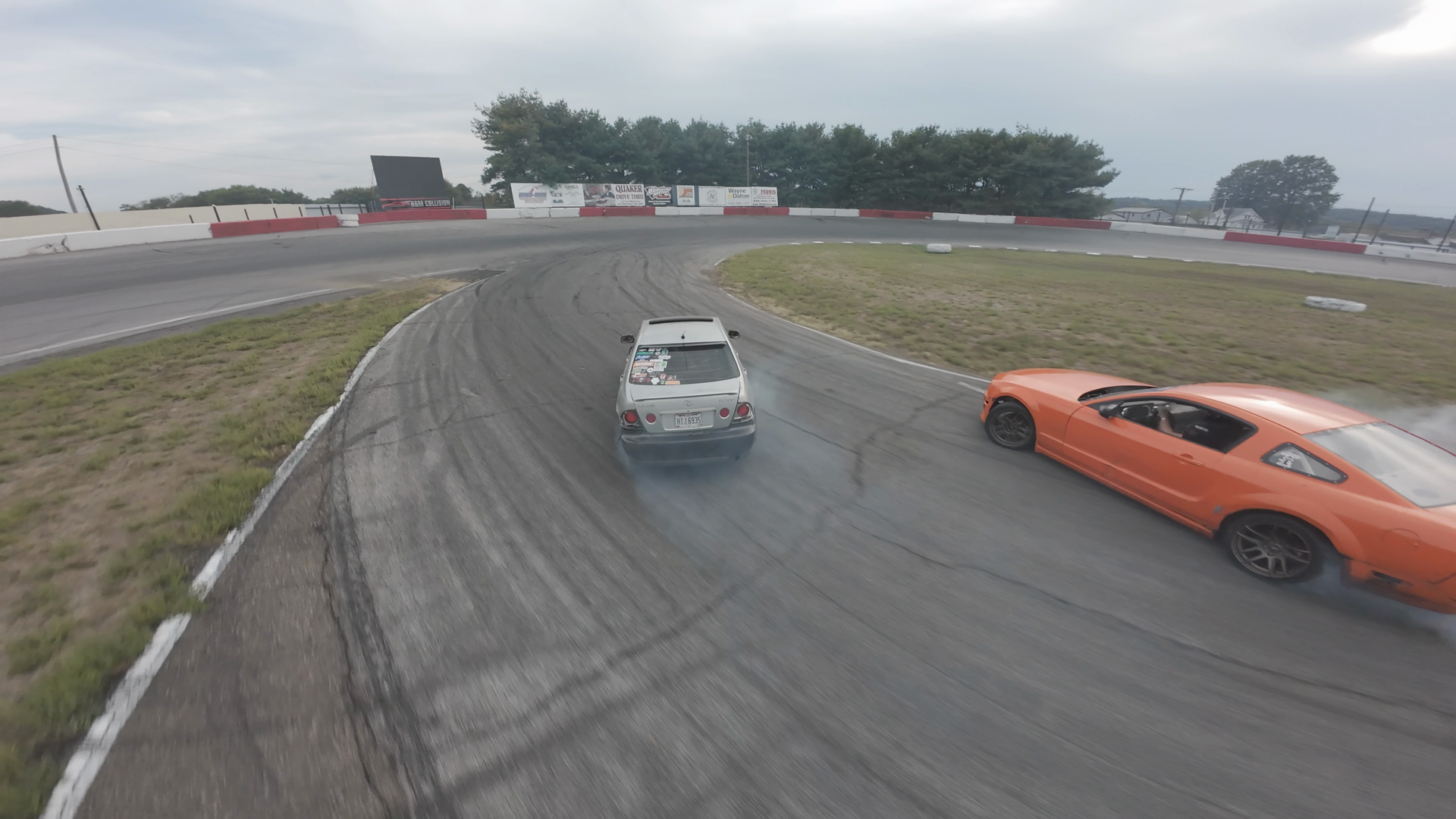 The image shows an aerial view of a drifting race at Midvale Speedway in Ohio. Two cars are visible: a gray sedan in the foreground and an orange sports car trailing slightly behind. Both cars are taking a sharp turn on the track, generating visible smoke from the tires due to their high speed and drifting technique. The gray sedan is closer to the camera and appears to be navigating the track more aggressively, while the orange car, slightly farther from the camera, is maintaining control but at a slower speed. The race track is surrounded by grassy areas and a few safety barriers, indicating a controlled environment for professional or recreational drifting. The presence of various banners in the background suggests sponsorship or event-related activities.