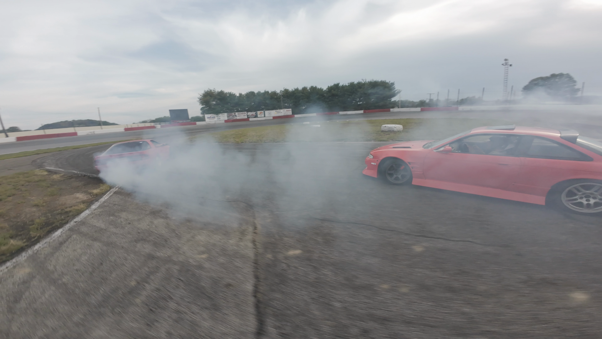 Two red sports cars are engaged in a drift on a racetrack, creating visible smoke from the tires due to the friction. The cars are competing on a paved track bordered by low barriers and vegetation at Midvale Speedway. The track is curved and appears worn, indicating frequent use. The sky is overcast, and the environment looks quiet and focused. The cars are in tight formation as they drift through the turn, demonstrating controlled speed and precision.